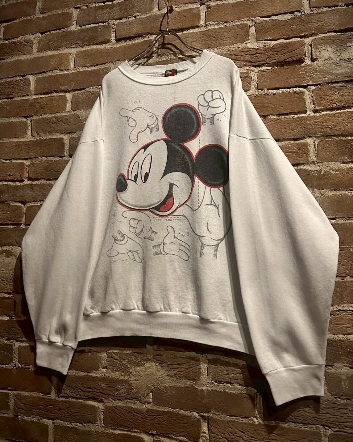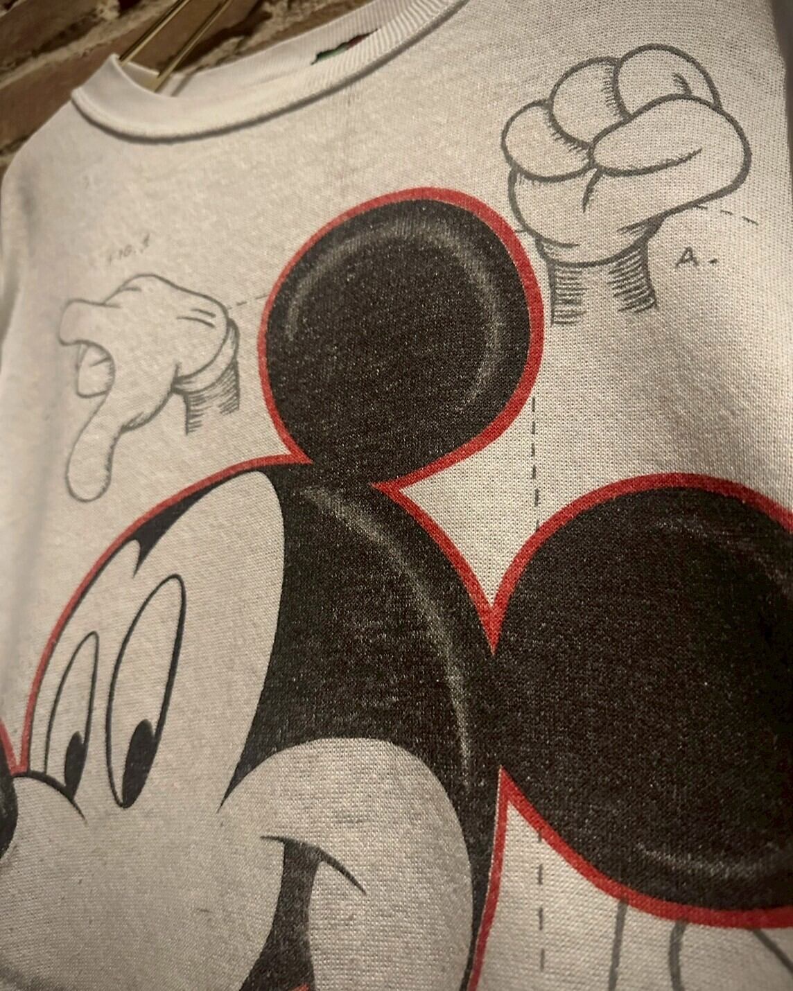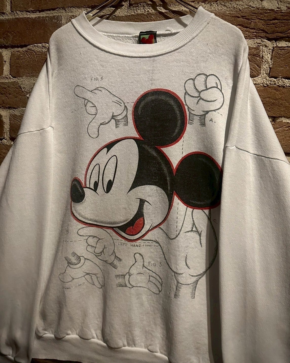 程よく肉感のある白のスウェットボディに、大ぶりなミッキーの顔、4本指のミッキーの様々なハンドサインをプリントで載せたスウェット。