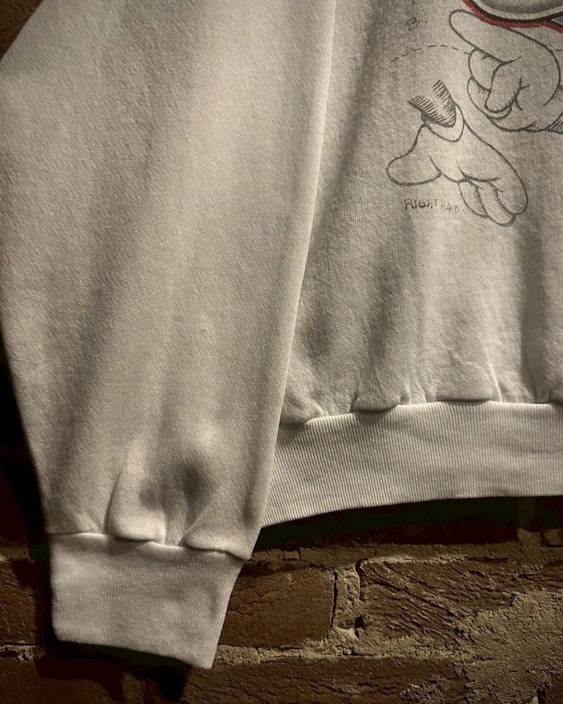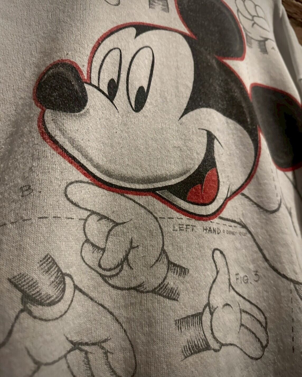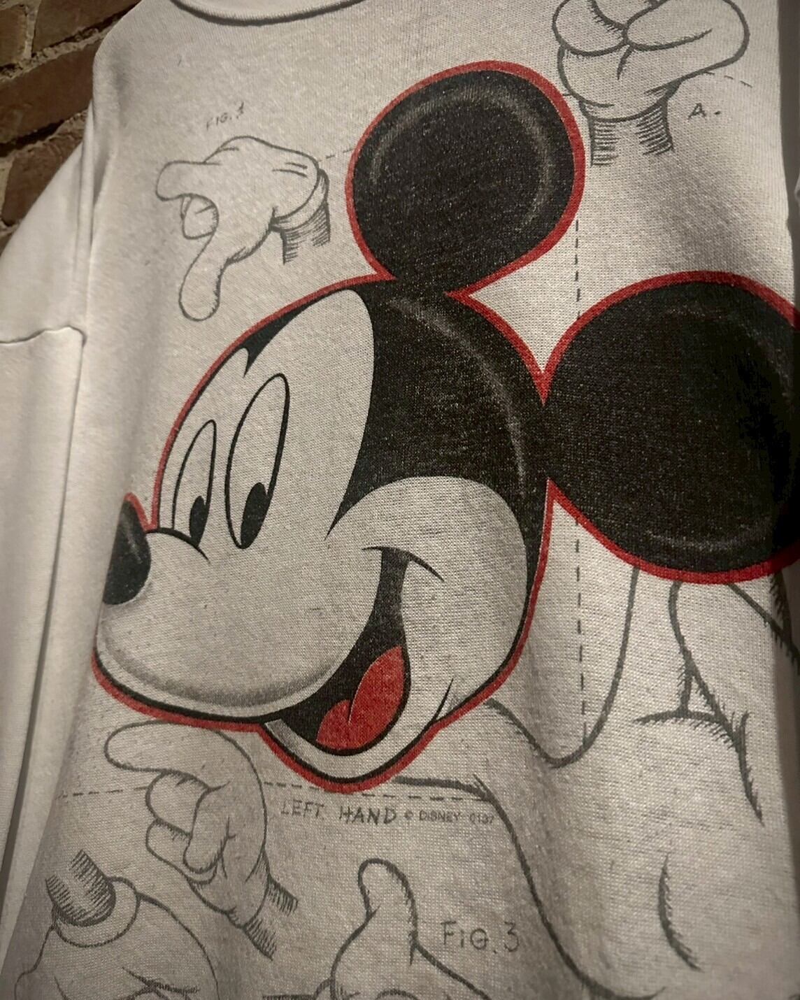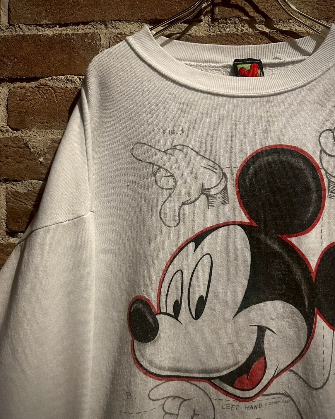 程よく肉感のある白のスウェットボディに、大ぶりなミッキーの顔、4本指のミッキーの様々なハンドサインをプリントで載せたスウェット。