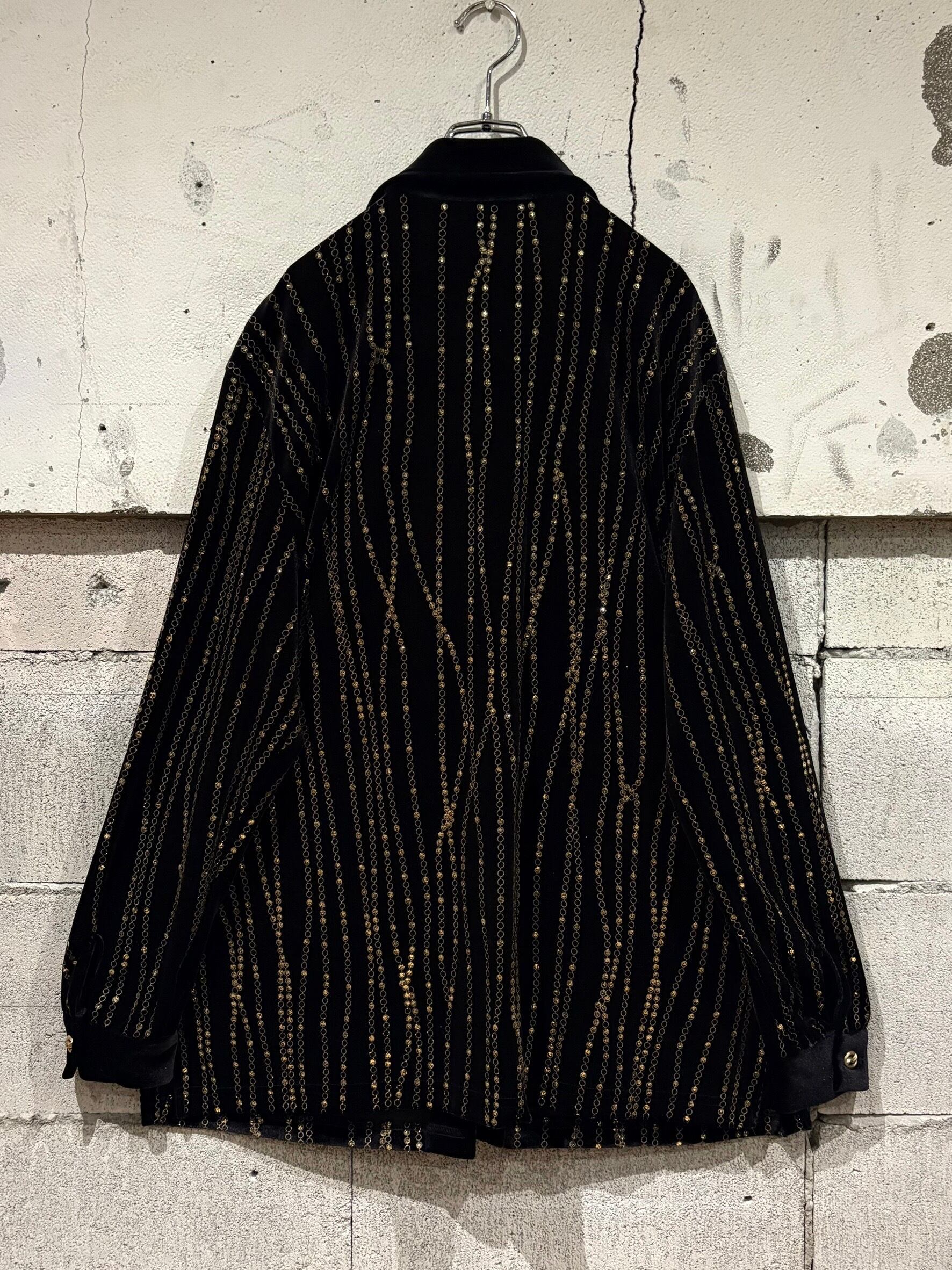 鈍い光沢を放つブラックベロアのボディに、ゴールドのサークルで波状のストライプを載せたシャツジャケット。