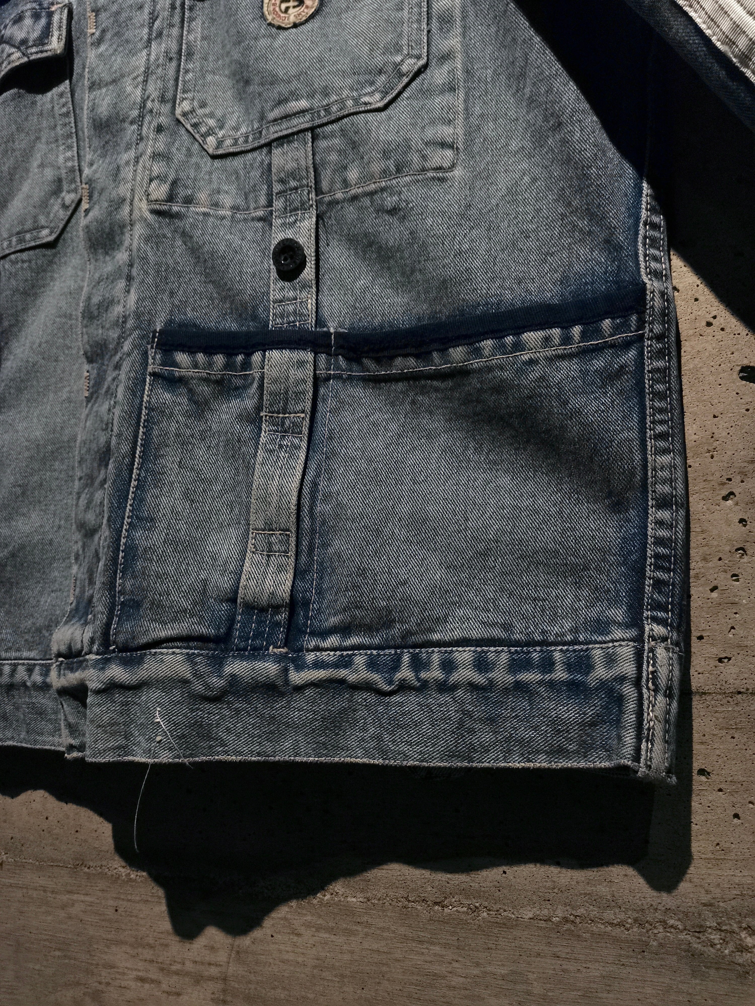ライトブルーのデニムをボディに用い、フロントにマルチなポケットデザインを施し、高いデザイン性と機能性が生み出された1着。