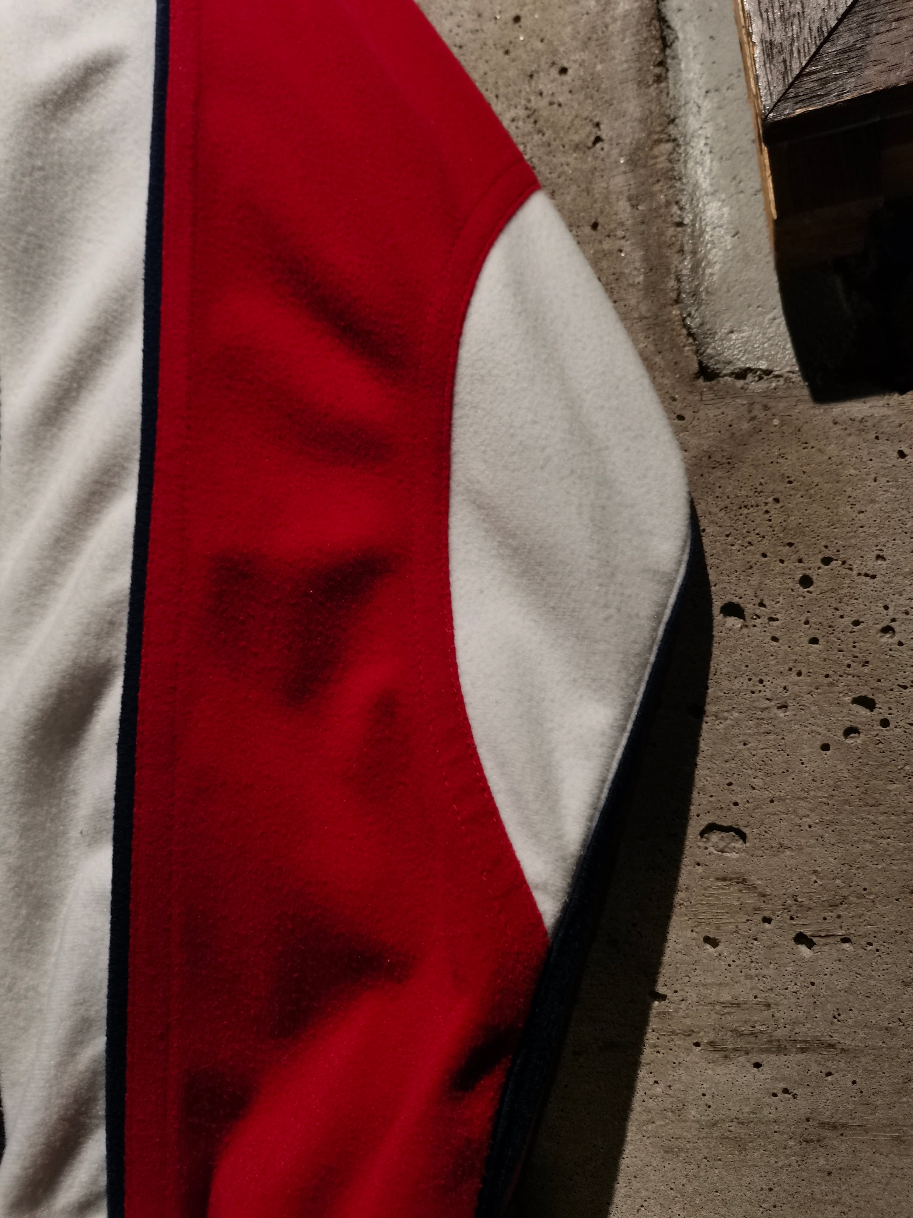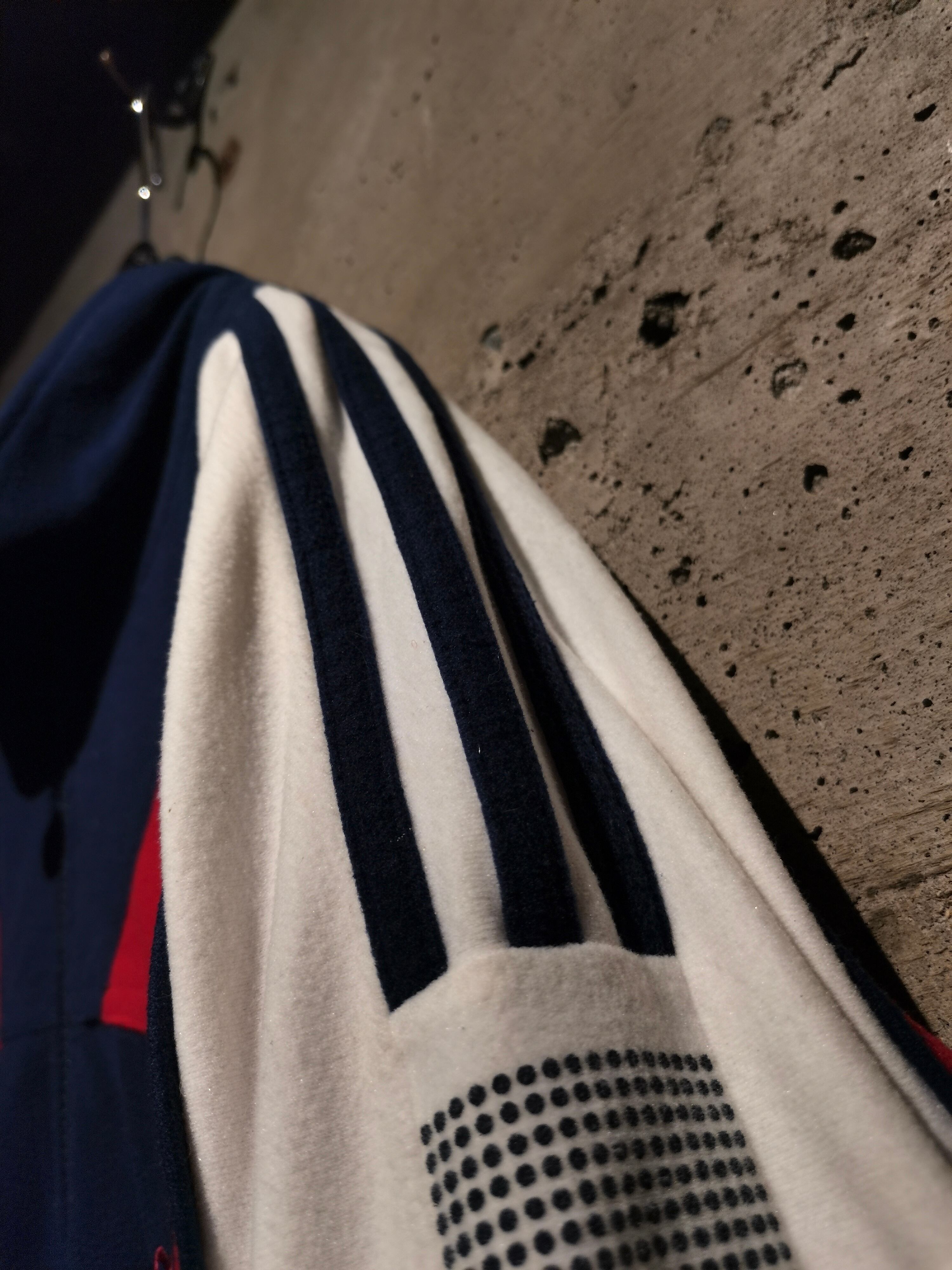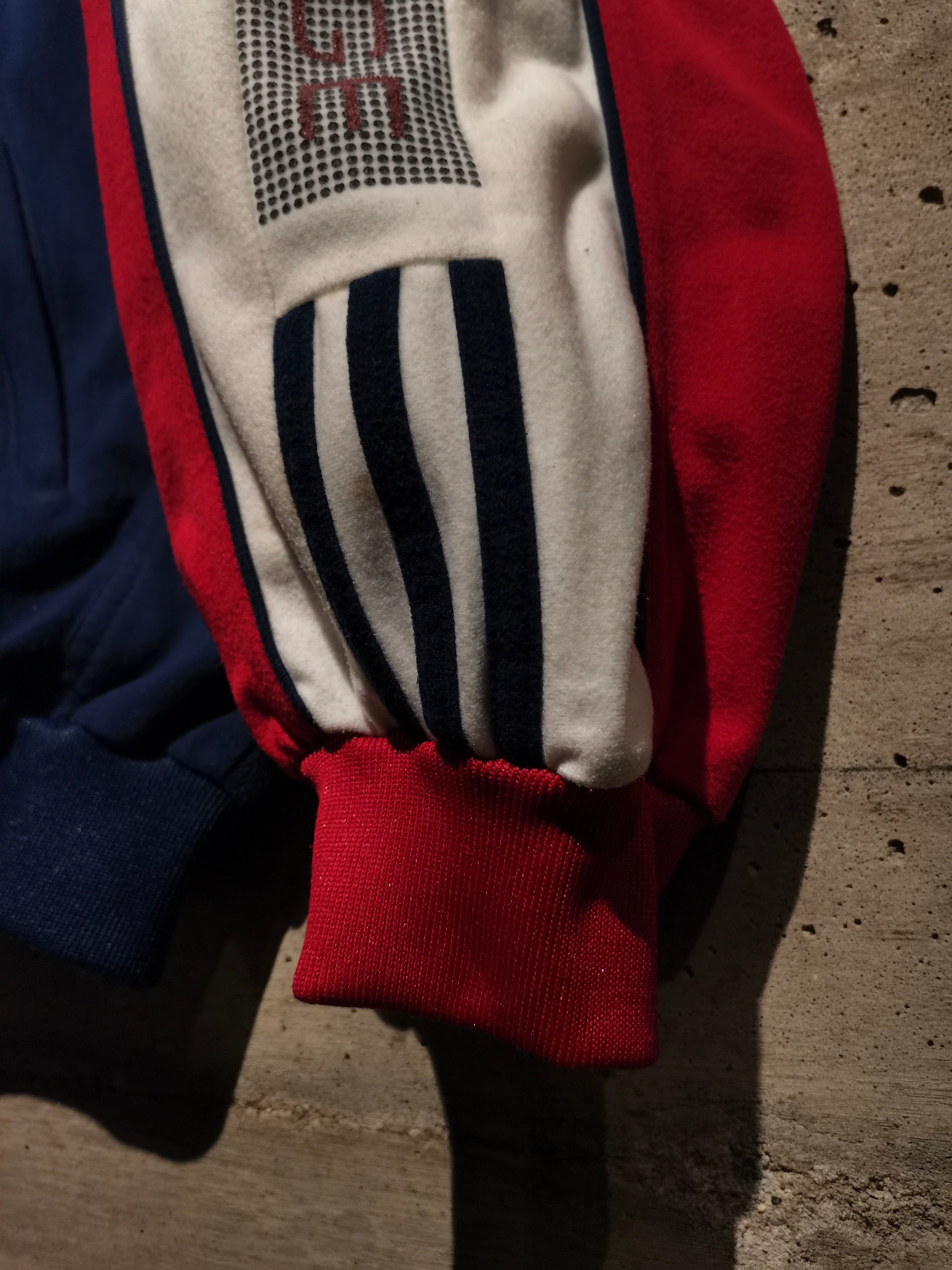 いわゆるジャージ素材では無く、"ベロア調"のピーチスキン素材を用い、ネイビーをベースに赤、白の配色で仕上げたユーロヴィンテージの稀少モデル。