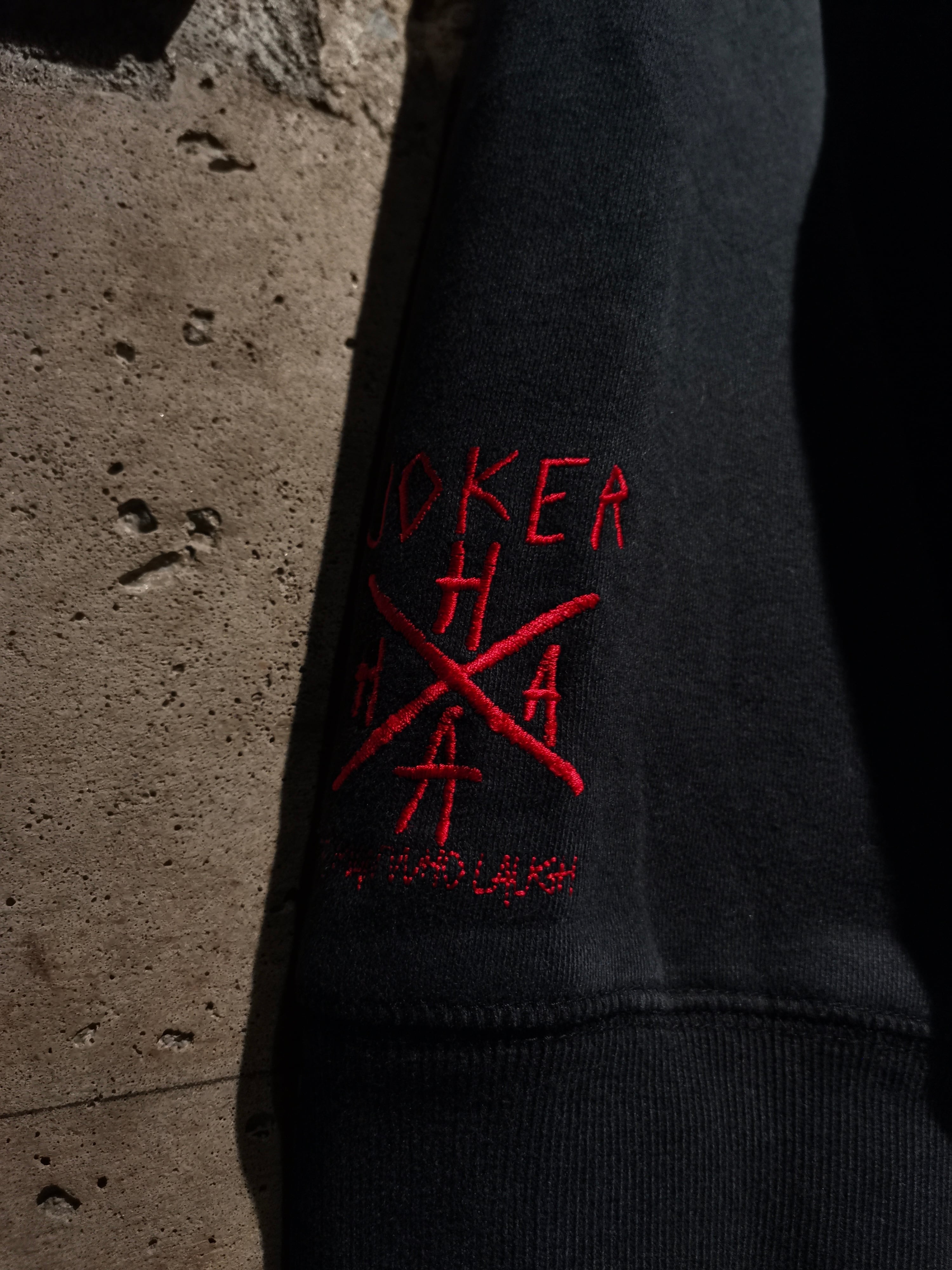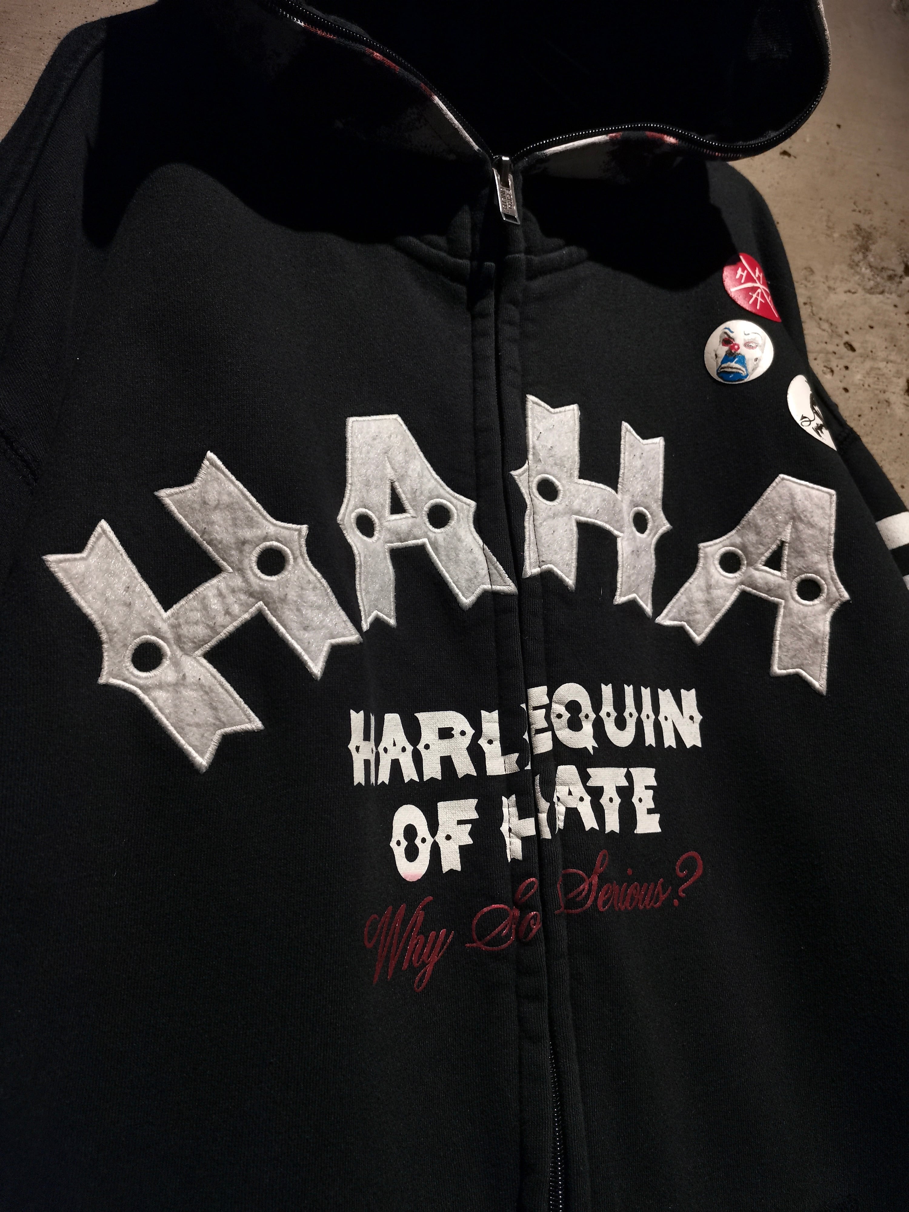 フロント中央には彼の特徴的な笑い方を表した"HA HA"の文字の刺繍に加え、ニックネームである"HARLEQUIN OF HATE"、劇中の彼の印象的なセリフの1つ"Why So Serious"をプリント。