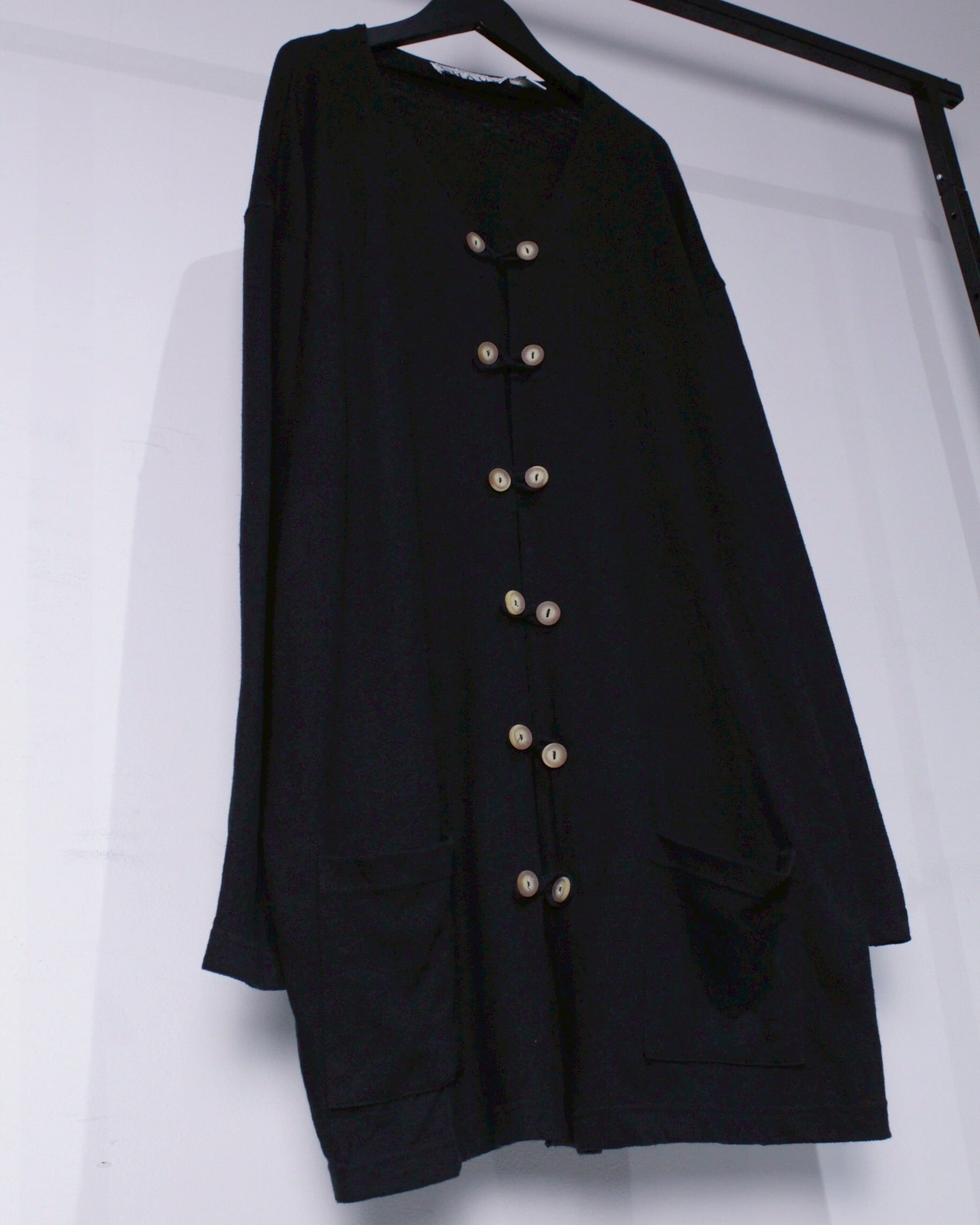 6連のフープボタンの仕様になっており、羽織りライクにサラッと着用していただけます。あえて下のボタンを開けてインナーをチラつかせたりと、ファッションの幅を広げてくれる1着です。