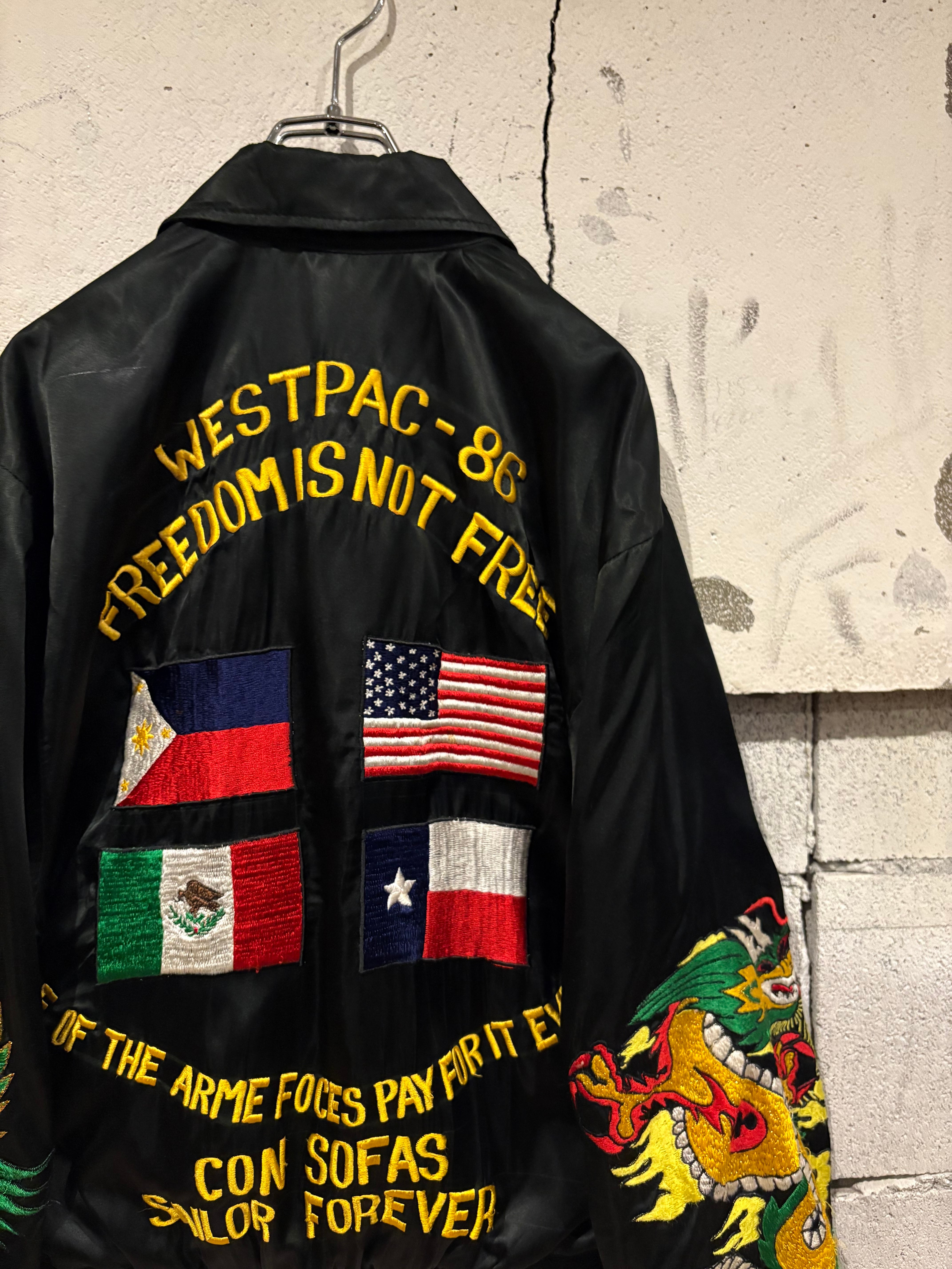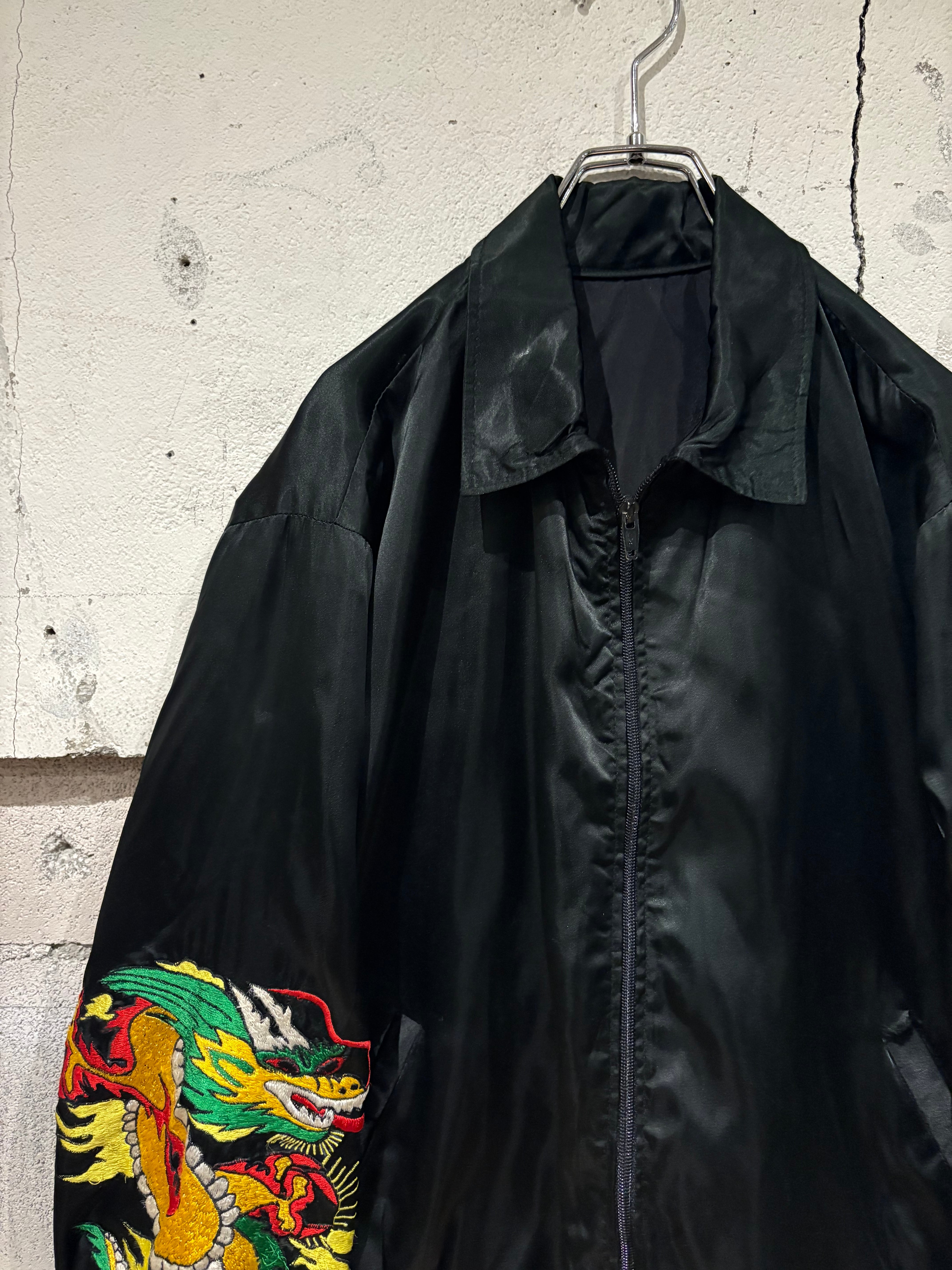 ツルッと滑らかなブラックのボディに、両腕には龍、背面には国旗を刺繍で刻んだスーベニアジャケット。