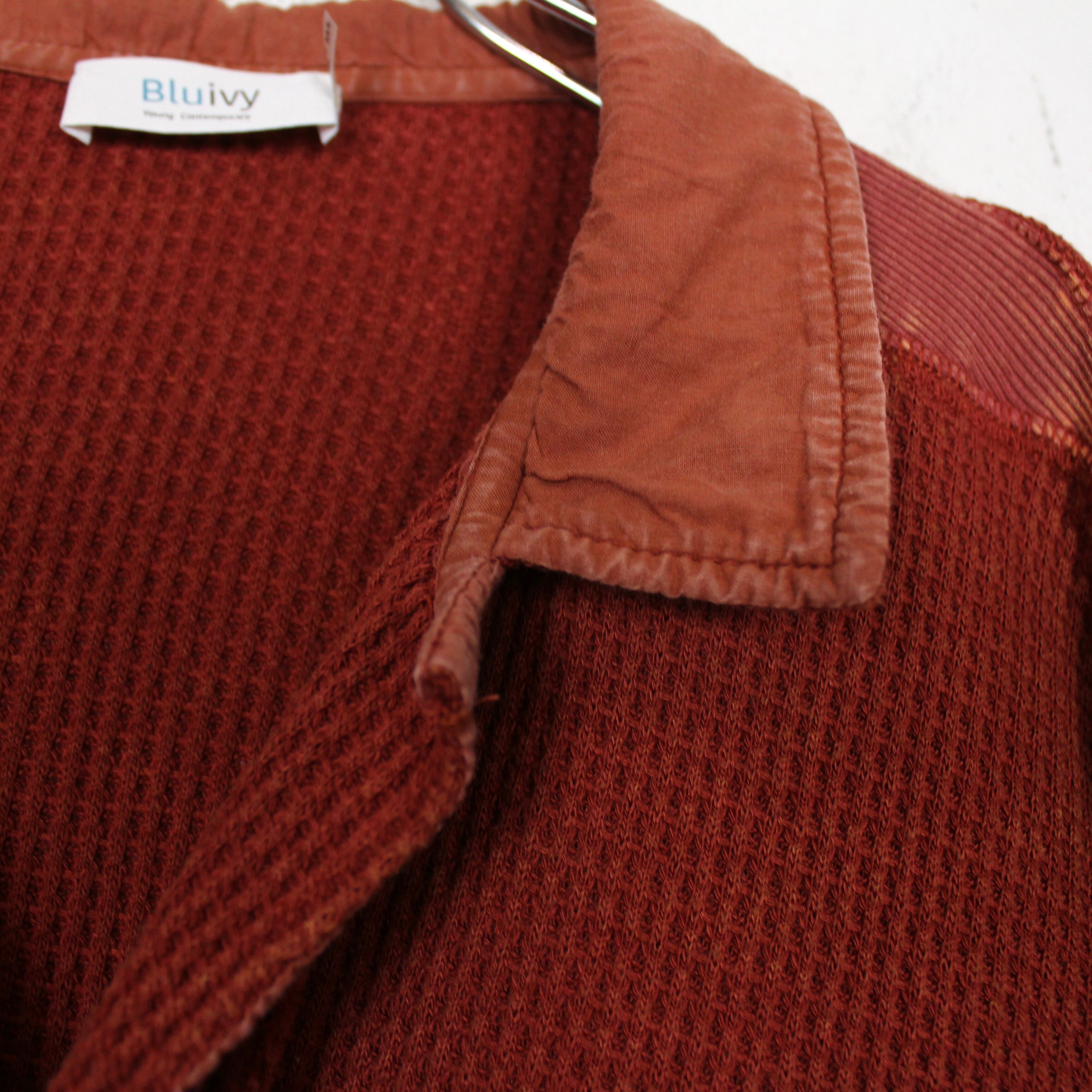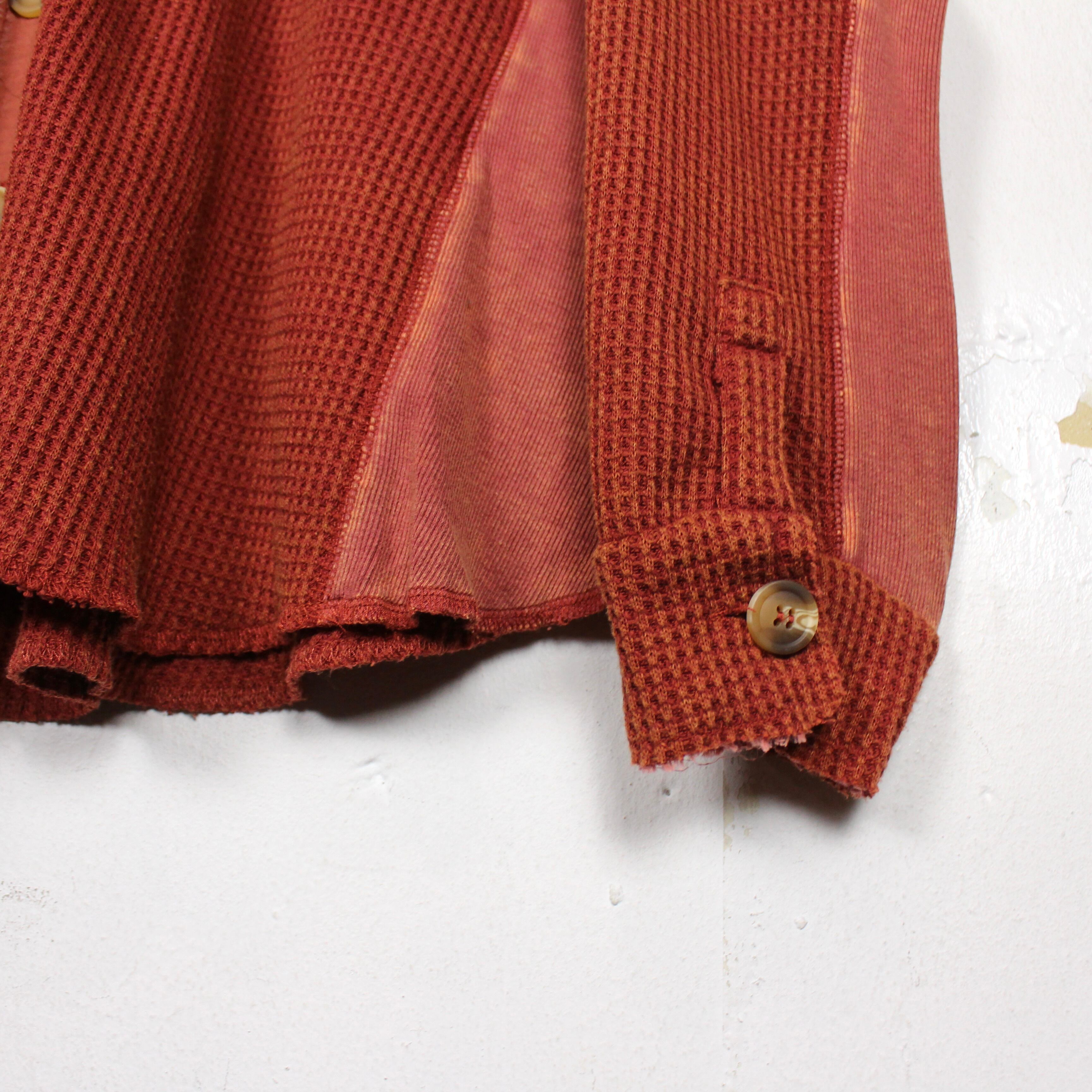 フロントのカットオフ風のデザイン、べっ甲調のボタンがアクセントに。そしてワッフル地の凹凸のある生地感により、全体との配色も相まって柔らかな表情を演出。肌触りも非常〜に良く、デザインのみならず着心地にも優れた仕上がりに。