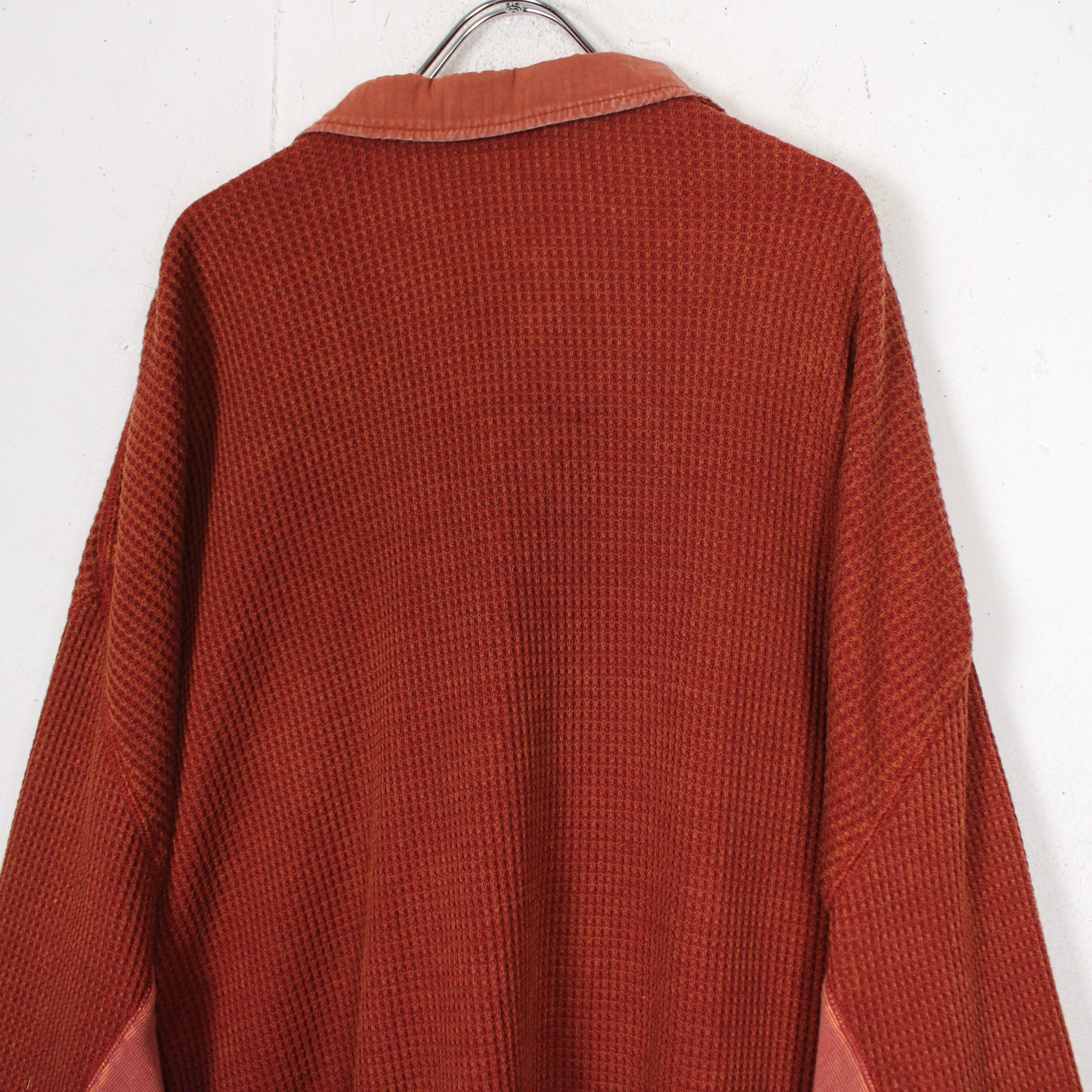 空気を含んだフワッとしたワッフル地のボディに、襟や比翼、フロントフラップにプレーンな生地を、ボディサイドからアームにかけてリブの切り替えを施した、テキスタイルで遊びを効かせた長袖シャツ。