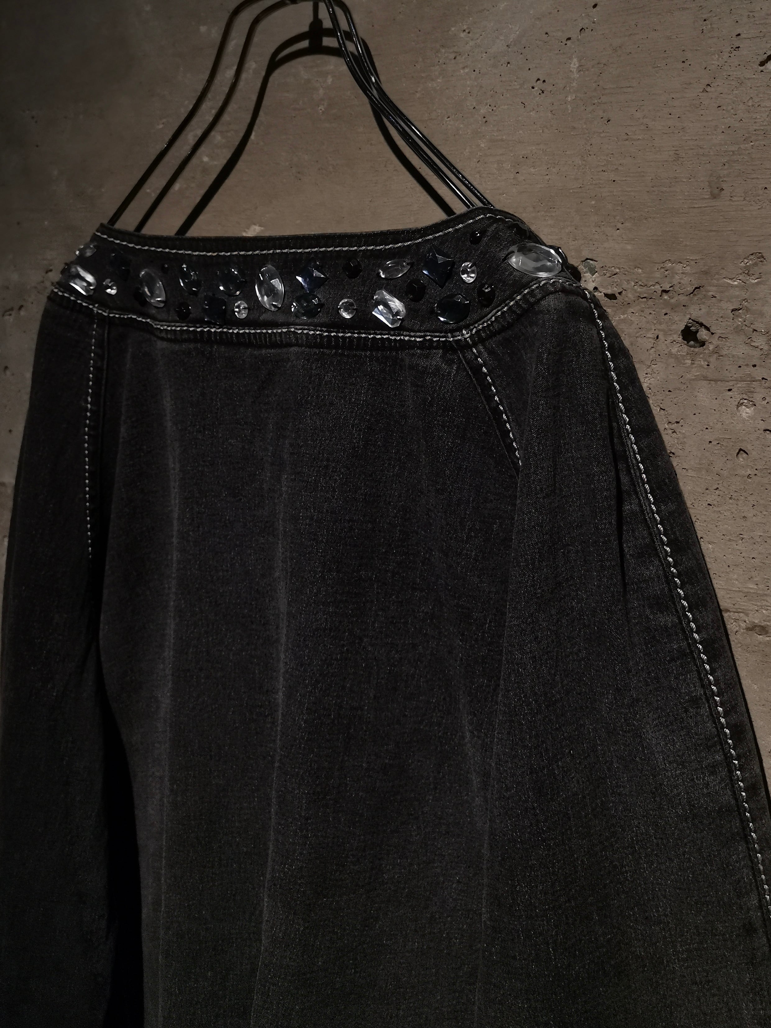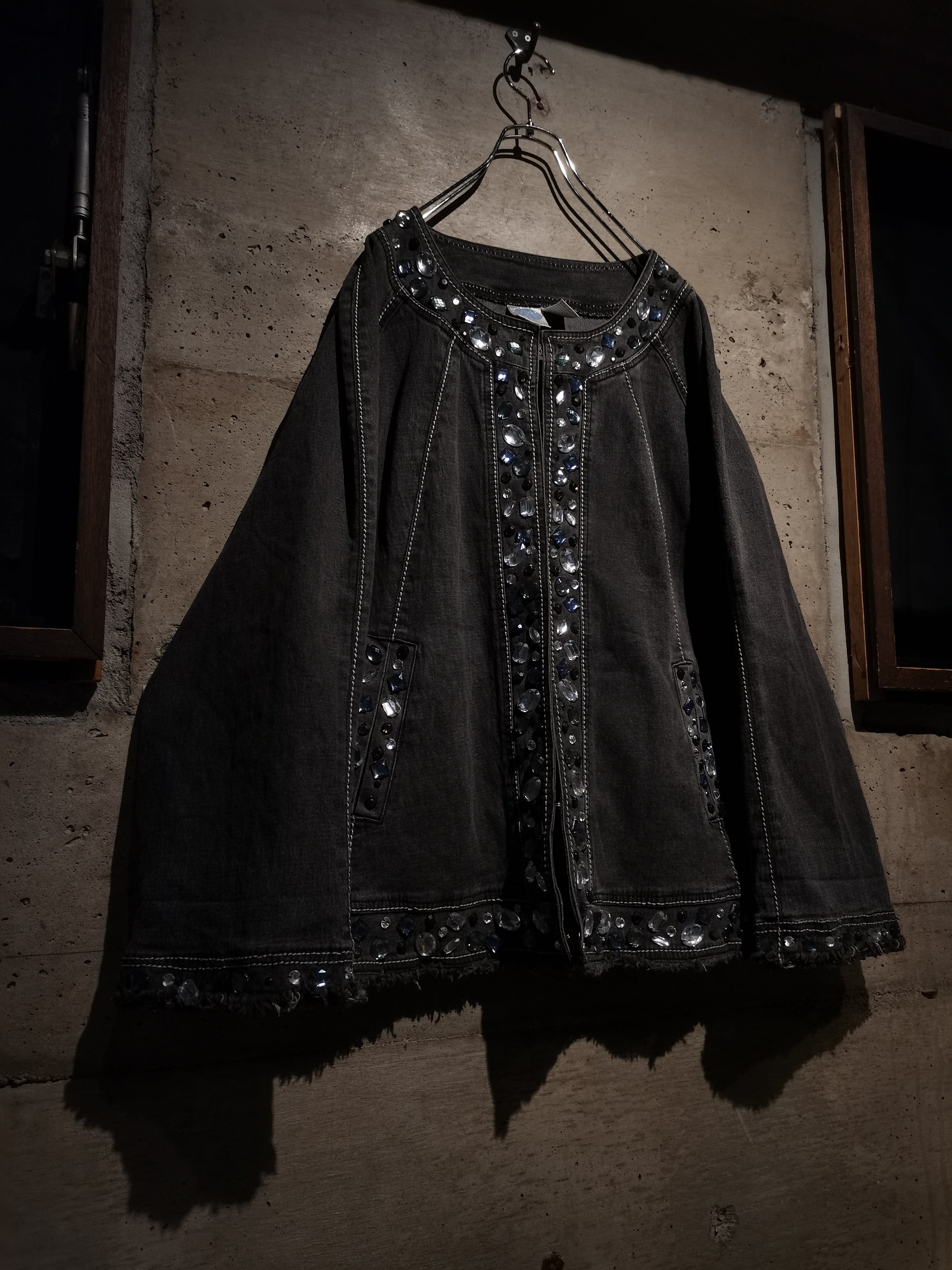 裾と袖口は切りっぱなしのようになっており、フリンジ状に。素材感特有のフェード感とビジューの高級感のあるデザインが相まったミックス感のある素晴らしいデザインバランスに仕上がっています。