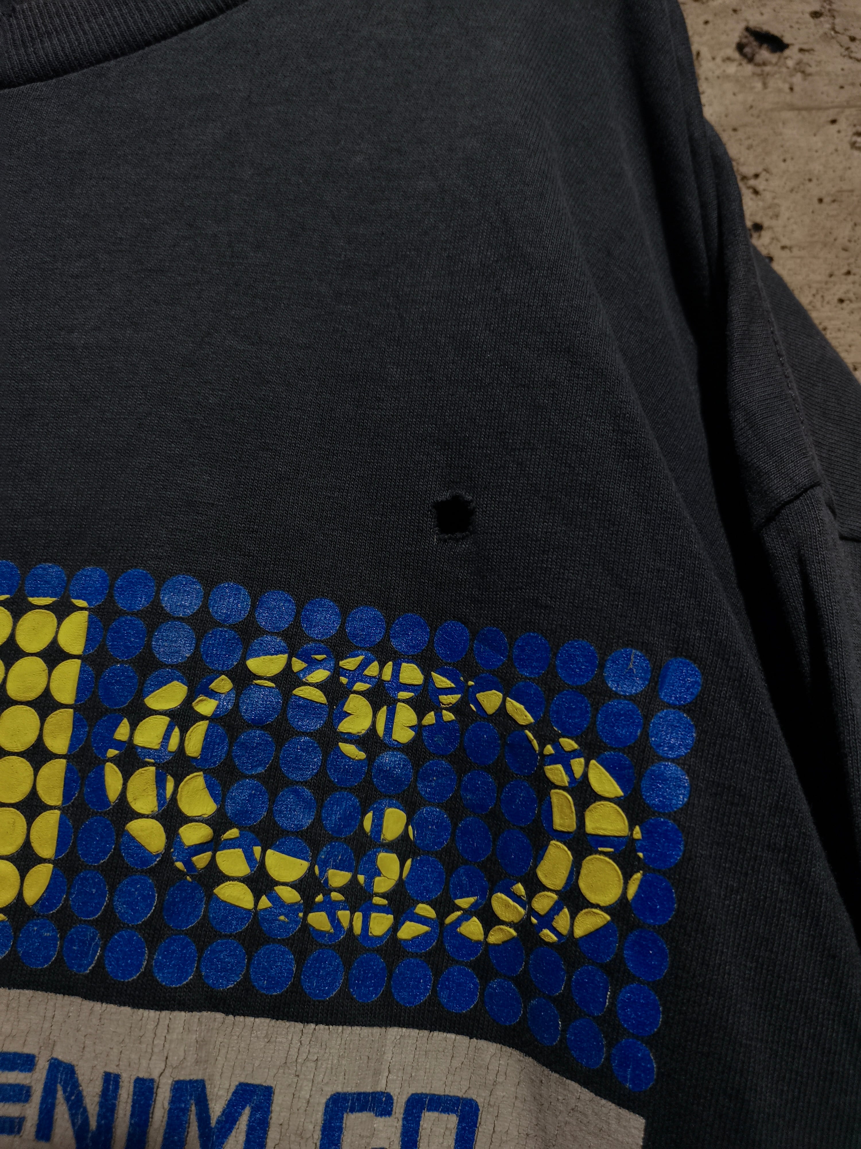 フェードの効いたネイビーカラーのボディをベースに、フロント、右アーム、背面にそれぞれブランドロゴをプリントしたロンティー。