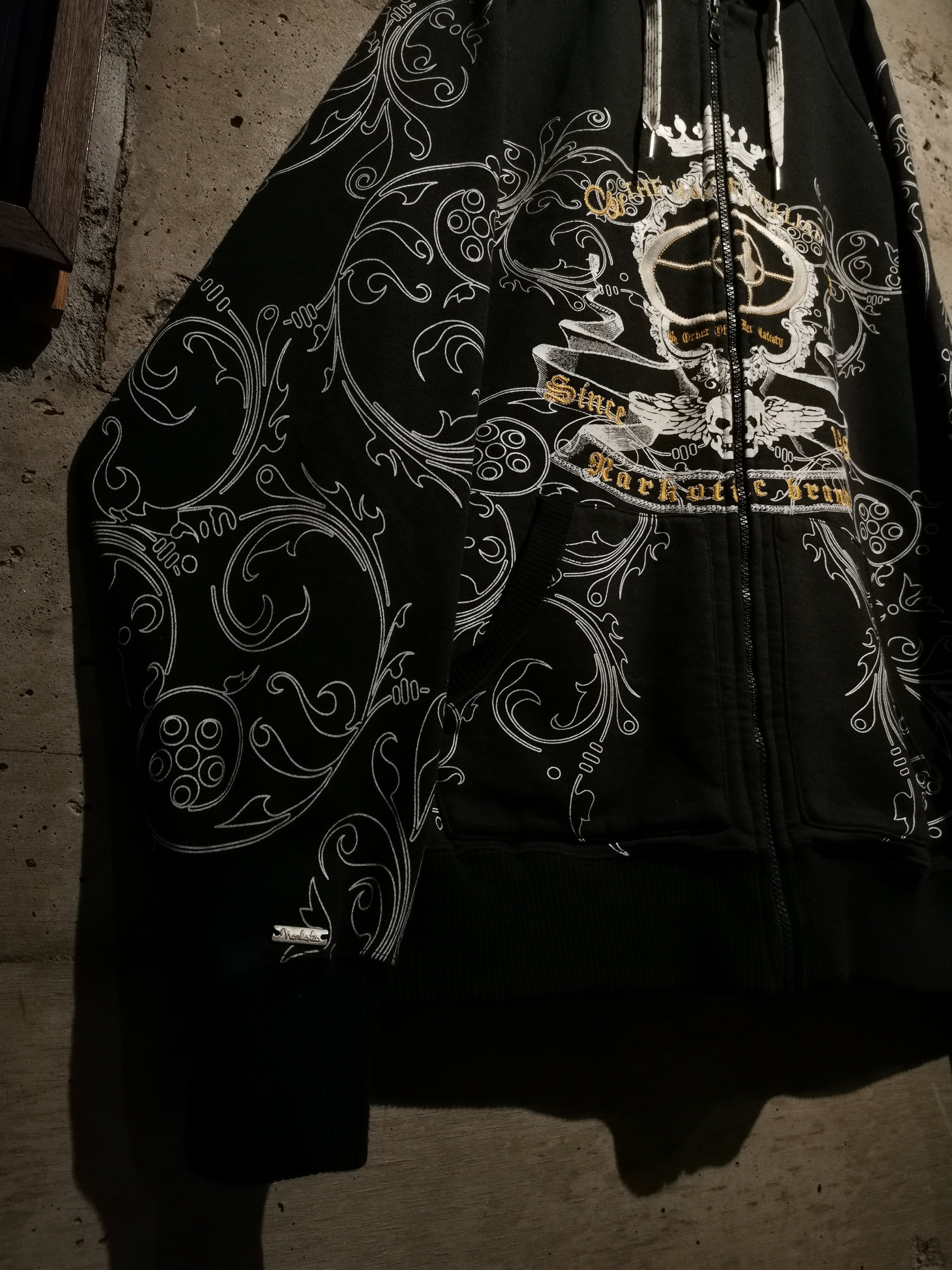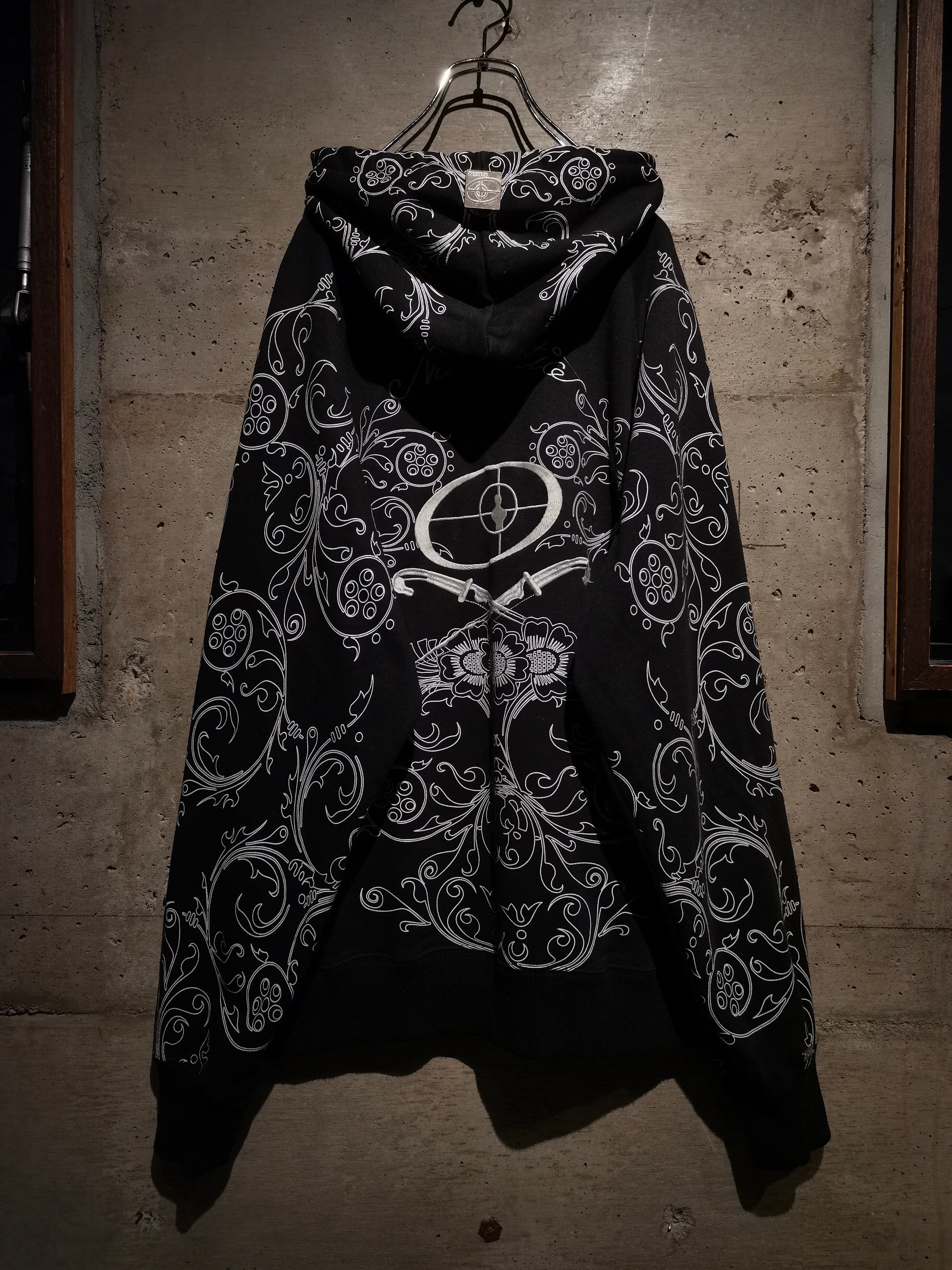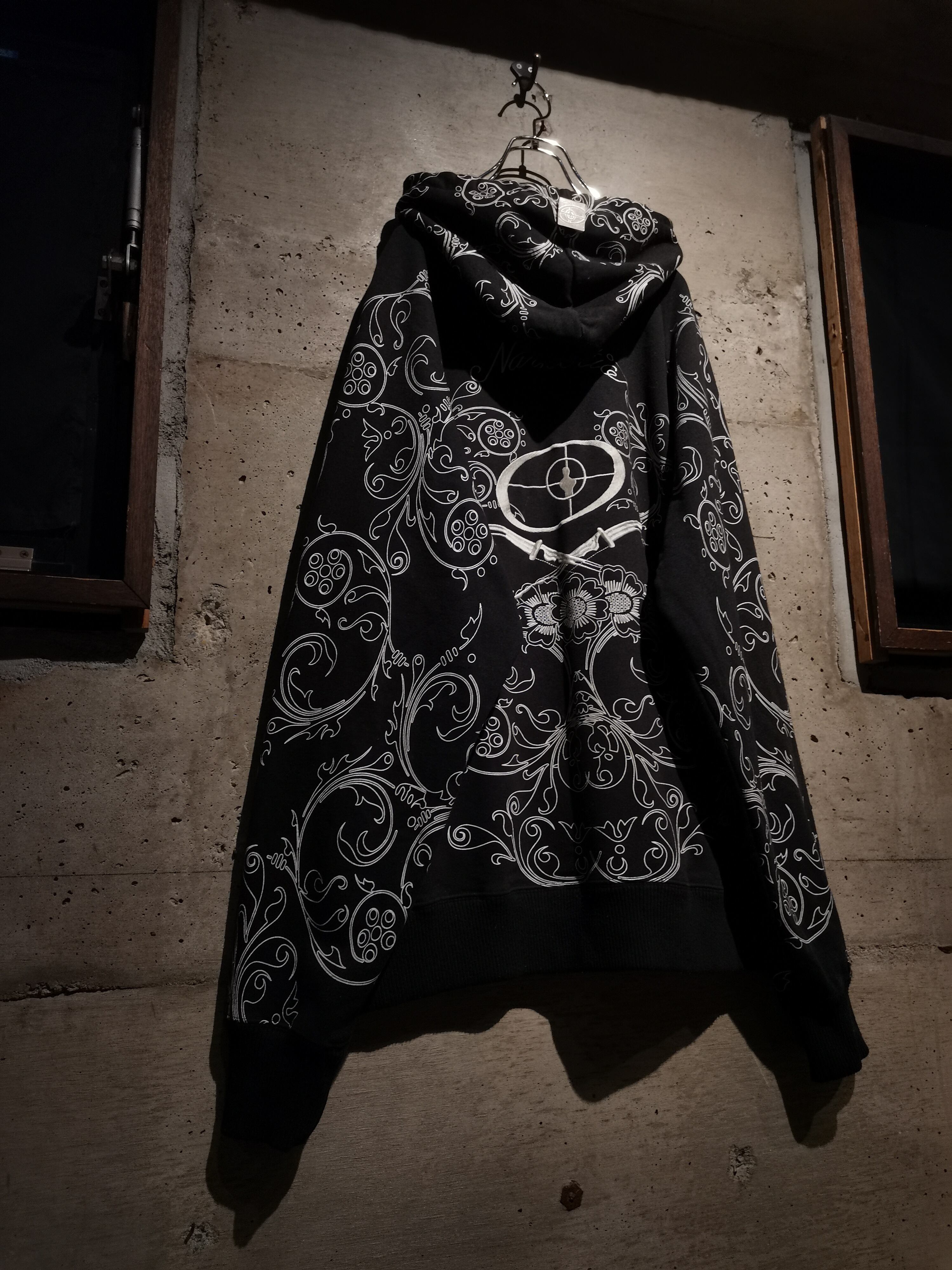 肉感のあるブラックのボディをベースに、プリントでボタニカル柄を、刺繍でブランドのロゴ等を載せたジップアップフーディ。フーディでこの手のアプローチのデザインは珍しいですね。