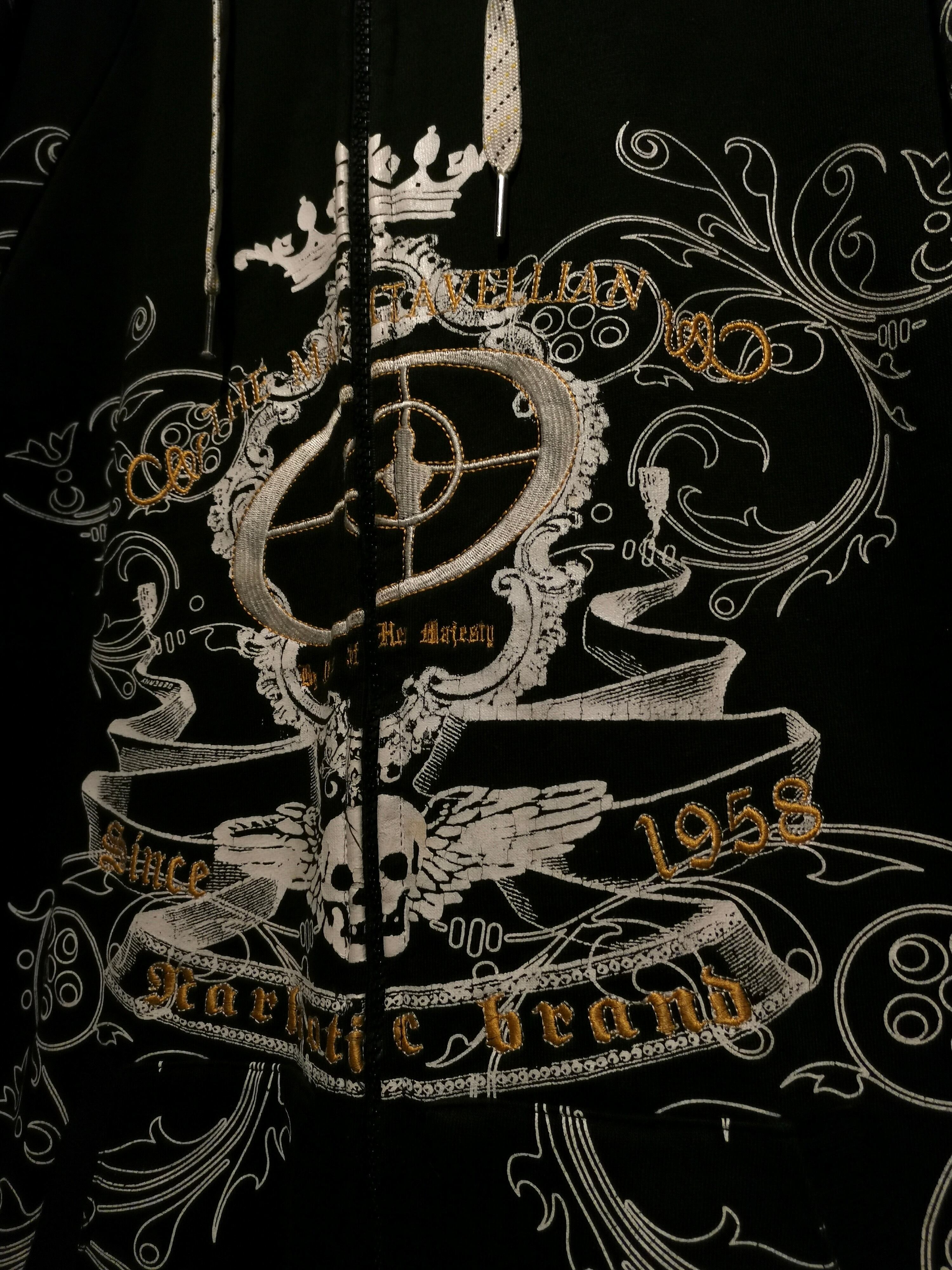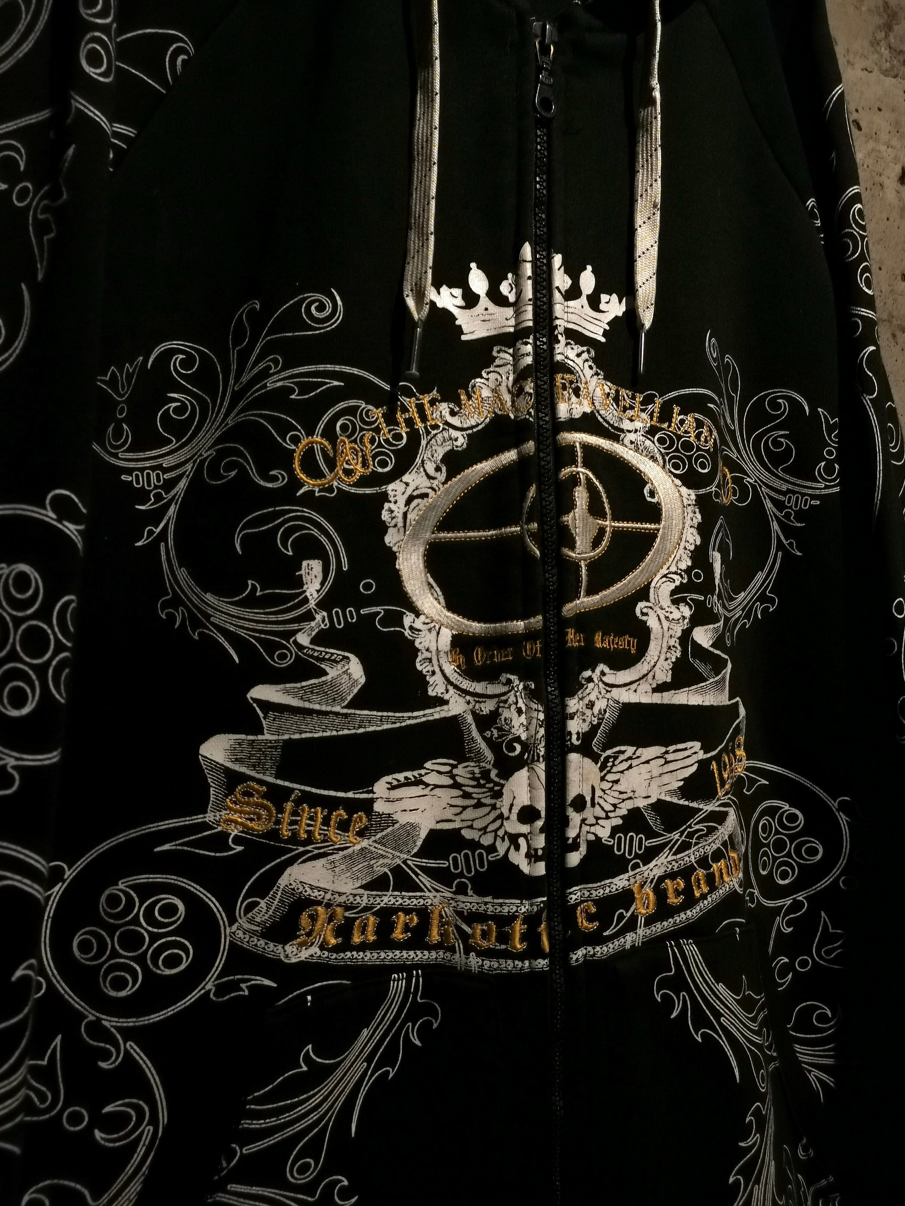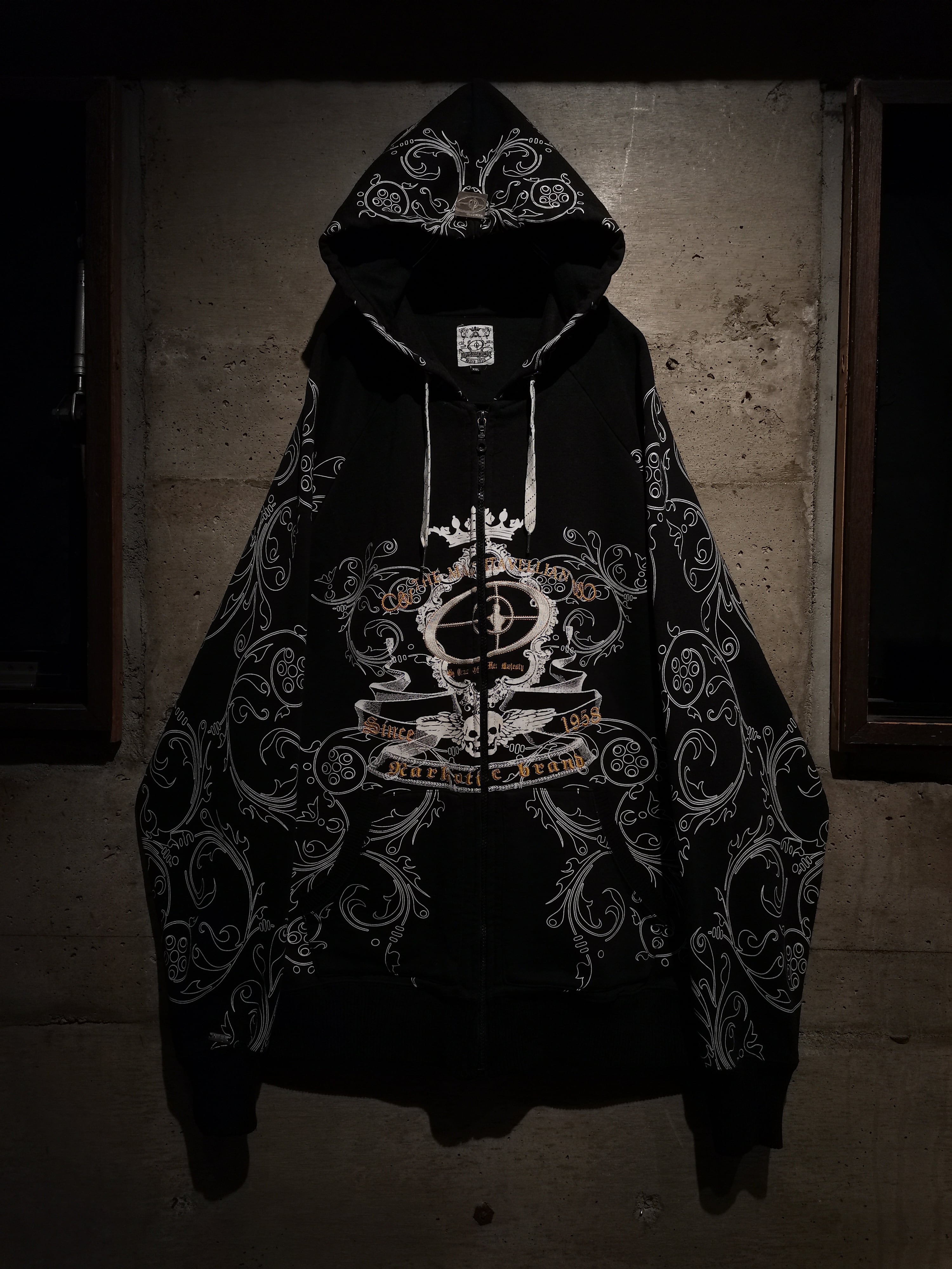 肉感のあるブラックのボディをベースに、プリントでボタニカル柄を、刺繍でブランドのロゴ等を載せたジップアップフーディ。フーディでこの手のアプローチのデザインは珍しいですね。