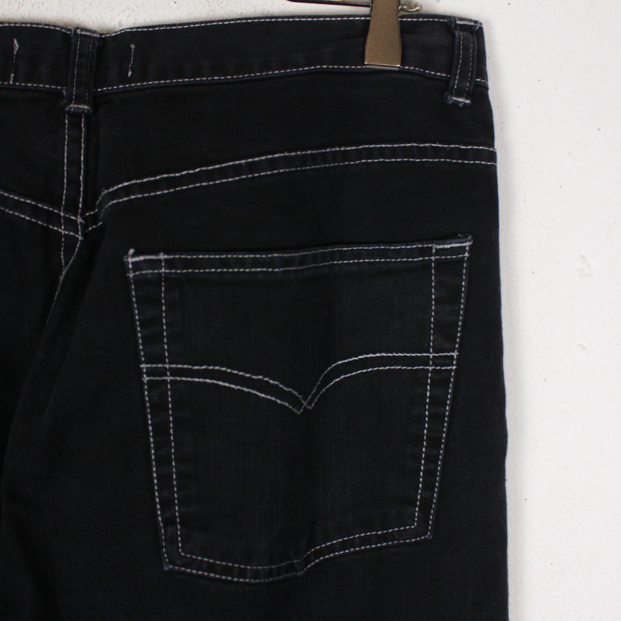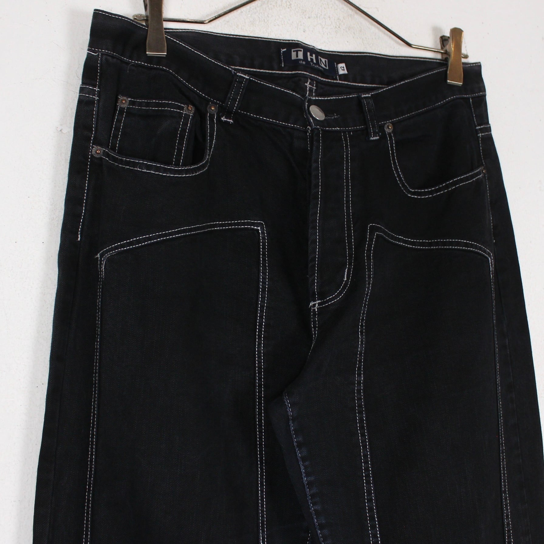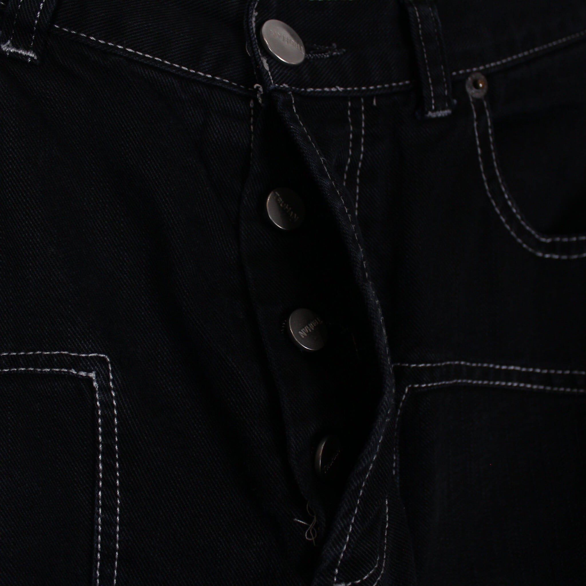 しっかりと色残りのあるブラックデニムのボディに、ダブルニーの様なデザインに白のステッチを施したワイドフレアデニムパンツ。