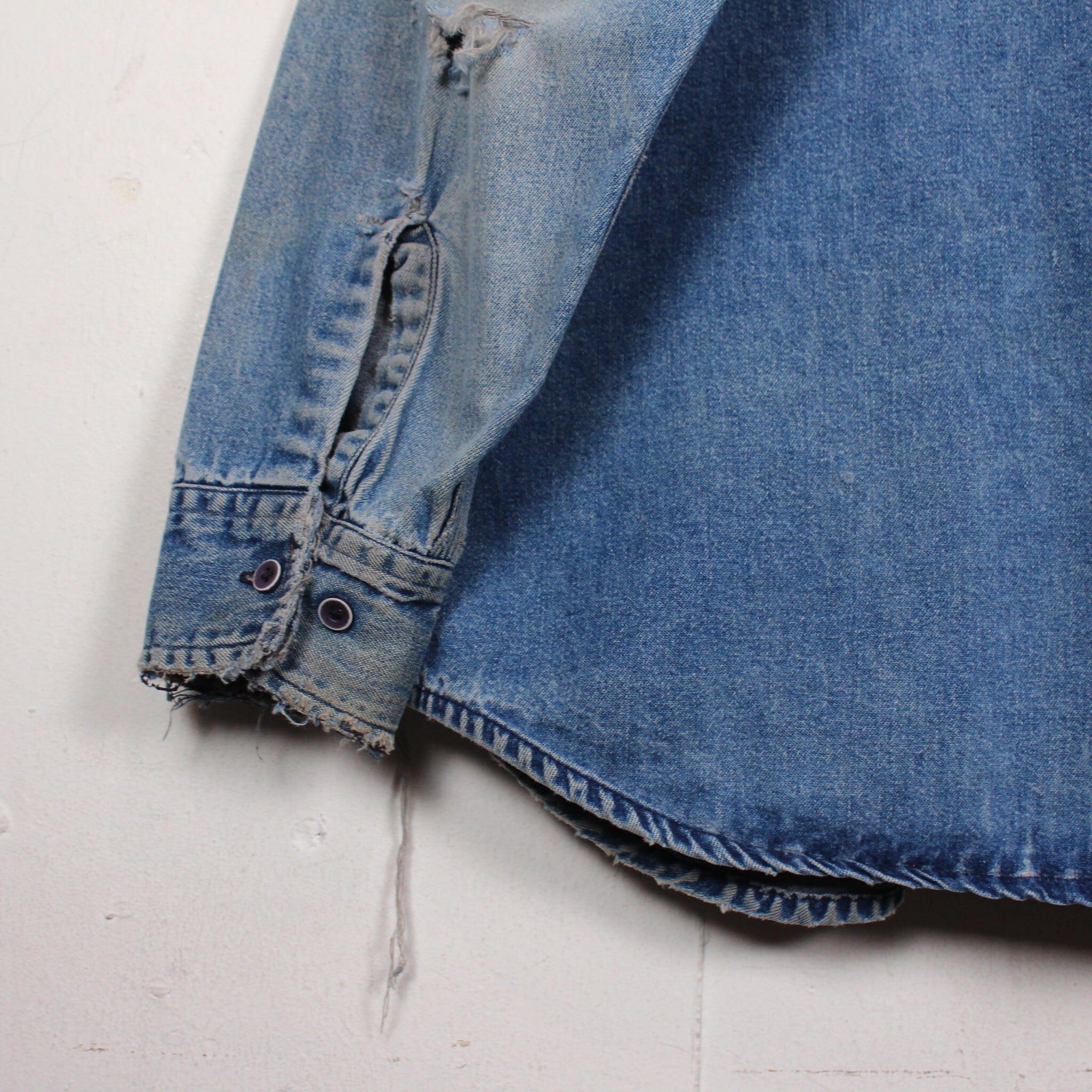 このブランドならではの上質なデニムを用いたシャツに、美しいグラデーションがかったエイジング、ボロが加工が施されたUSEDならではの雰囲気をムンムンに放つ逸品。