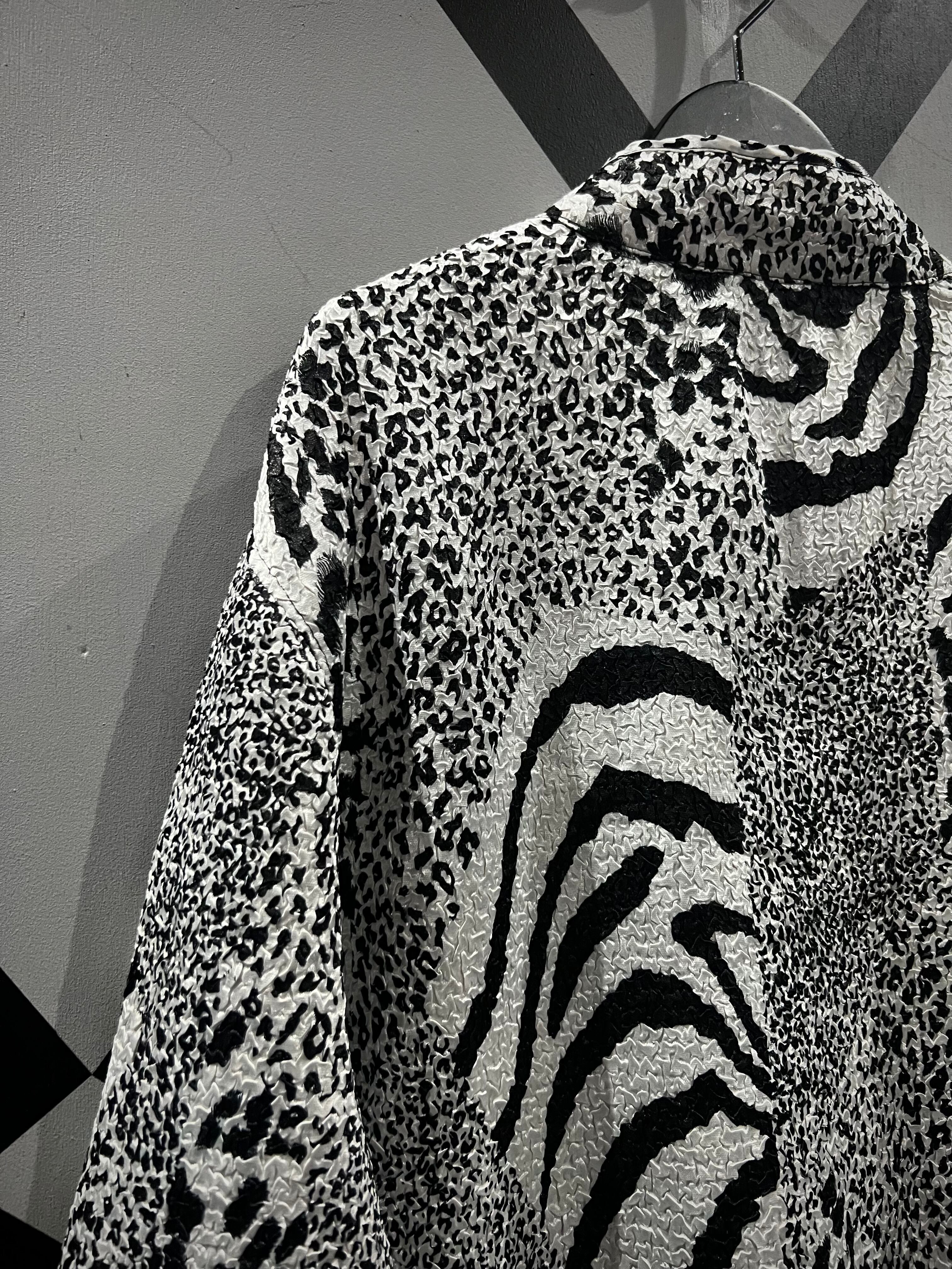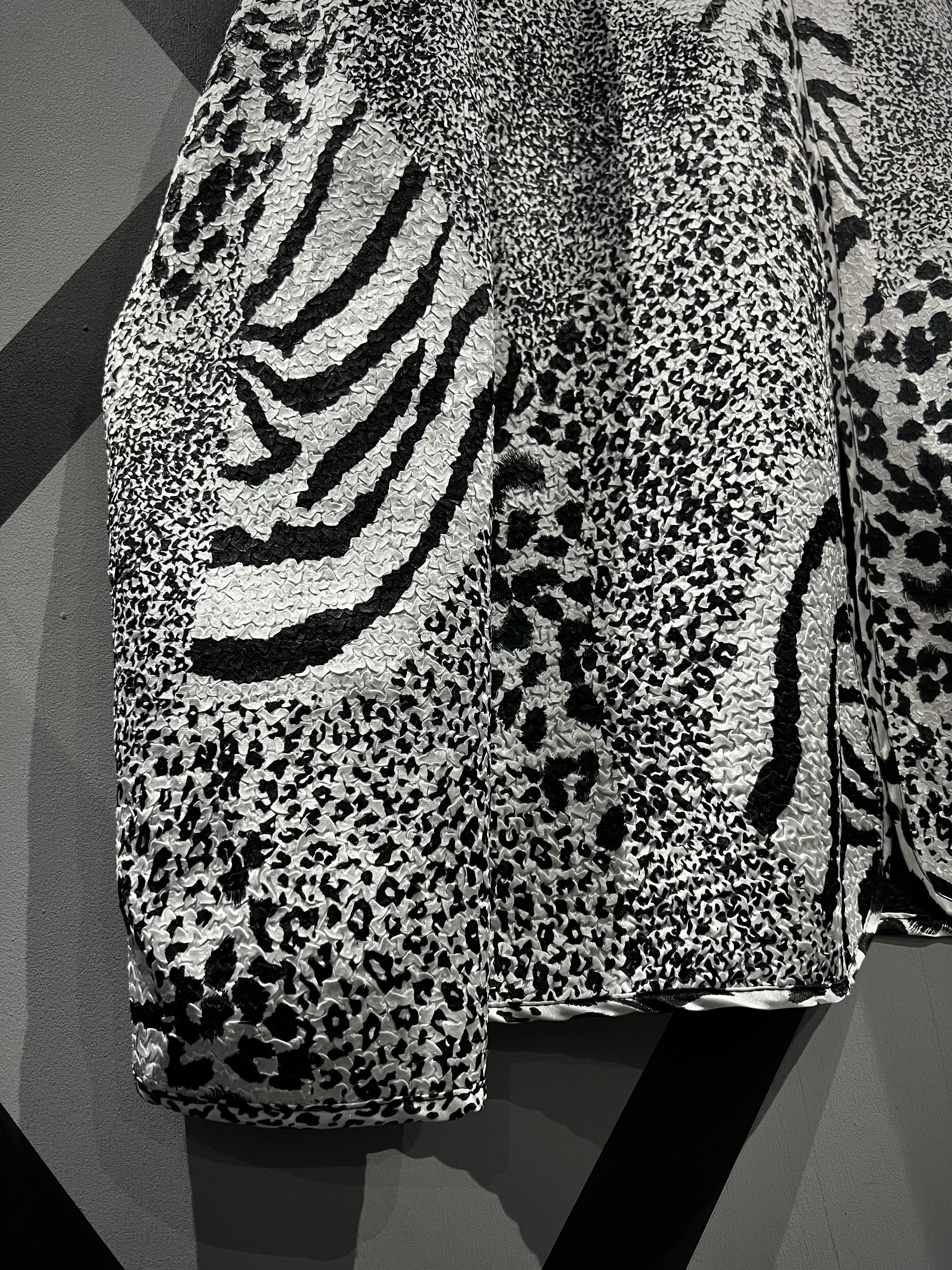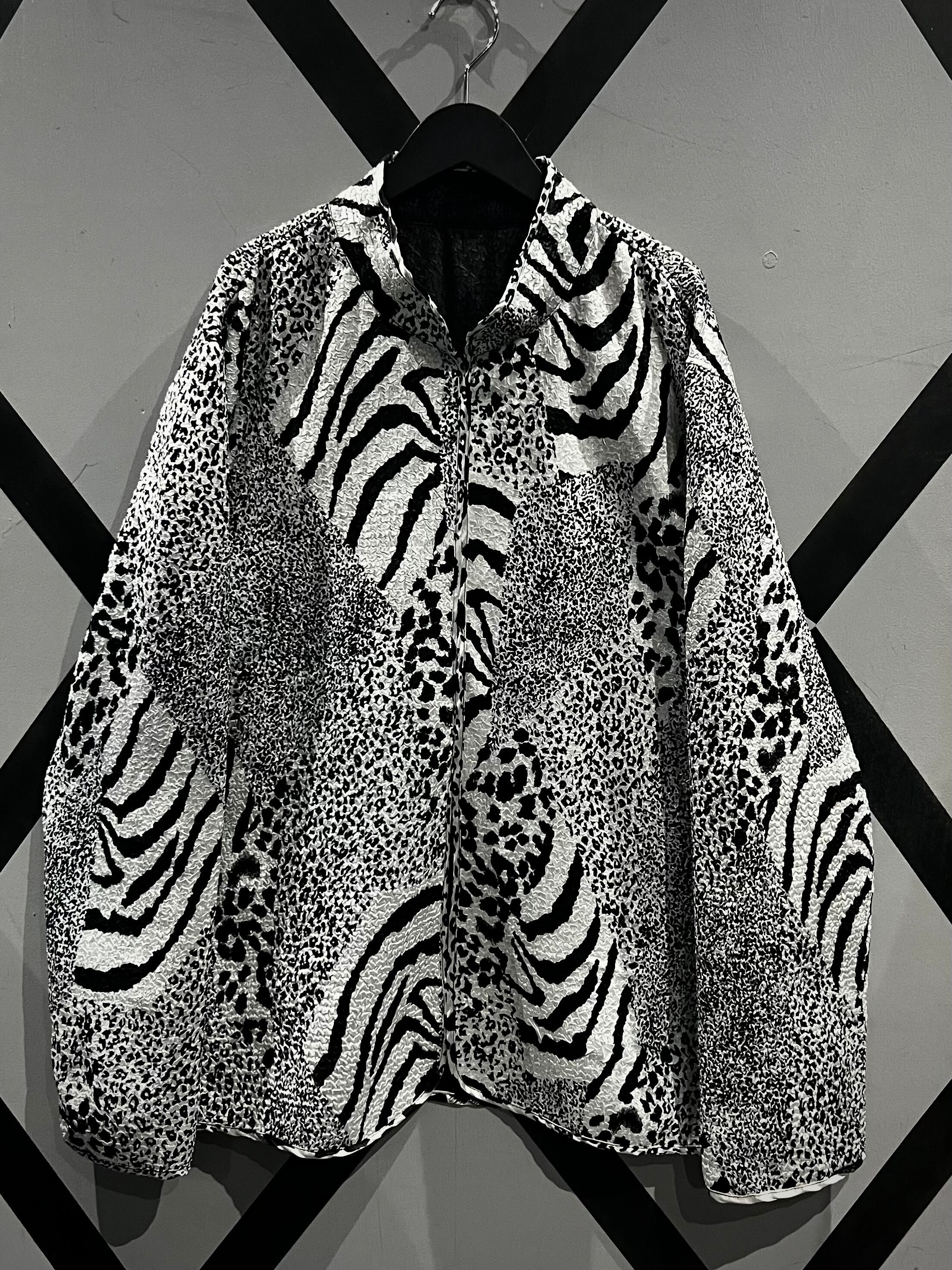このテキスタイル特有の凹凸のあるボディに、表面にはゼブラやレオパードのアニマル風の柄を、ガバッと裏返すと黒無地に切り替わる稀有なリバーシブルの羽織ジャケット。