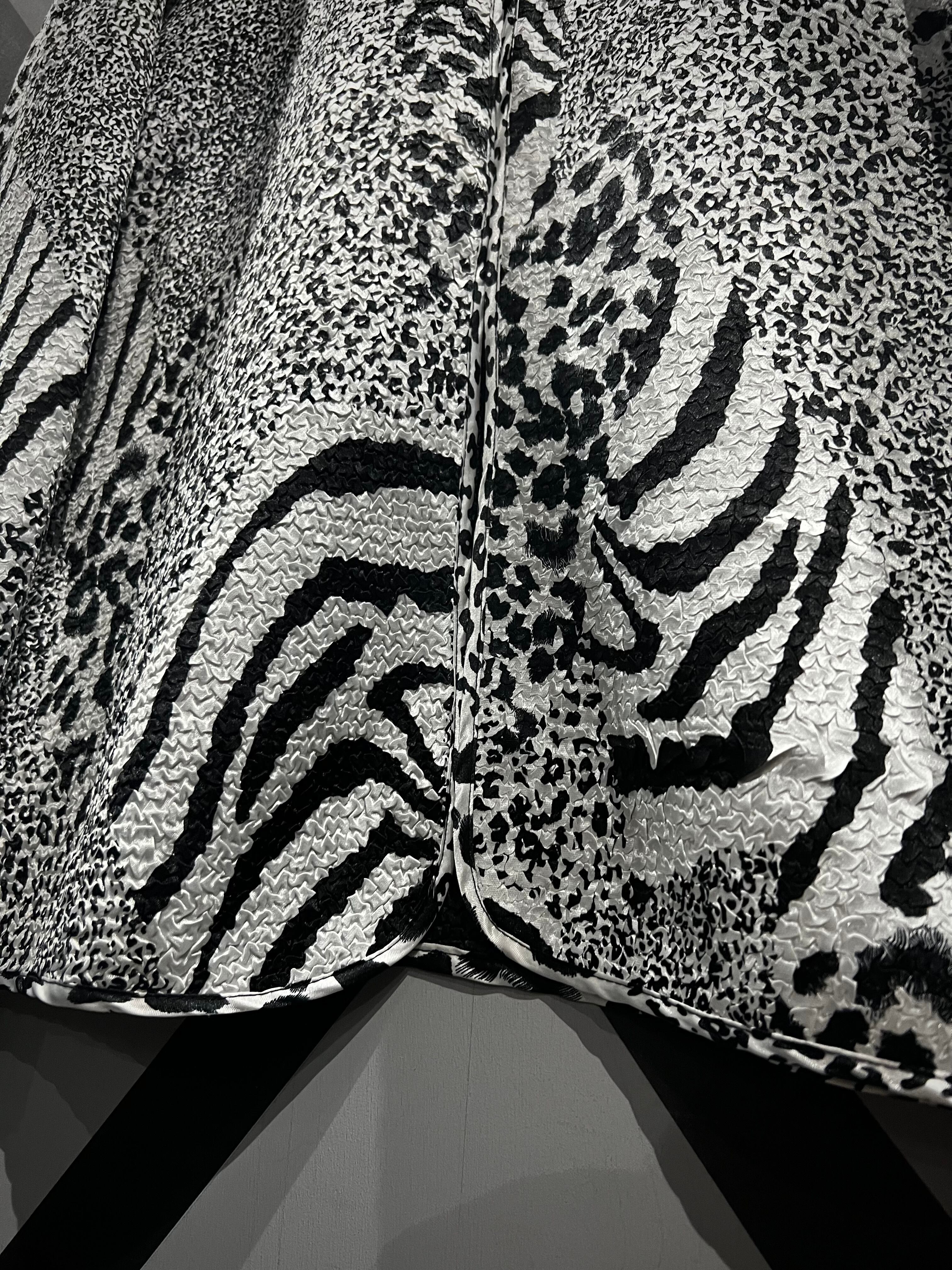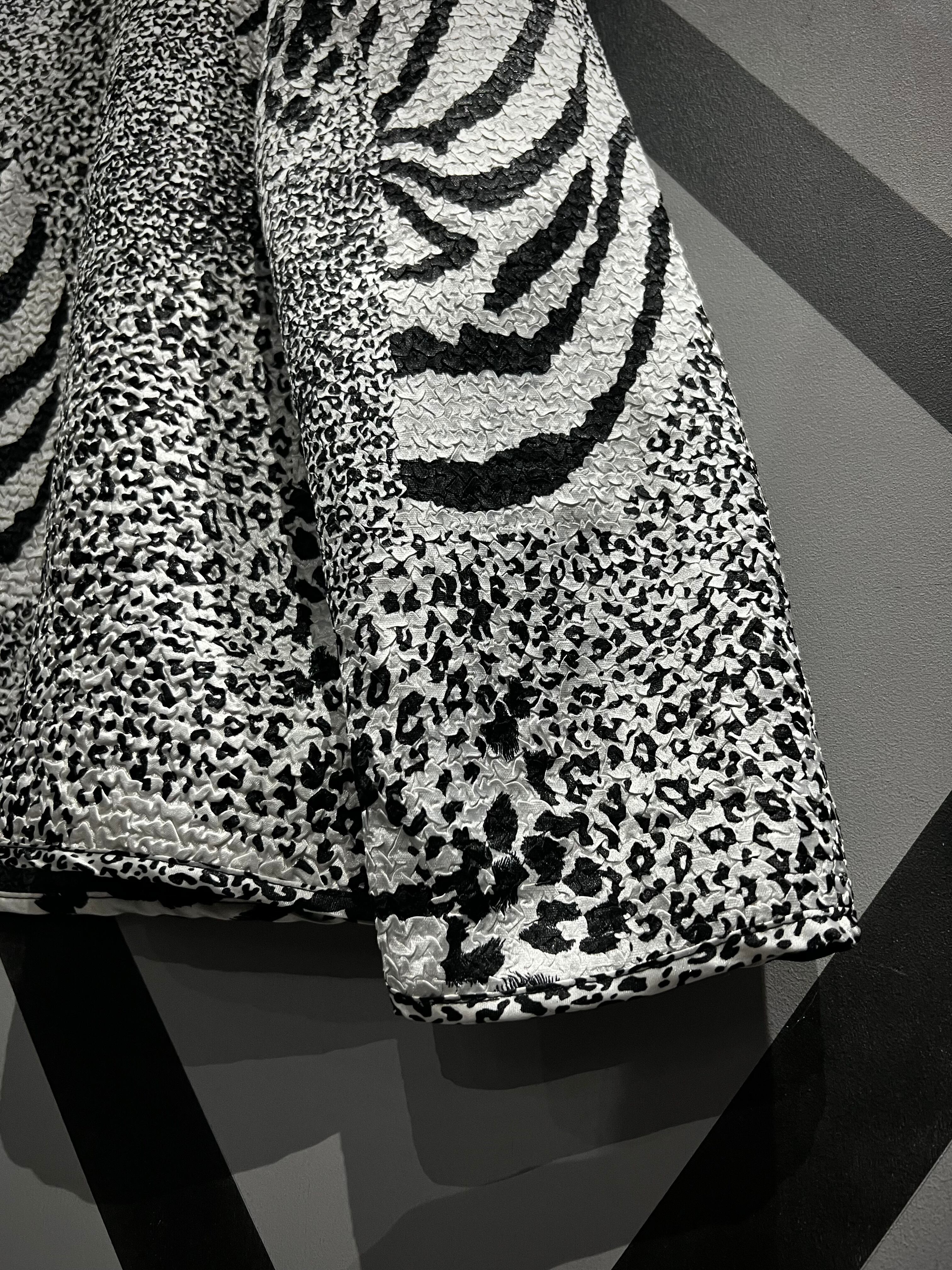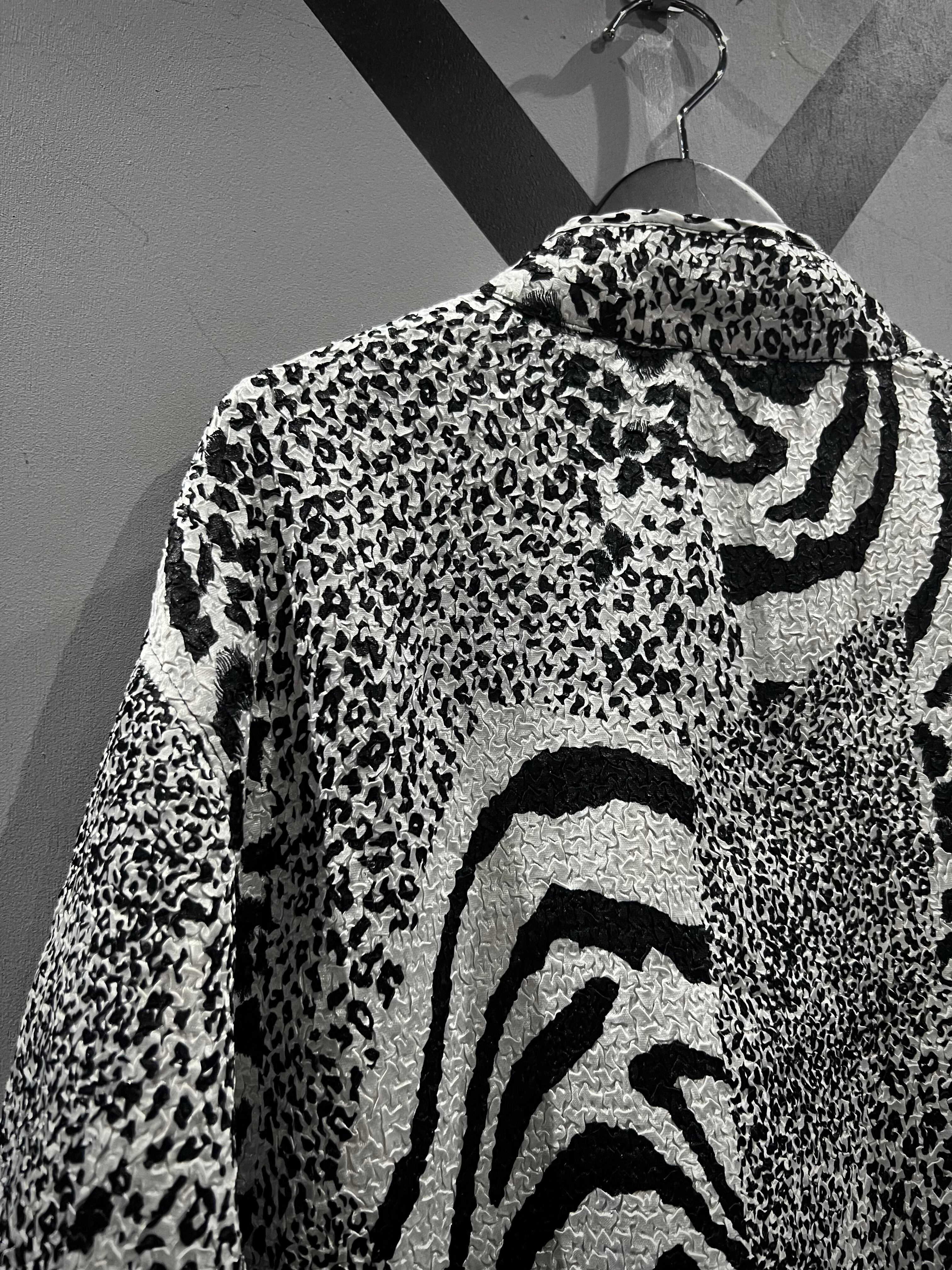 このテキスタイル特有の凹凸のあるボディに、表面にはゼブラやレオパードのアニマル風の柄を、ガバッと裏返すと黒無地に切り替わる稀有なリバーシブルの羽織ジャケット。