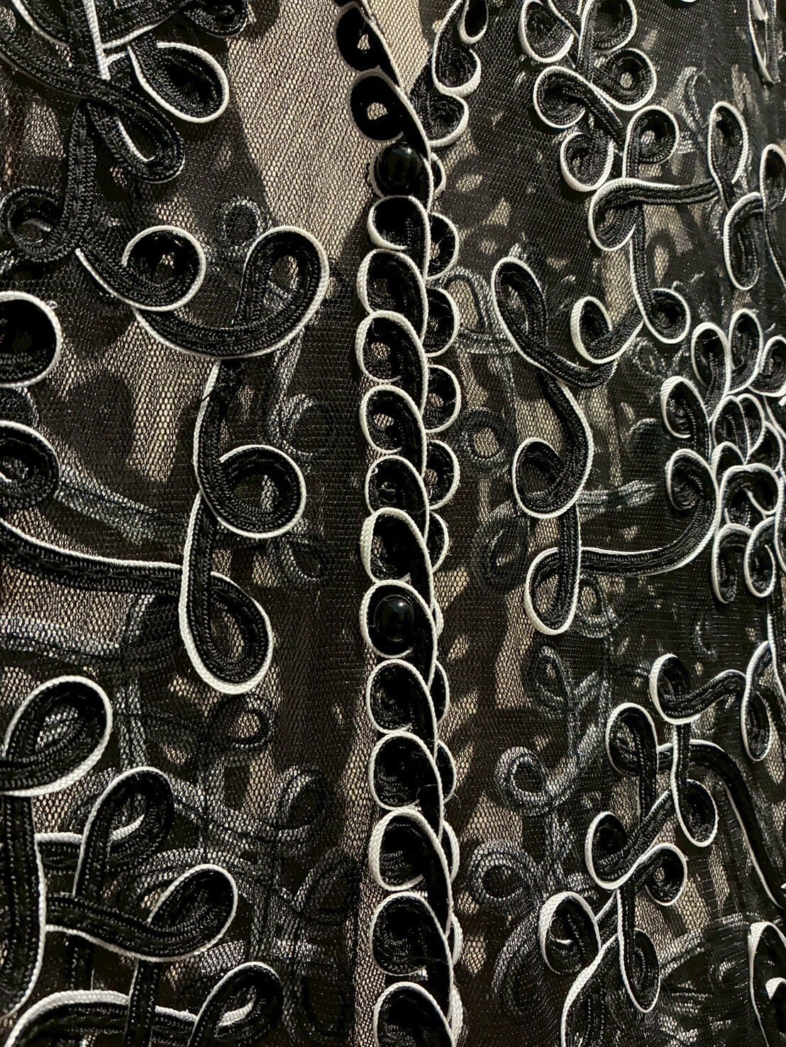 シアー素材に、モノトーンの刺繍テープによって美しい花柄を張り巡らせたシアージャケット。
