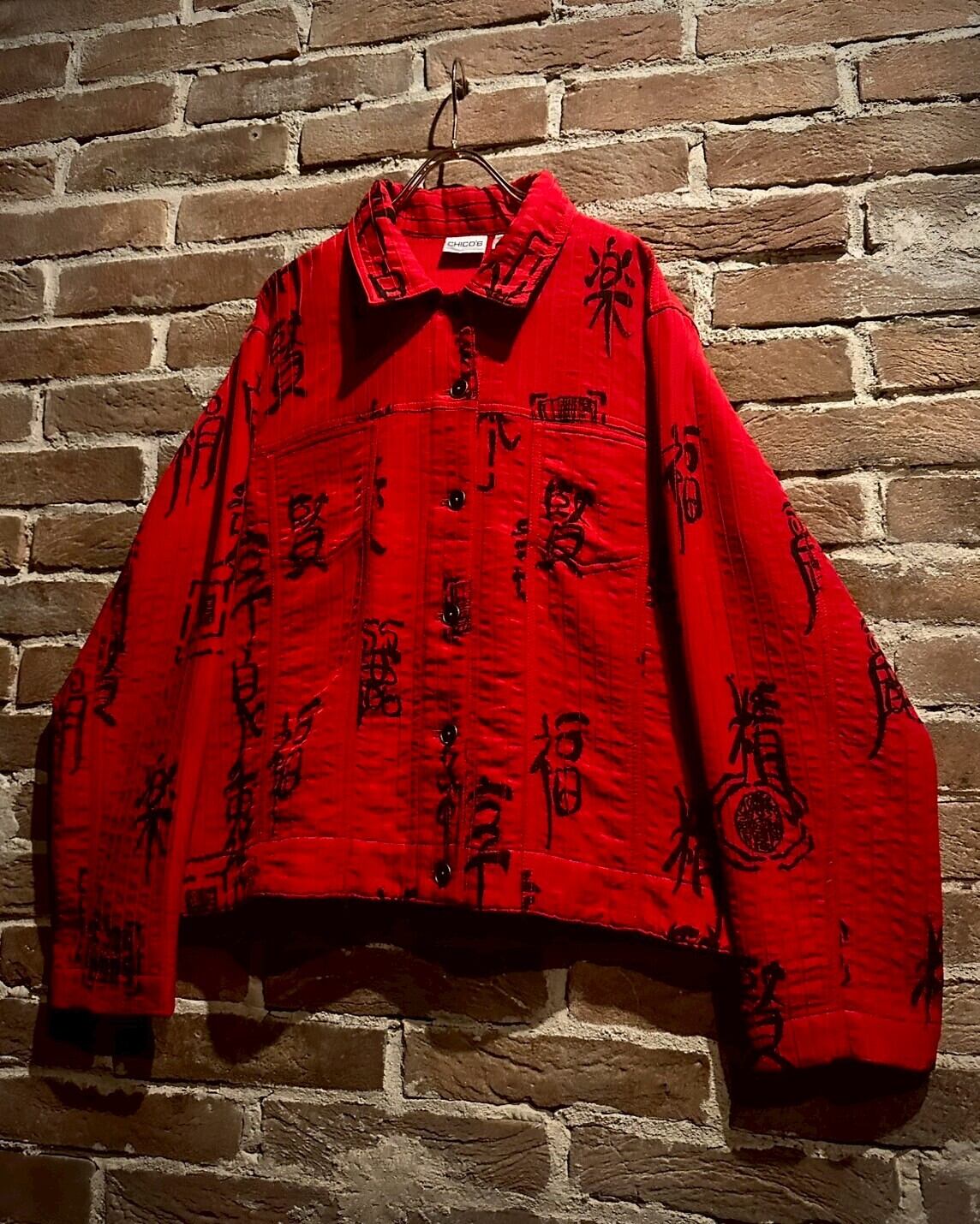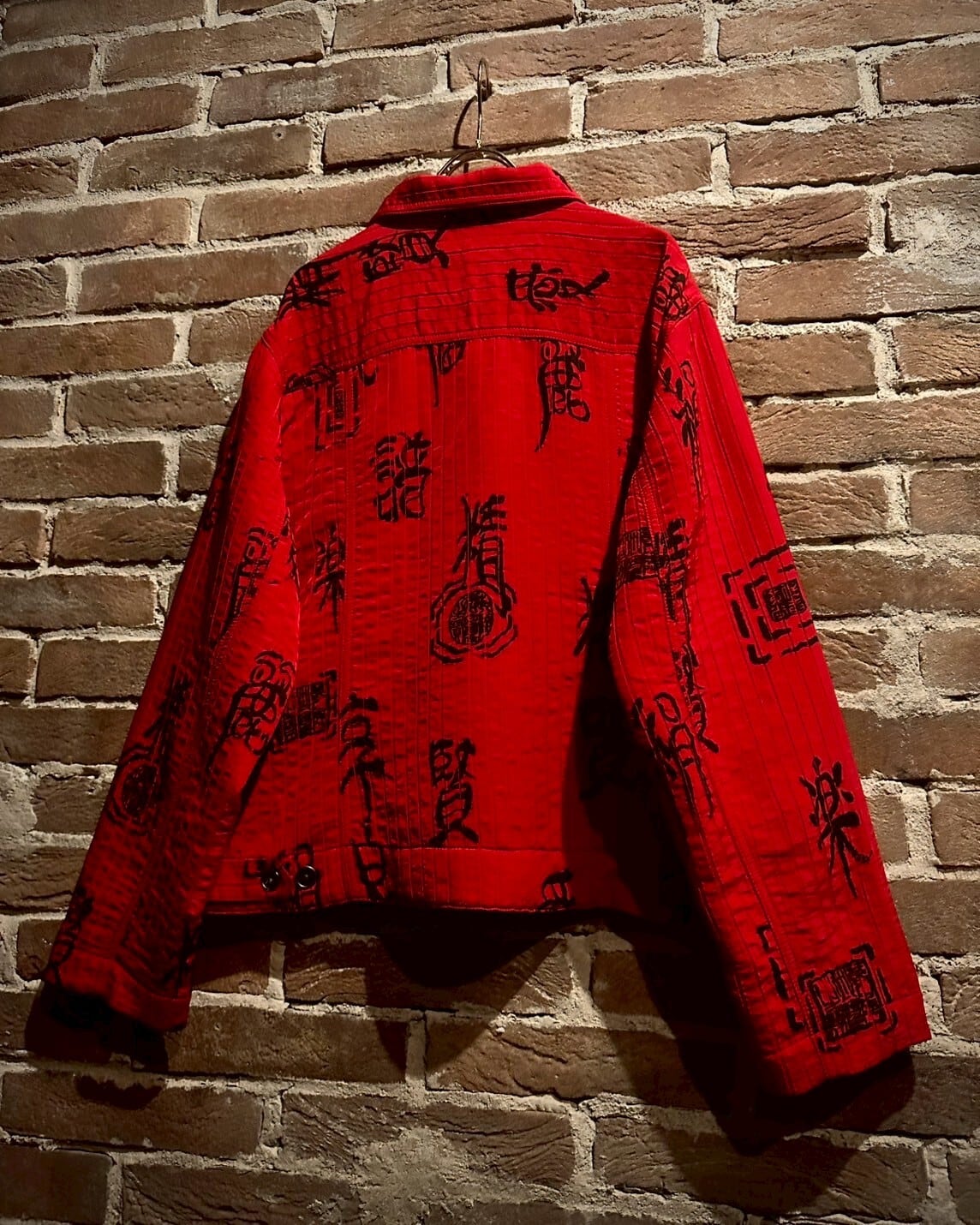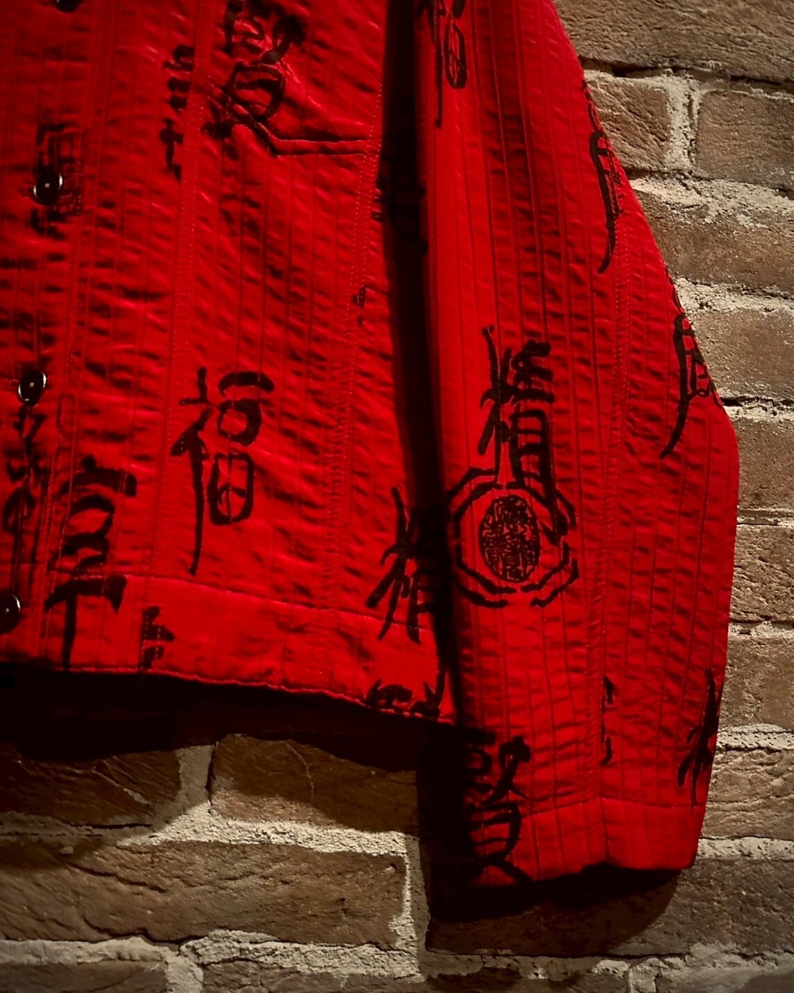 ビビッドなレッドカラーが際立つナイロンxポリエステルの混紡素材に、前面、背面、そして袖にまでも漢字のデザインを載せたショート丈ジャケット。