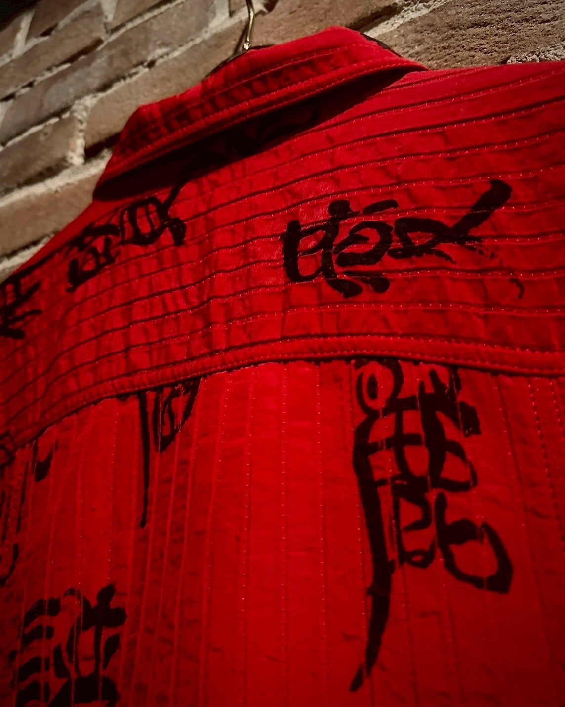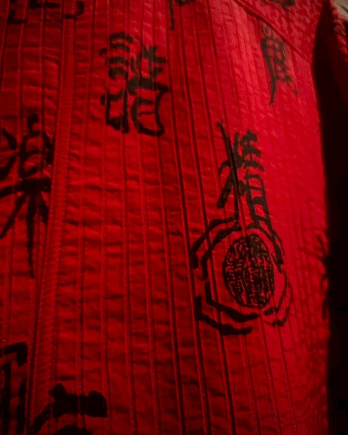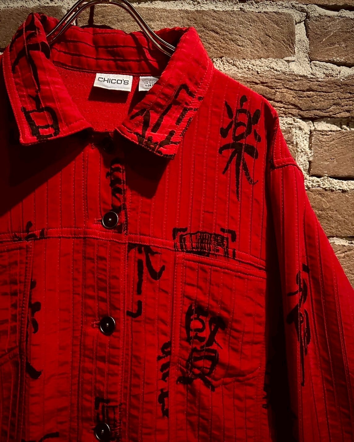 ビビッドなレッドカラーが際立つナイロンxポリエステルの混紡素材に、前面、背面、そして袖にまでも漢字のデザインを載せたショート丈ジャケット。