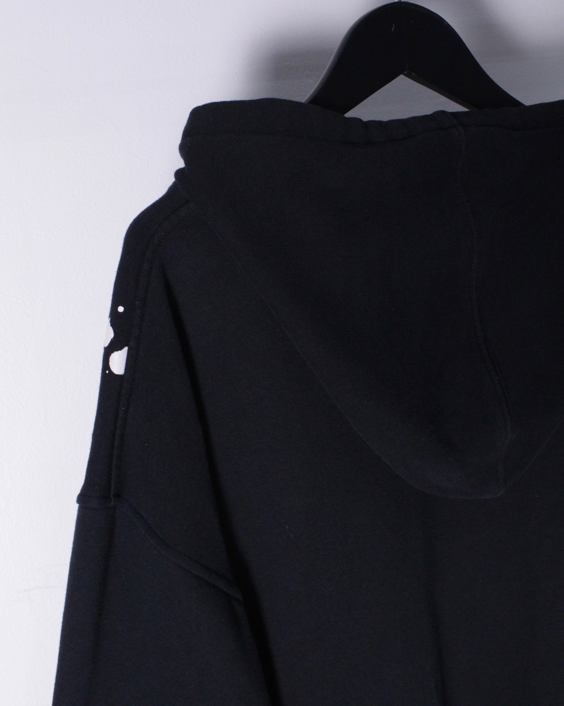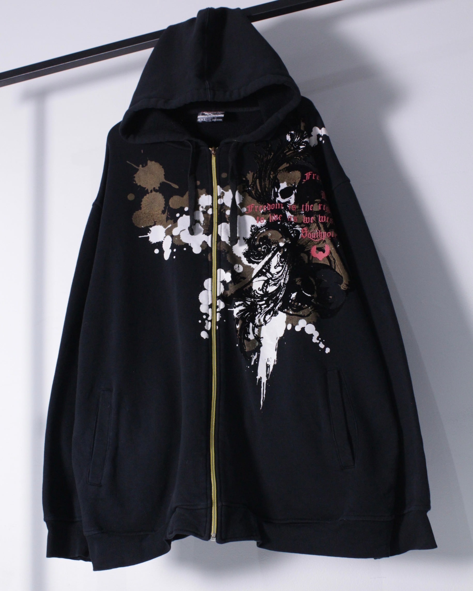 ブラックのボディをベースに、ドリッピングペイント風のプリント、さらにその上からゴシックなデザインを載せたジップアップフーディ。