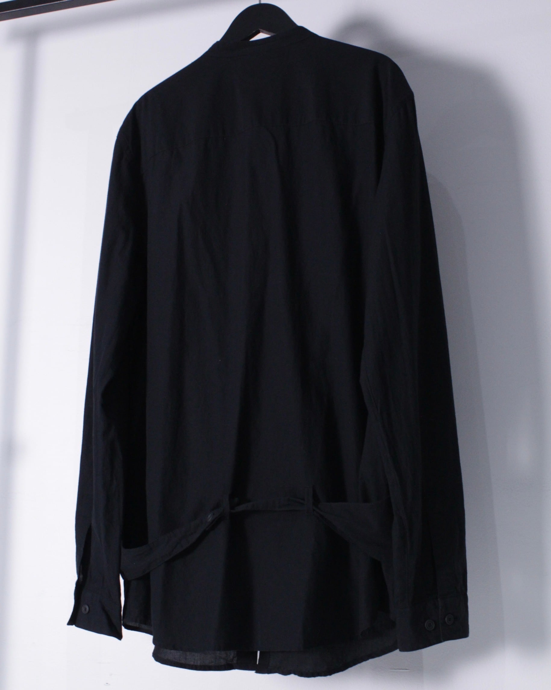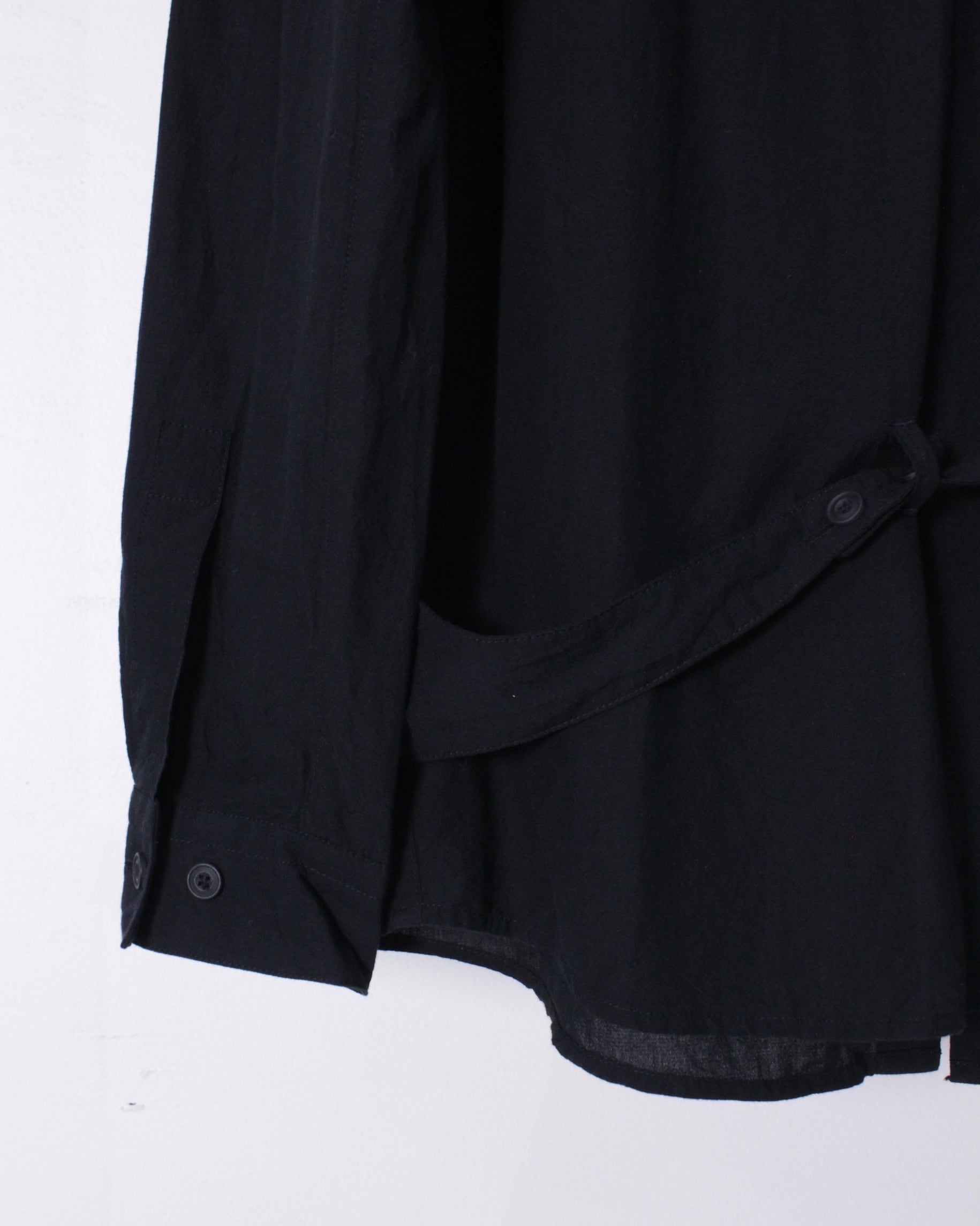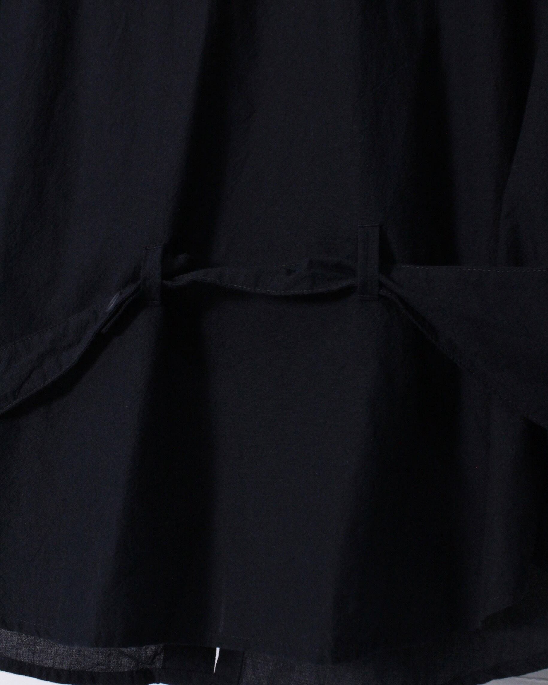 前身頃から裾付近にかけてベストをレイヤードした様なデザイン、背面にはベルトが施され、オールブラックのボディが豊かな表情に仕上げられています。