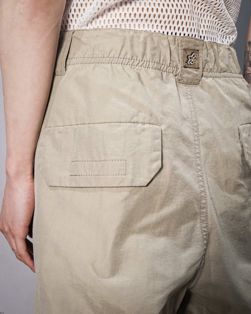 マットなナイロンを用いた、ベージュのワイドストレートカーゴパンツ。