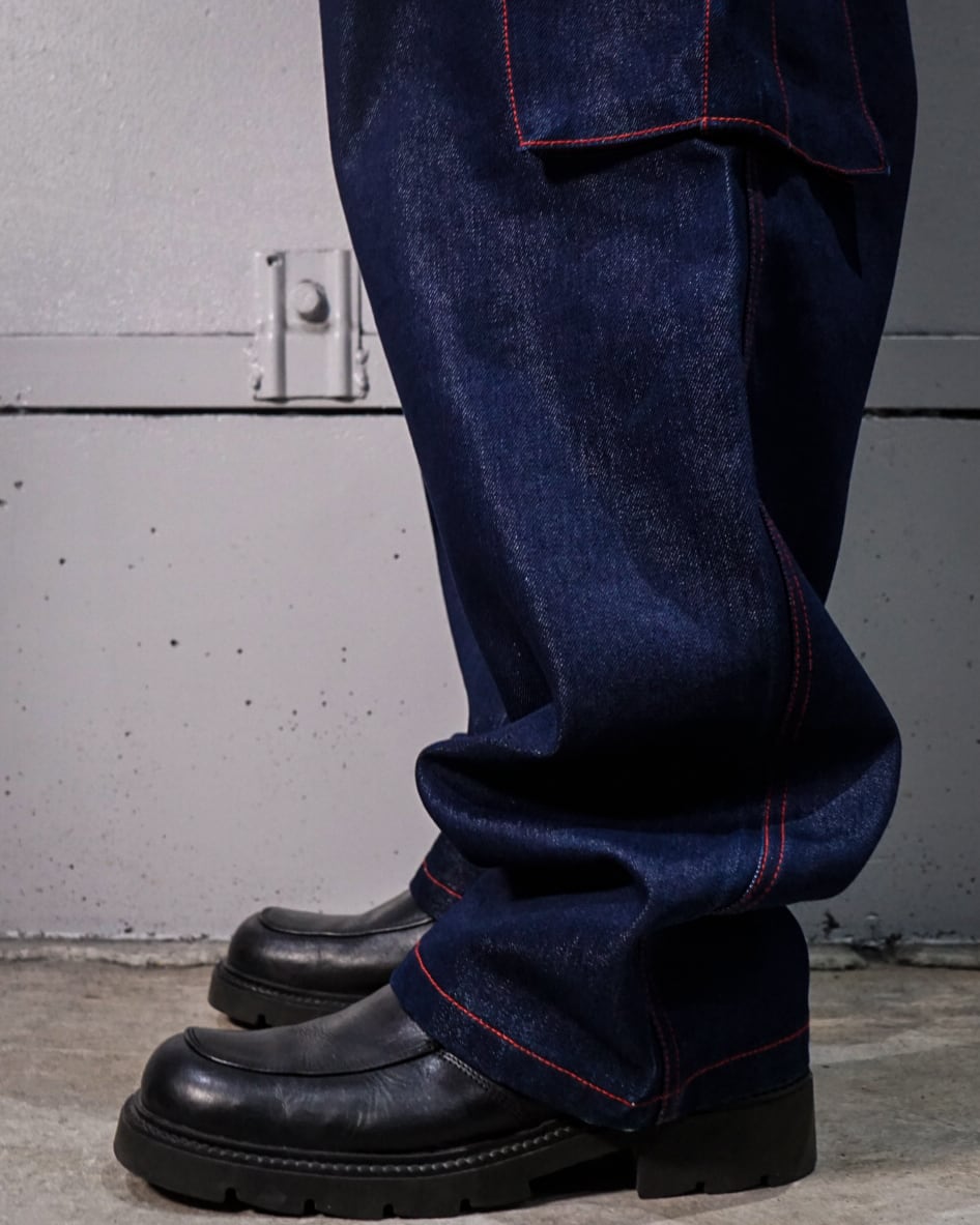 深みのあるインディゴブルーのボディに赤色のステッチワークがよく映え、立体感のある仕上がりに。メタリックデニム自体が稀少ですが、ペインターパンツとなるとより見つからない個体かと。