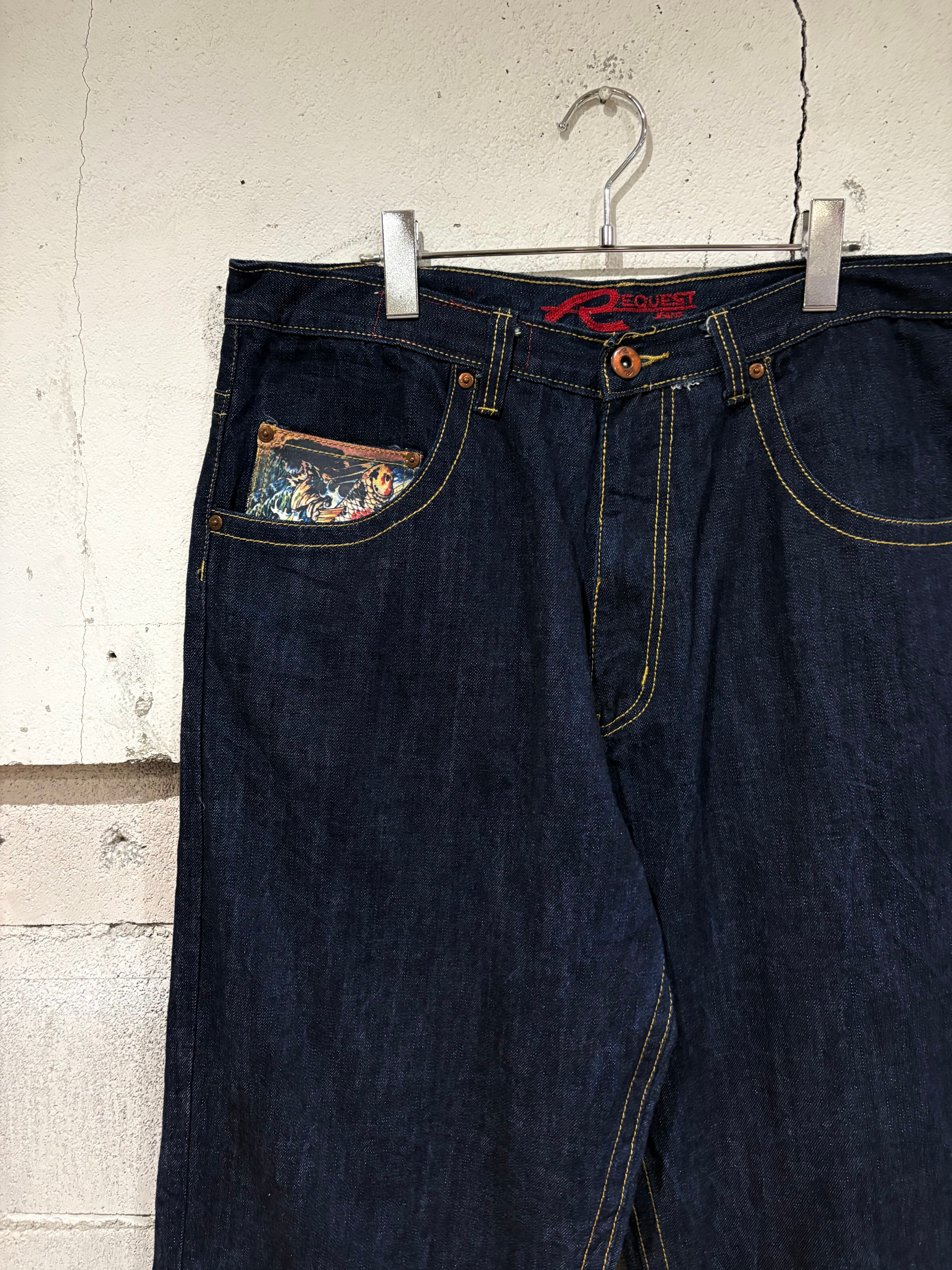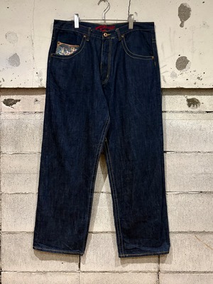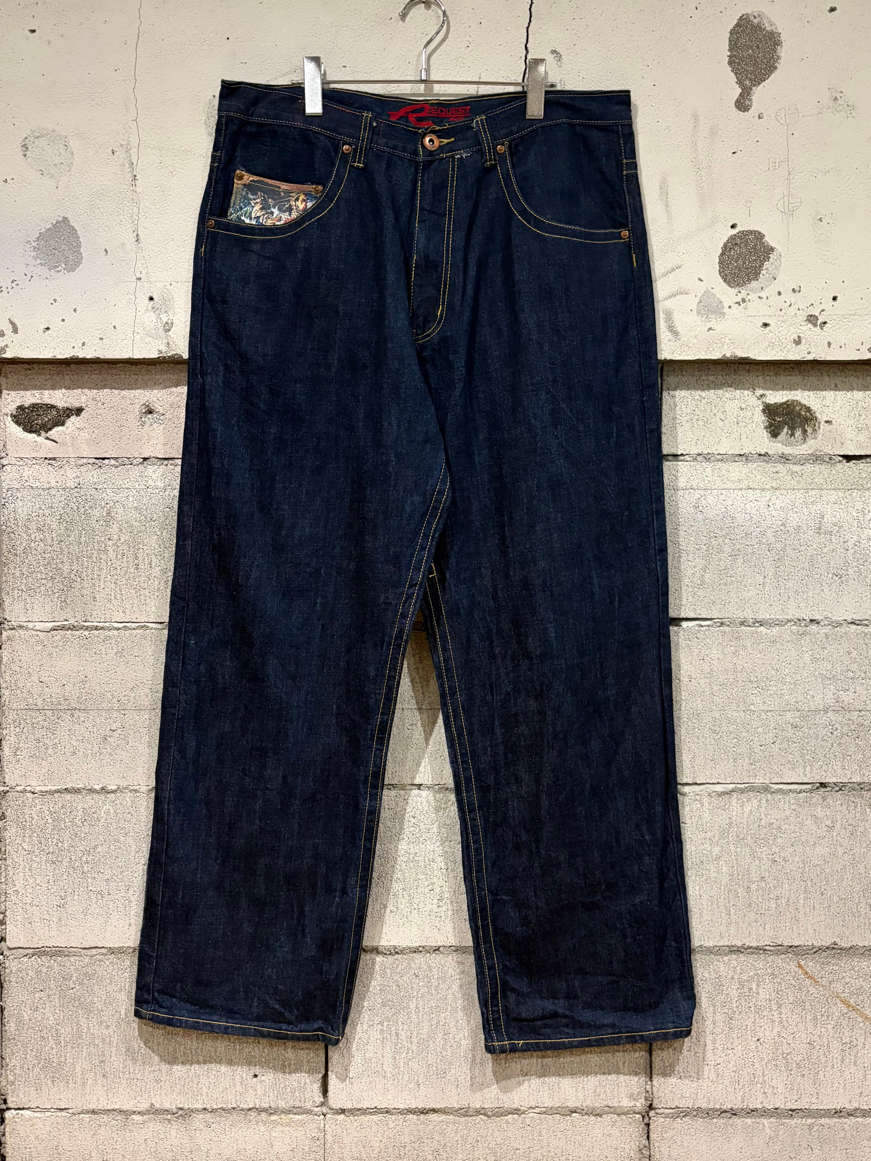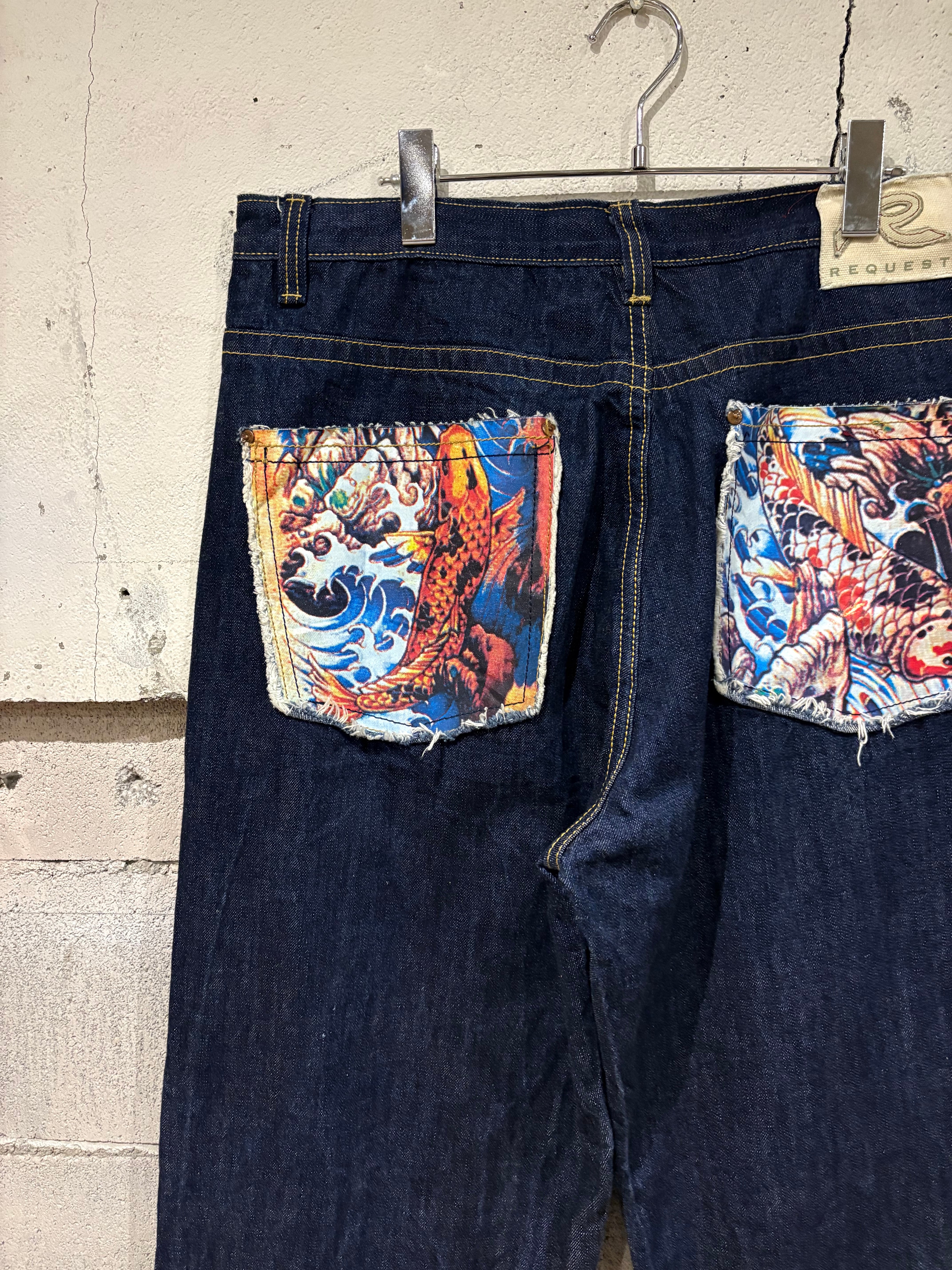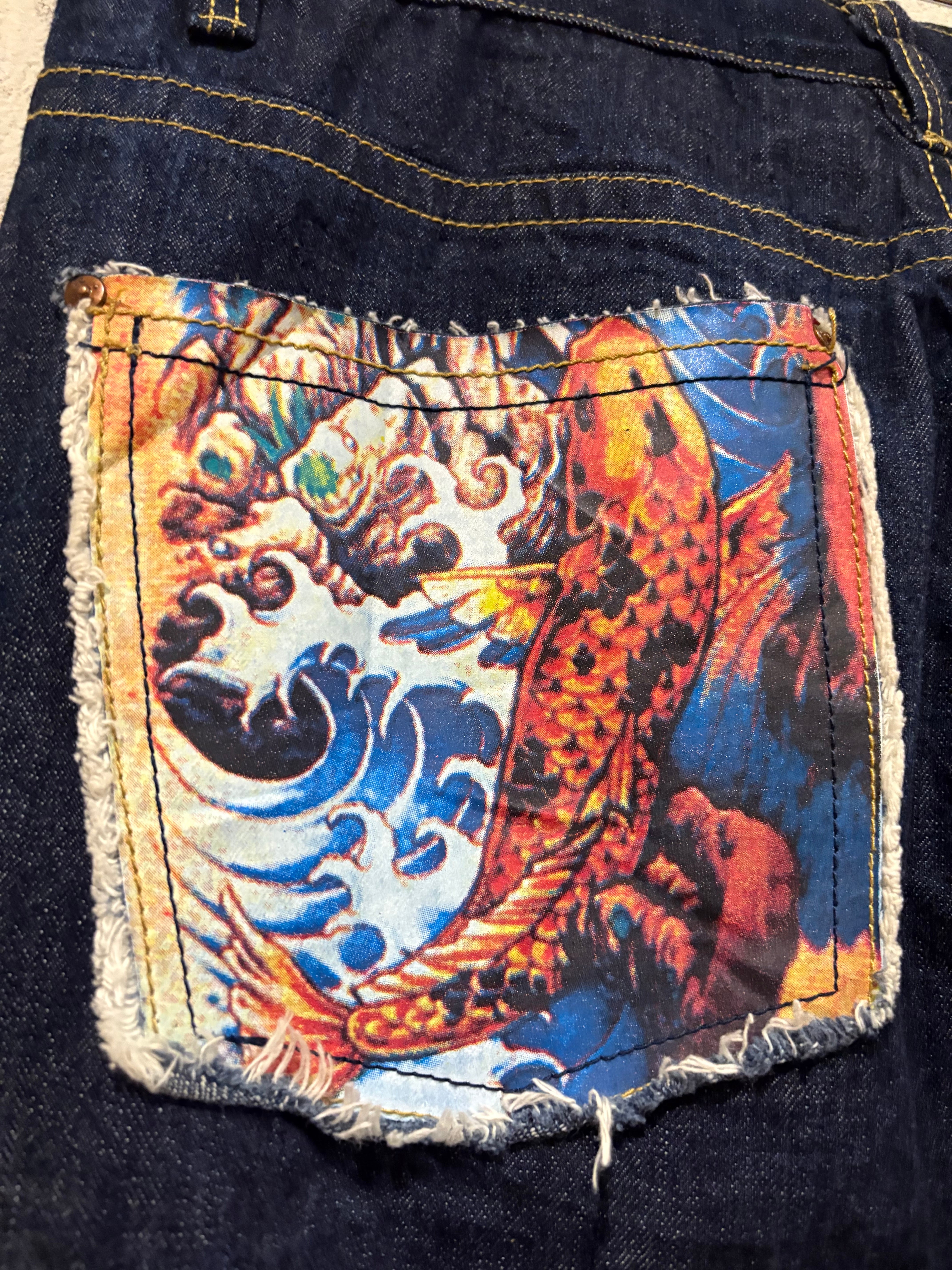 深みのあるインディゴブルーのボディに、フロント、バックポケットに日本の和彫を彷彿とさせるような鯉のデザインを落とし込んだバギーパンツ。
