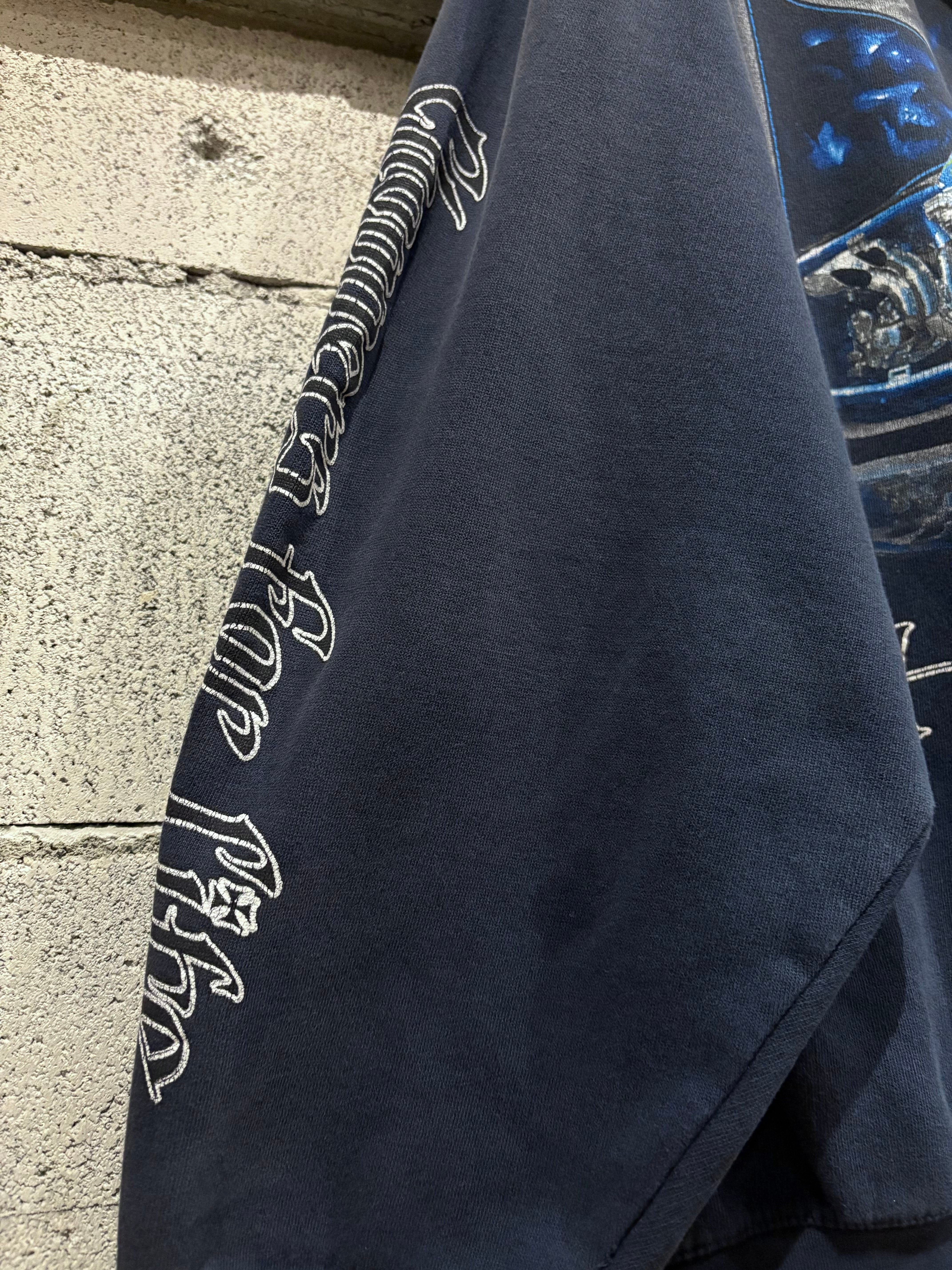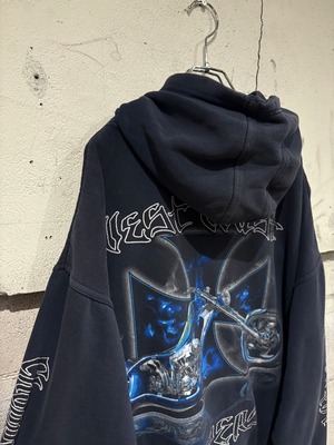 フロントにはアイアンモチーフに青い炎、バックにはフロントと同様のデザインにチョッパーズバイク、アームにはブランドロゴをプリントでON。これめちゃくちゃイケてます、、、