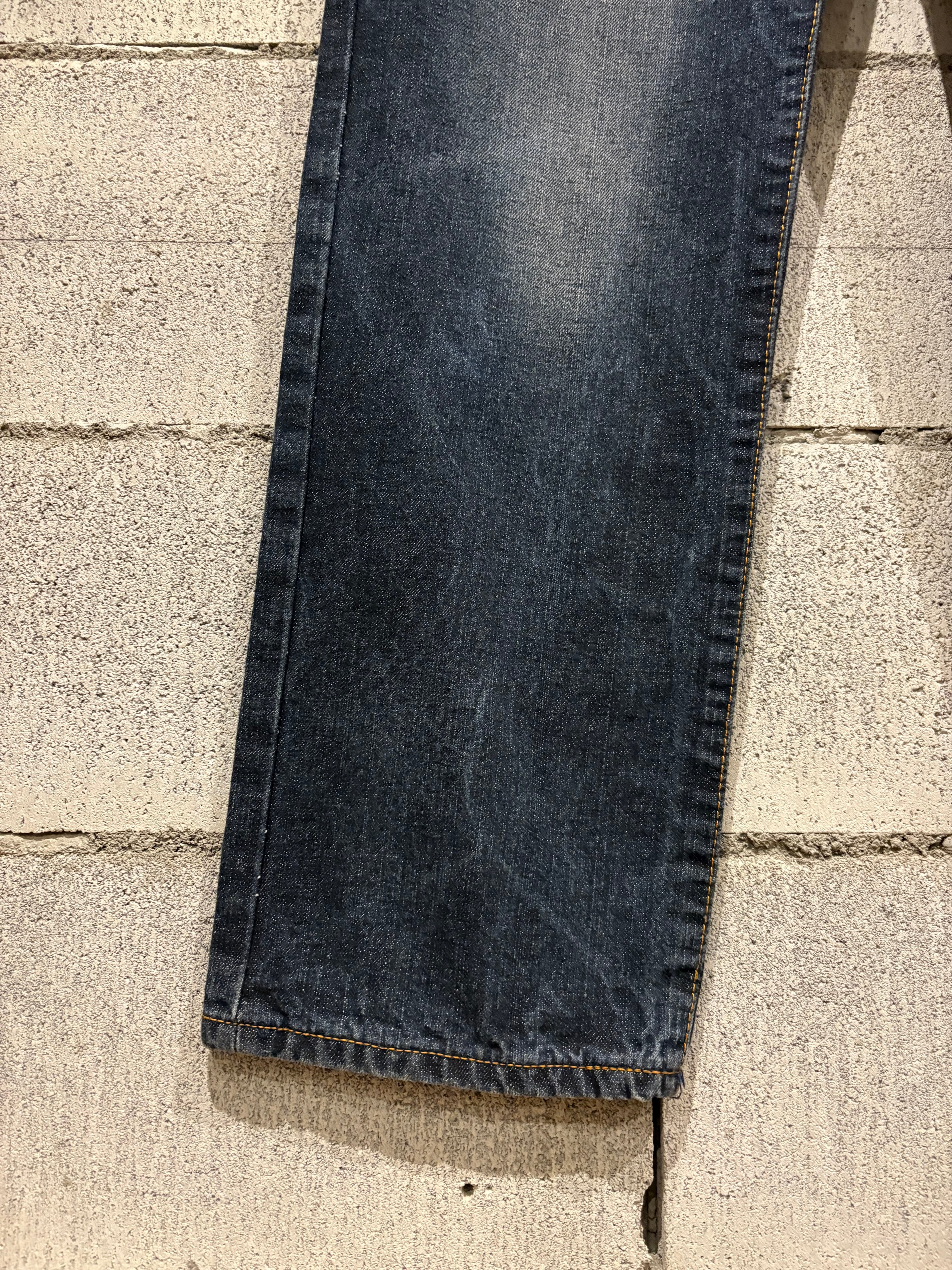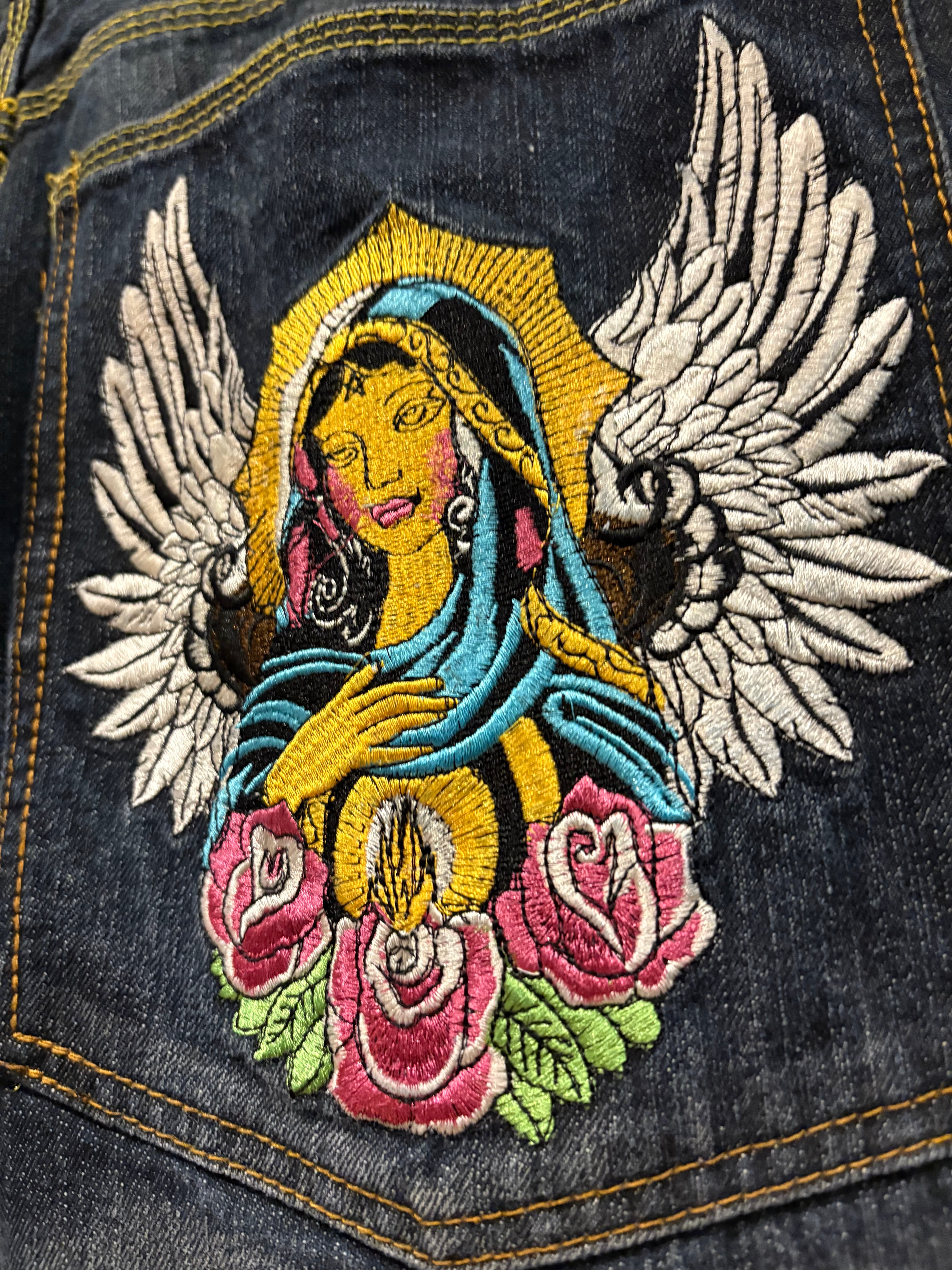 アタリの良いデニムのボディに、背面にマリアにフェザー、バラのアメトラタトゥーのデザイン、ブランドロゴの刺繍を刻んだデニムパンツ。