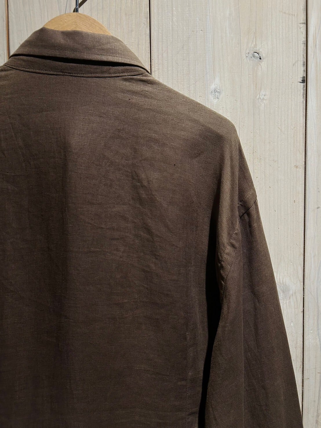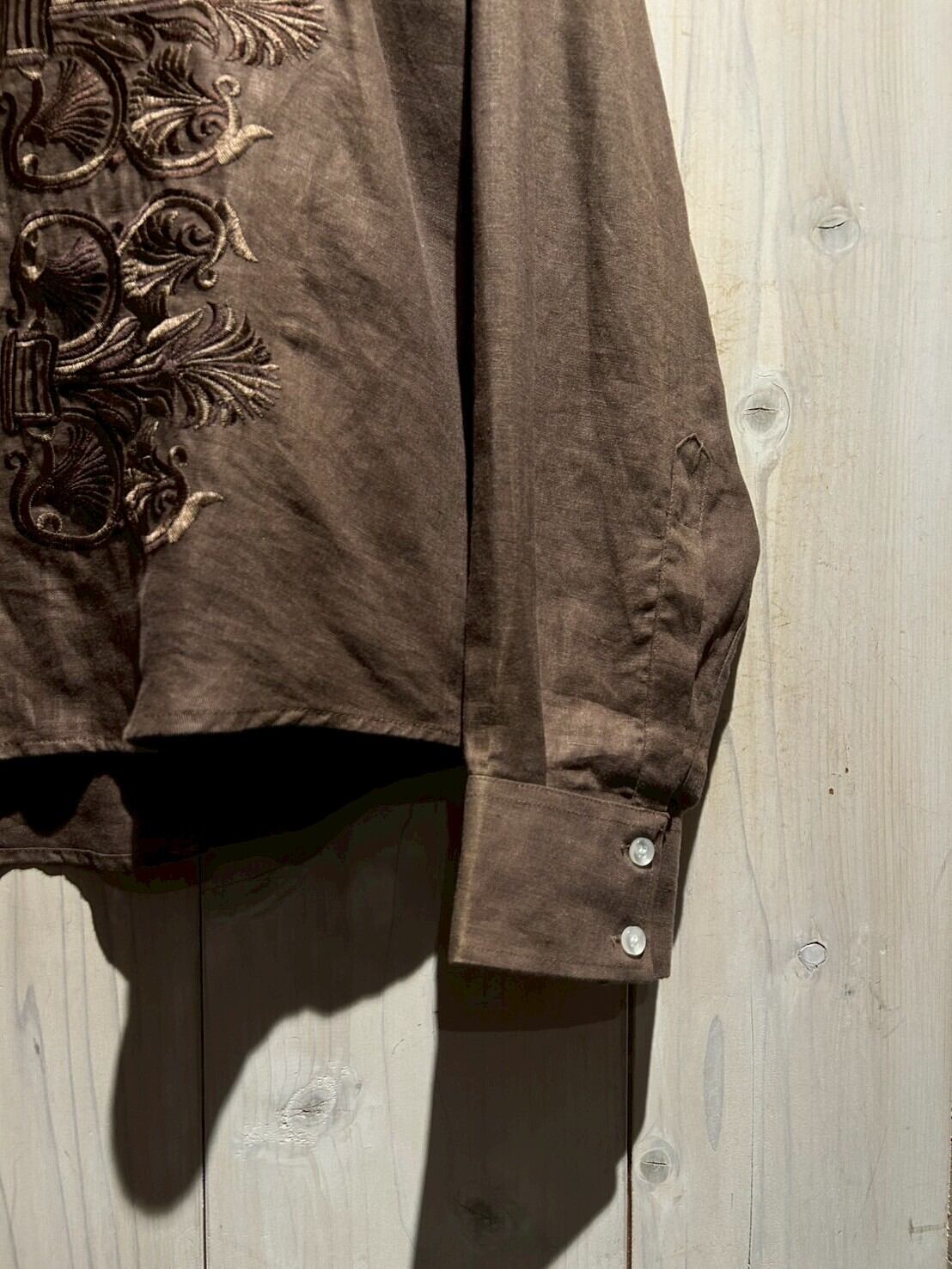 風合い豊かな表情を見せるブラウンのリネン素材をボディに使用し、フロントに美しい刺繍を刻み込んだMade in ITALYの1着。
