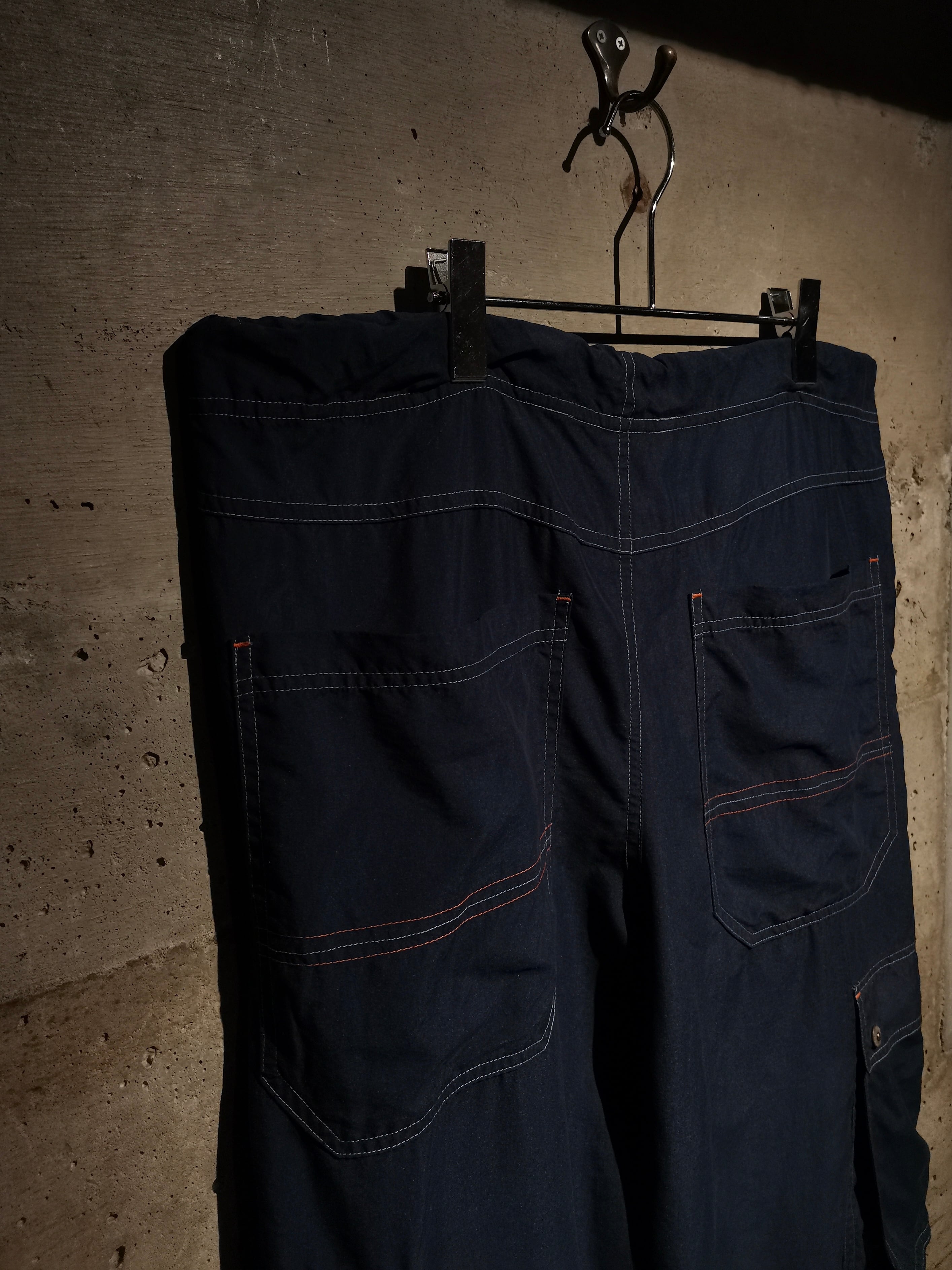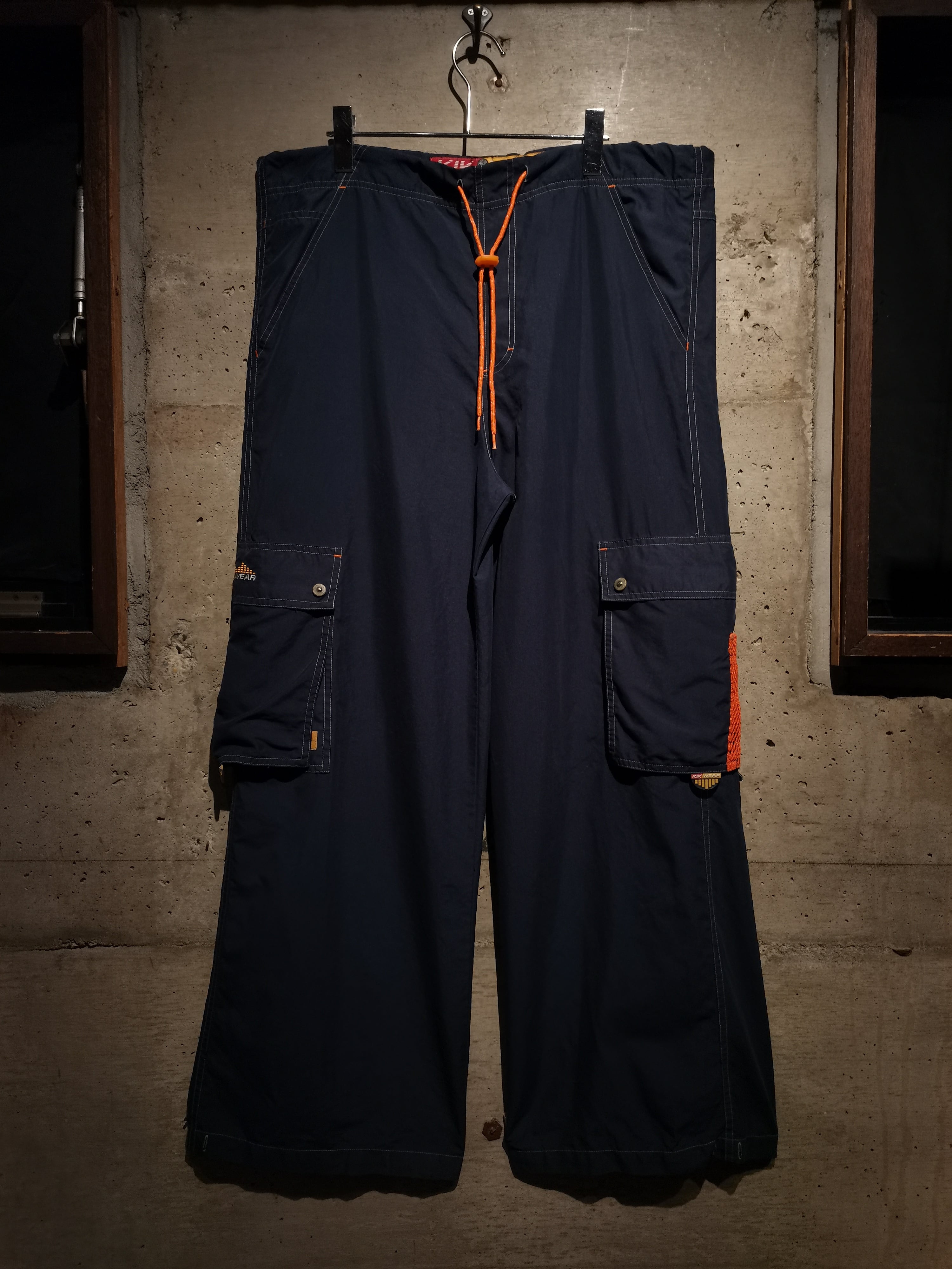 落ち着きのあるネイビーのナイロンボディに、パキッとしたオレンジカラーでドローコードやメッシュ切り替えカーゴポケットが配された、唯一無二且つ、スペシャルなナイロンカーゴパンツ。