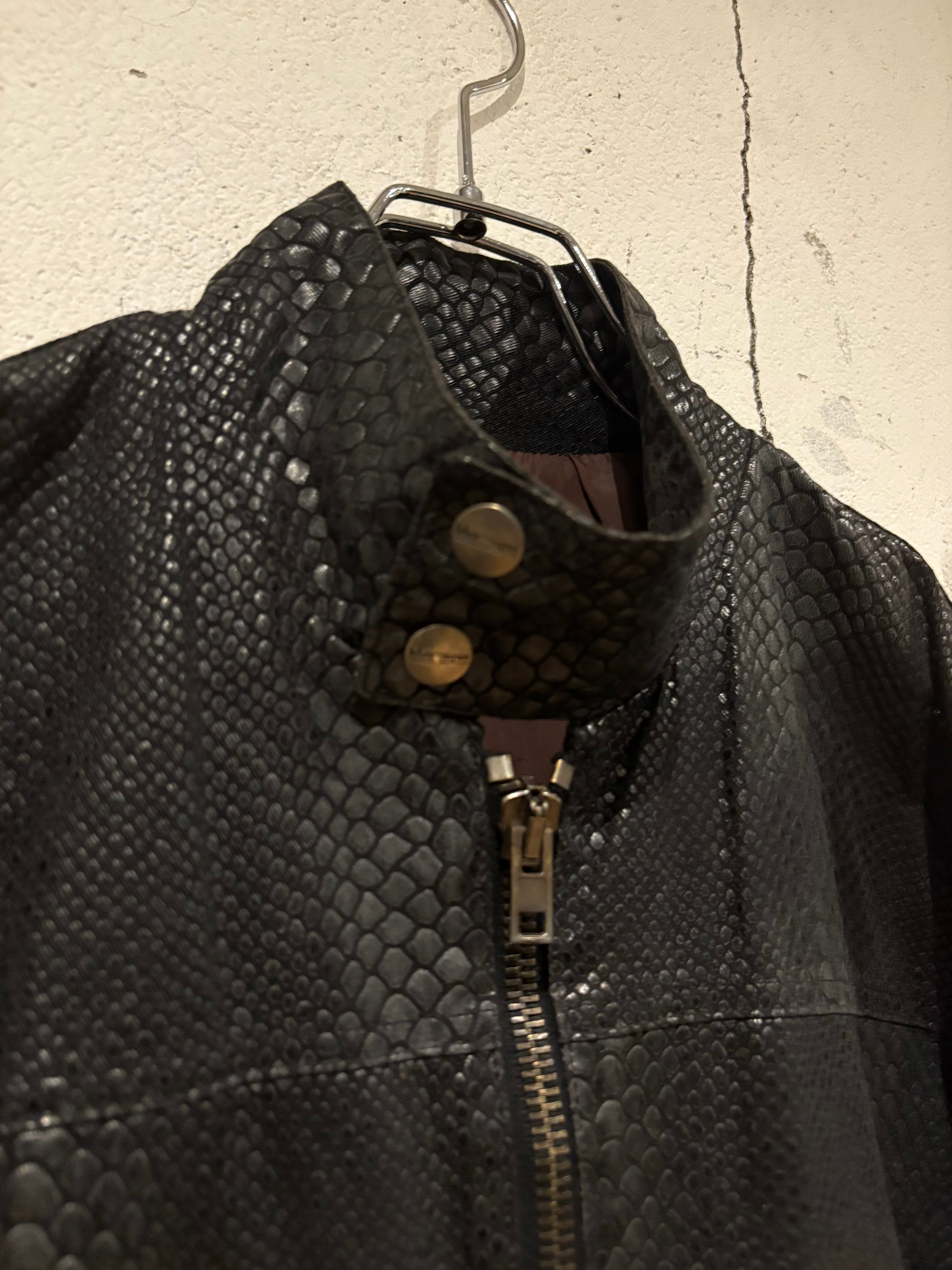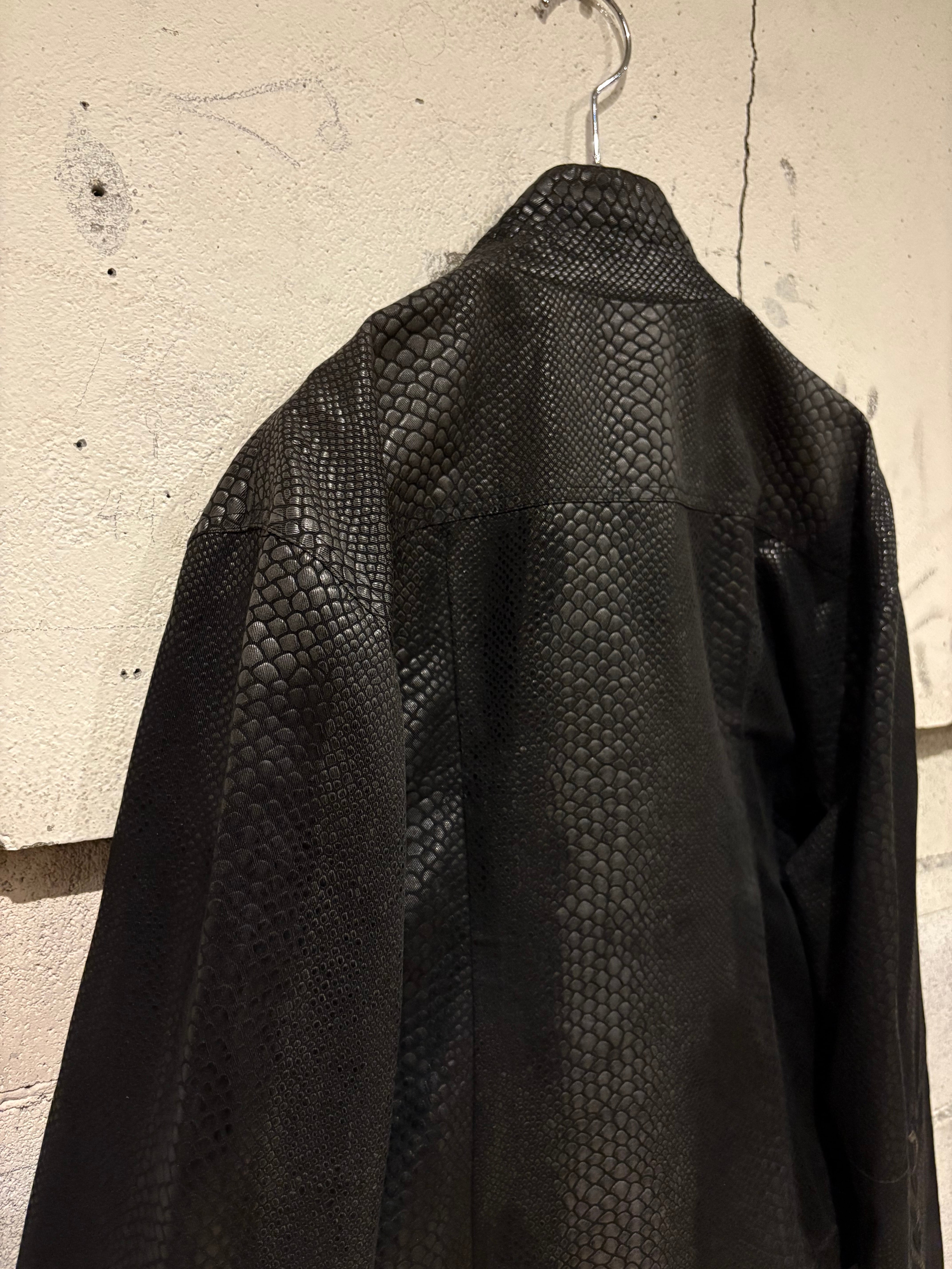 タフかつコシのあるブラックのボディに、鈍く光沢を放つクロコダイル調のコーティングを施し、レザーライクな風合いに仕上げたジャケット。