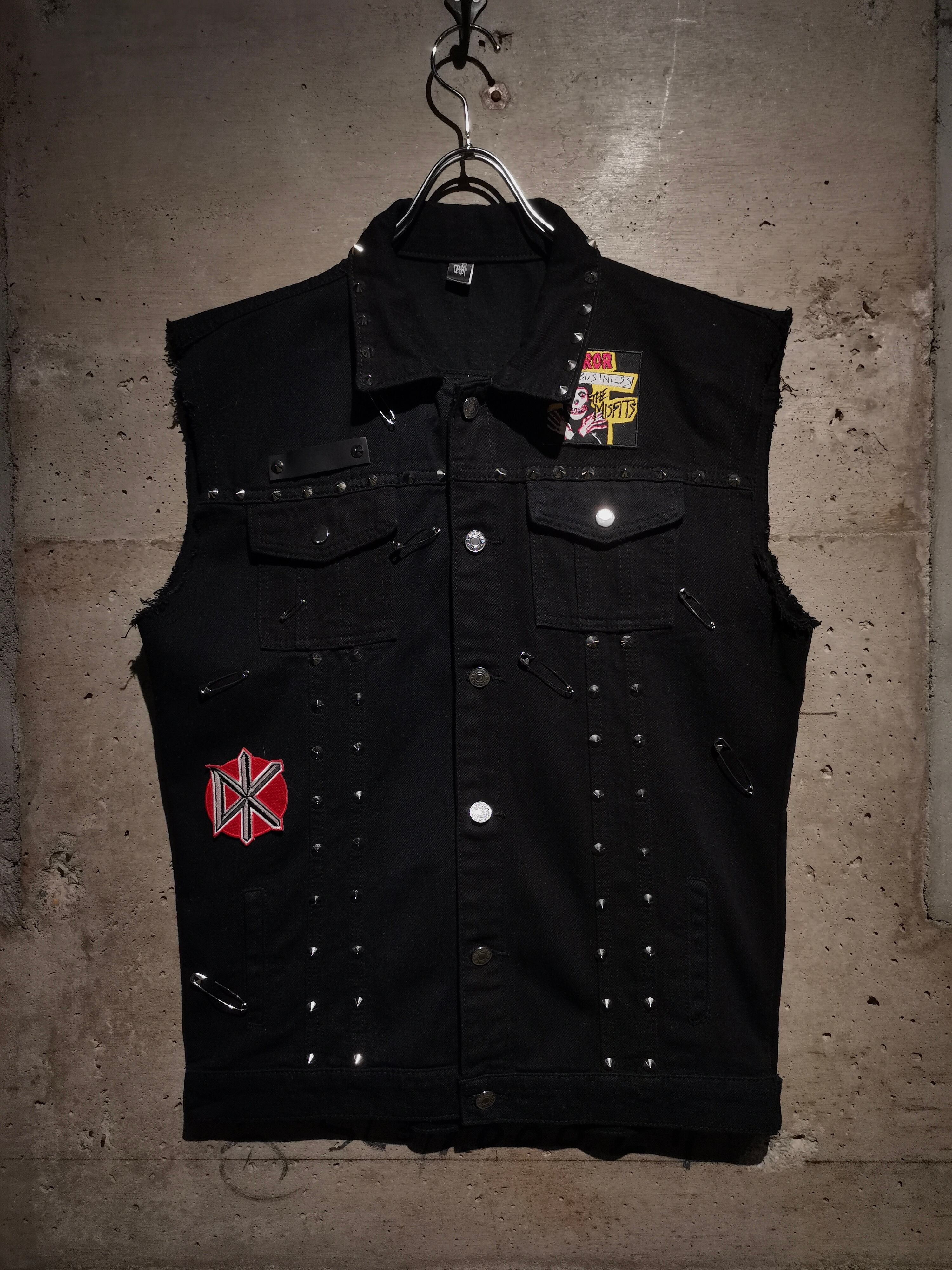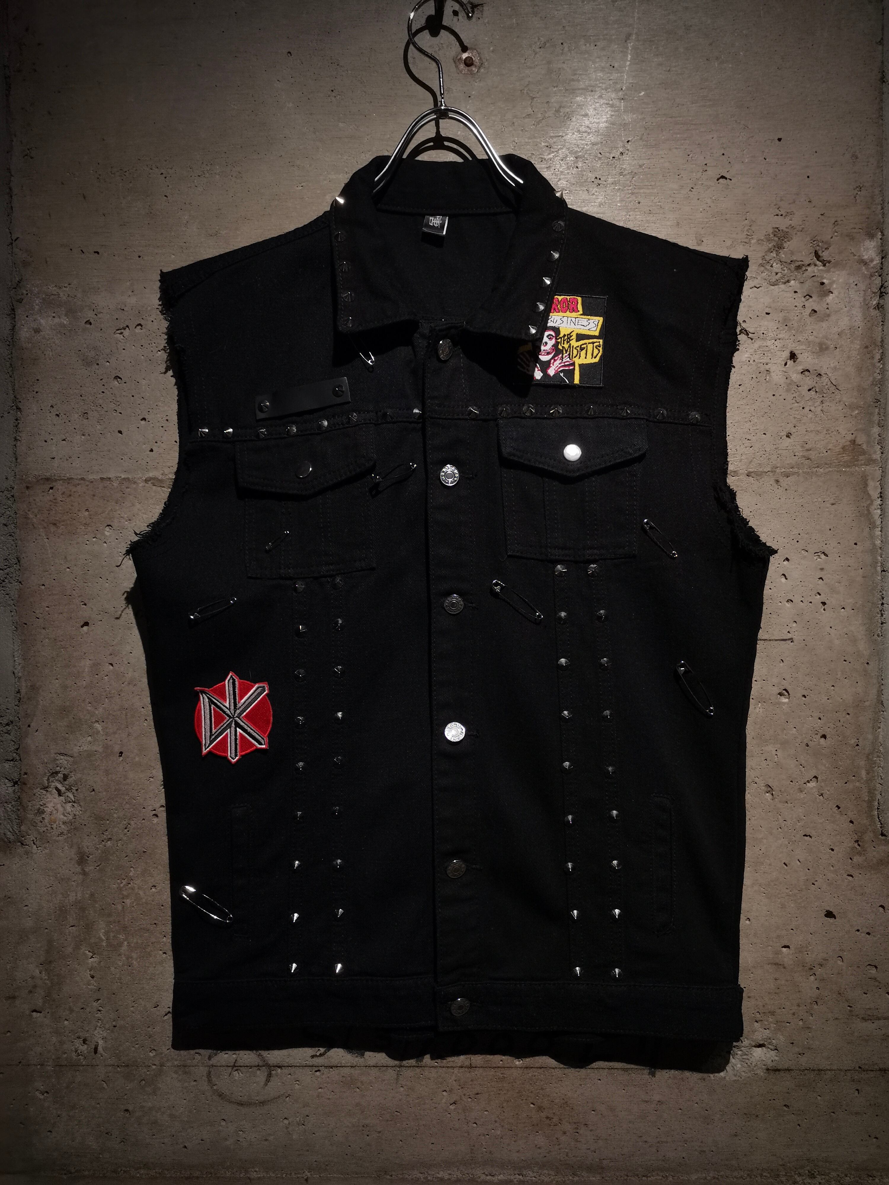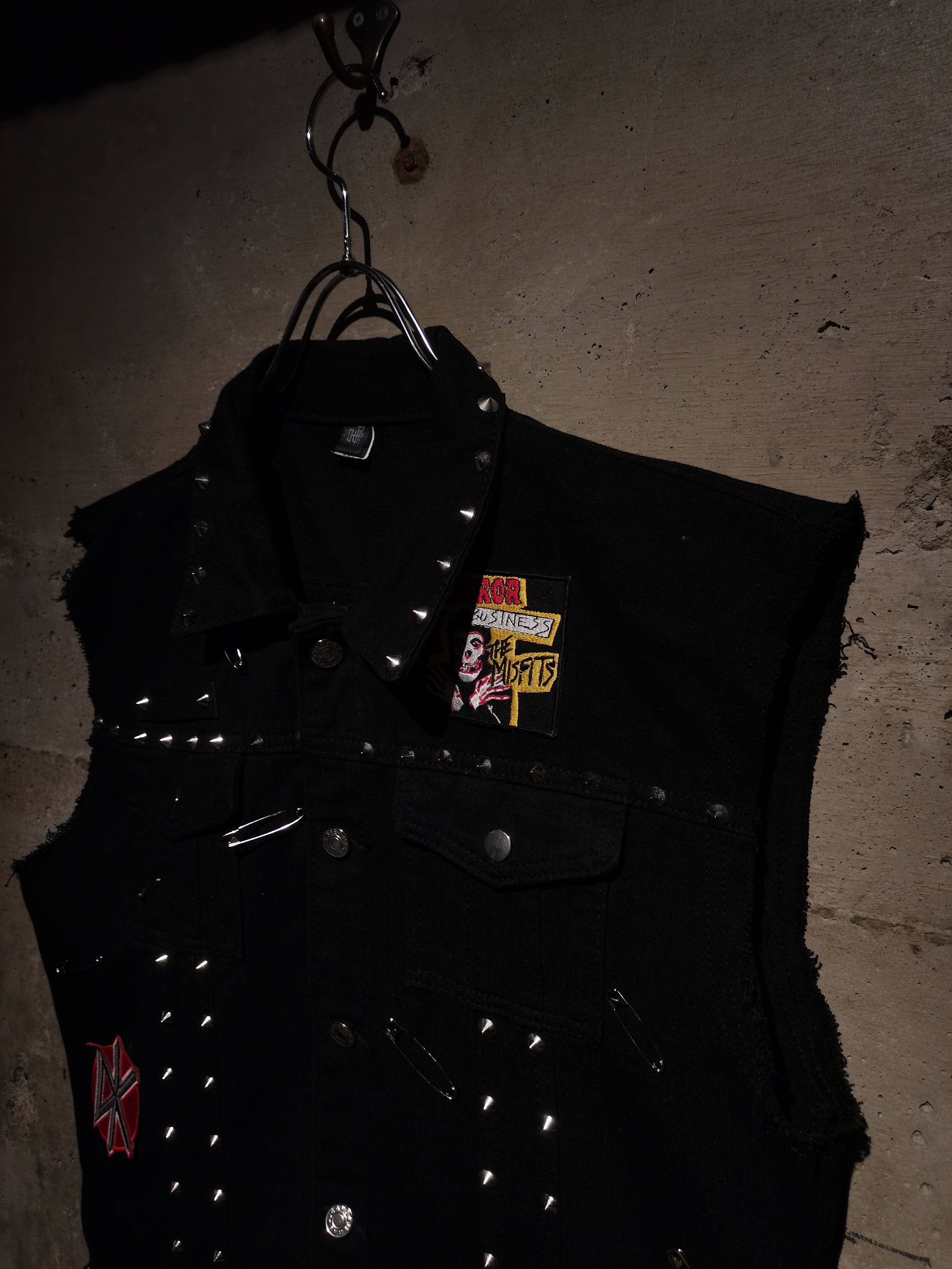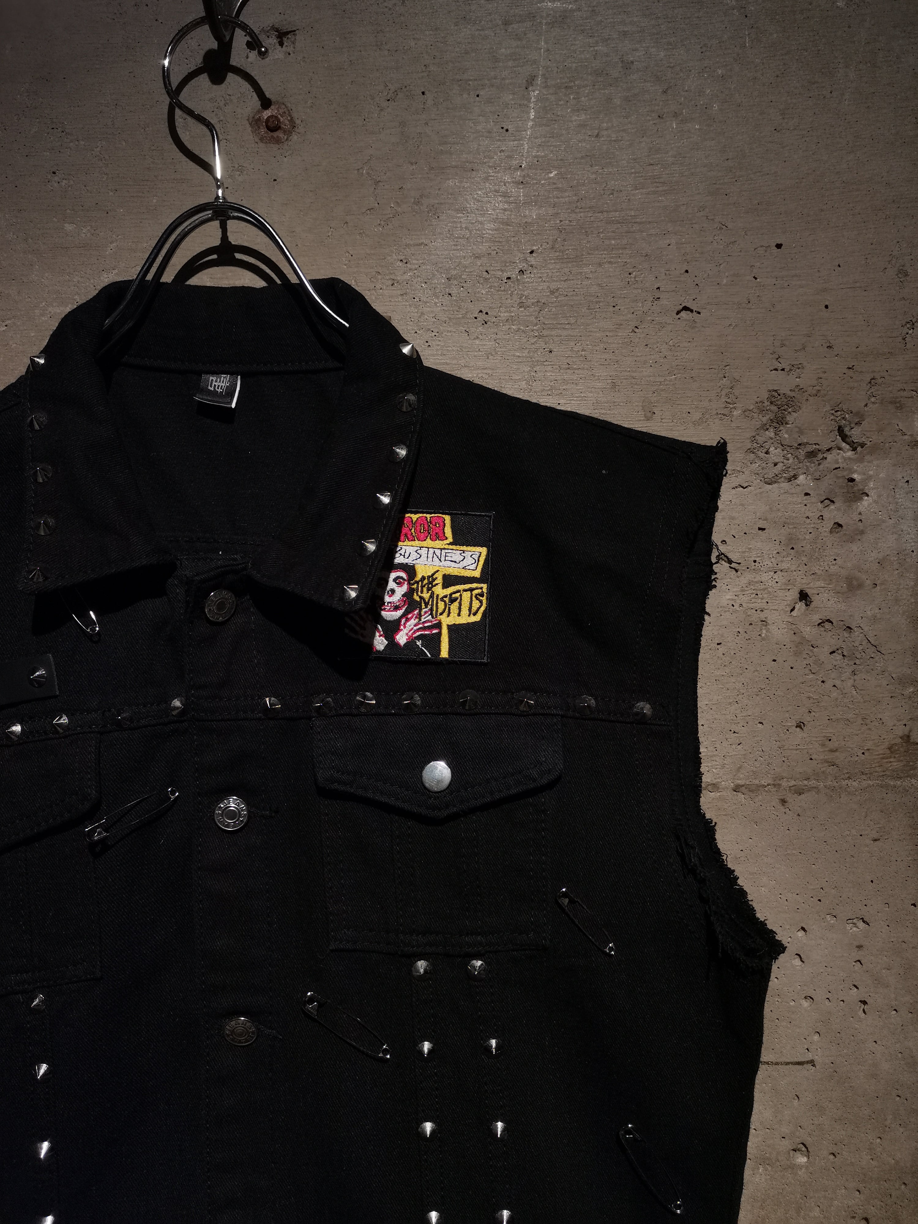 色残りの良いブラックのデニムをベースに、無数のスタッズや安全ピン、ミスフィッツやデッド・ケネディーズのパッチを施したデニムベスト。全所有者の好みや尖り具合が見て取れる古着ならではの1着に仕上がっています。