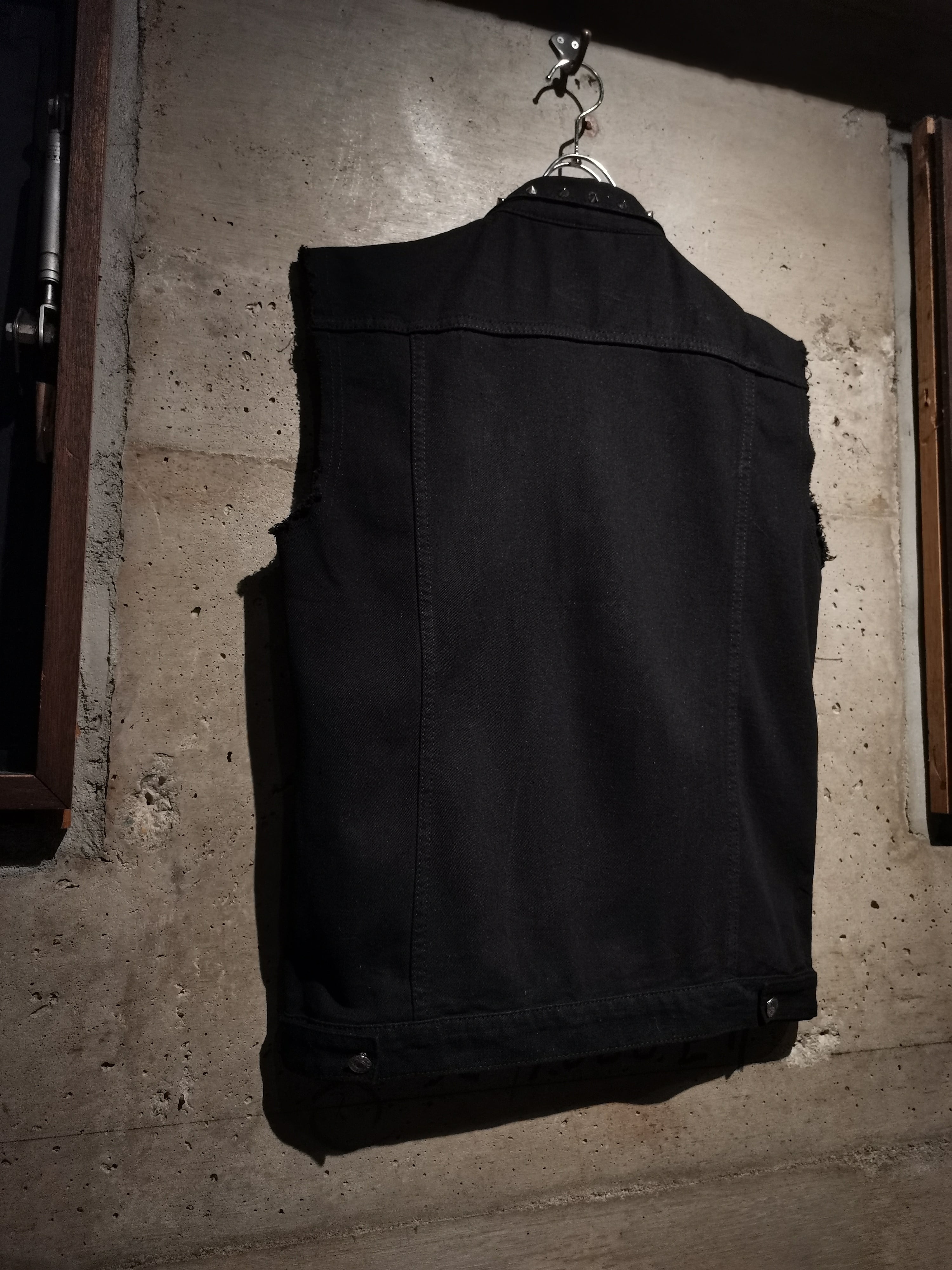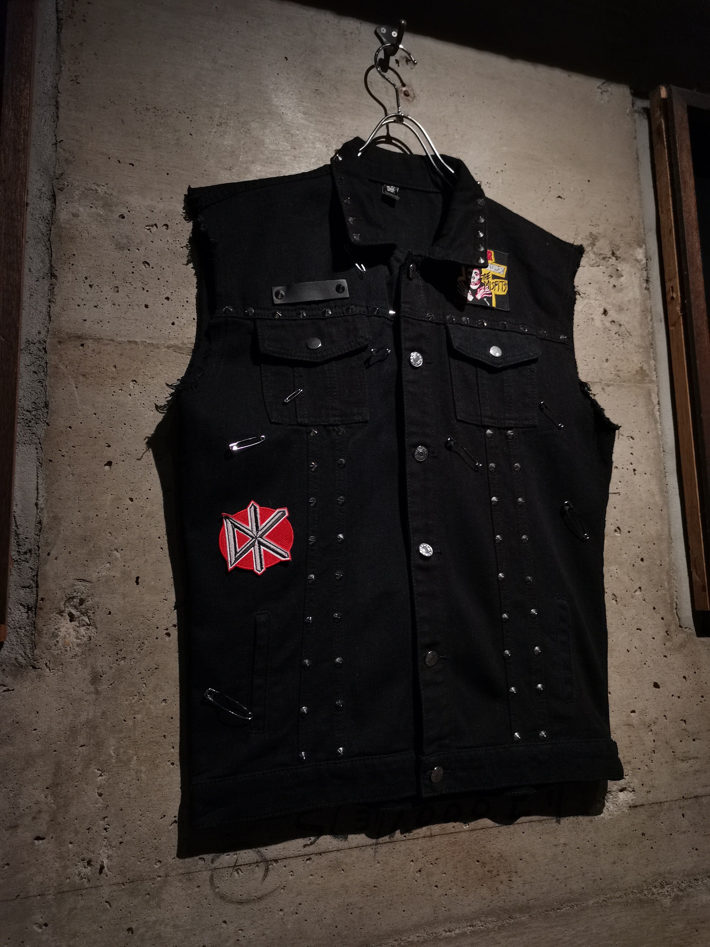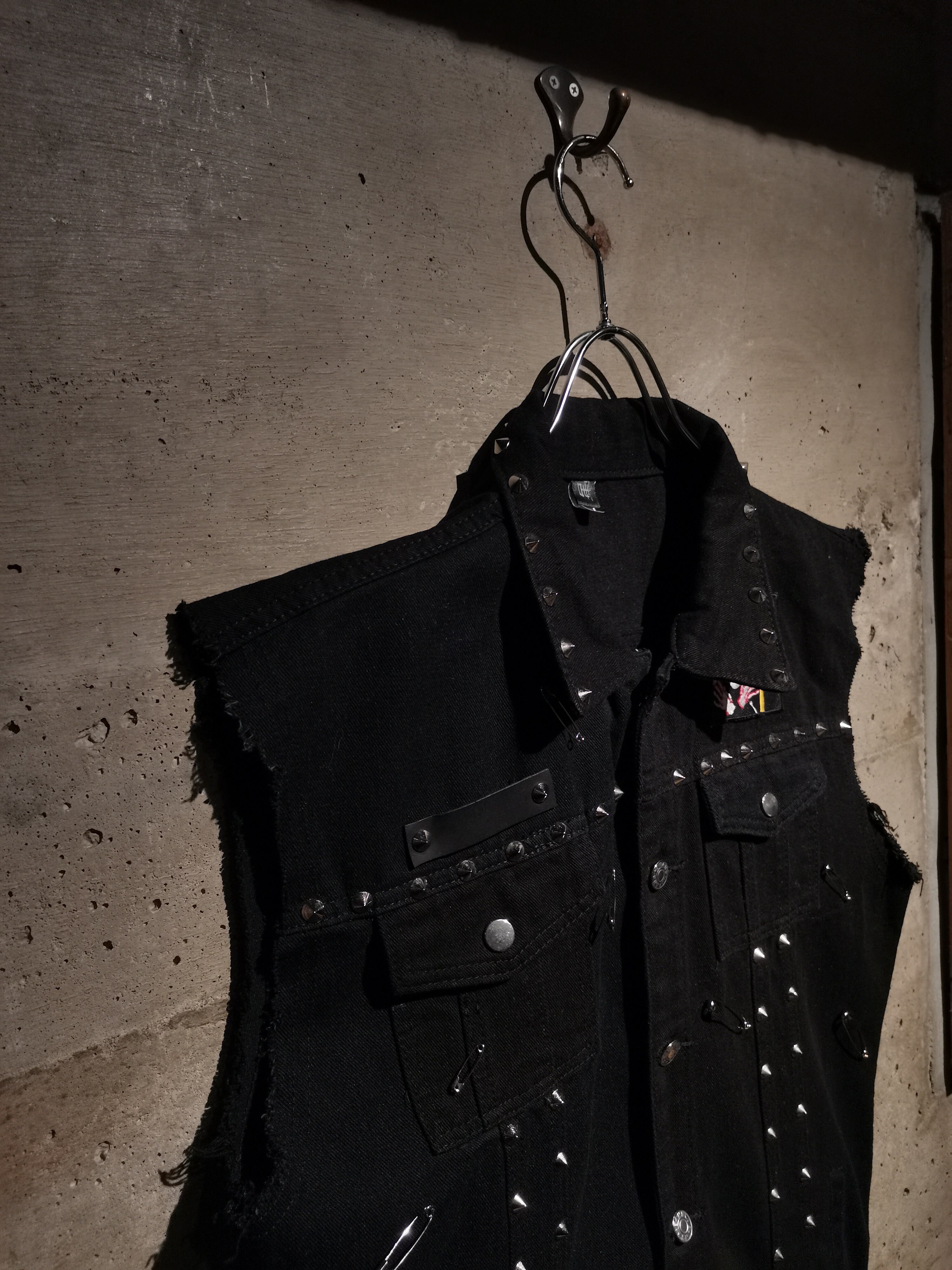 色残りの良いブラックのデニムをベースに、無数のスタッズや安全ピン、ミスフィッツやデッド・ケネディーズのパッチを施したデニムベスト。全所有者の好みや尖り具合が見て取れる古着ならではの1着に仕上がっています。
