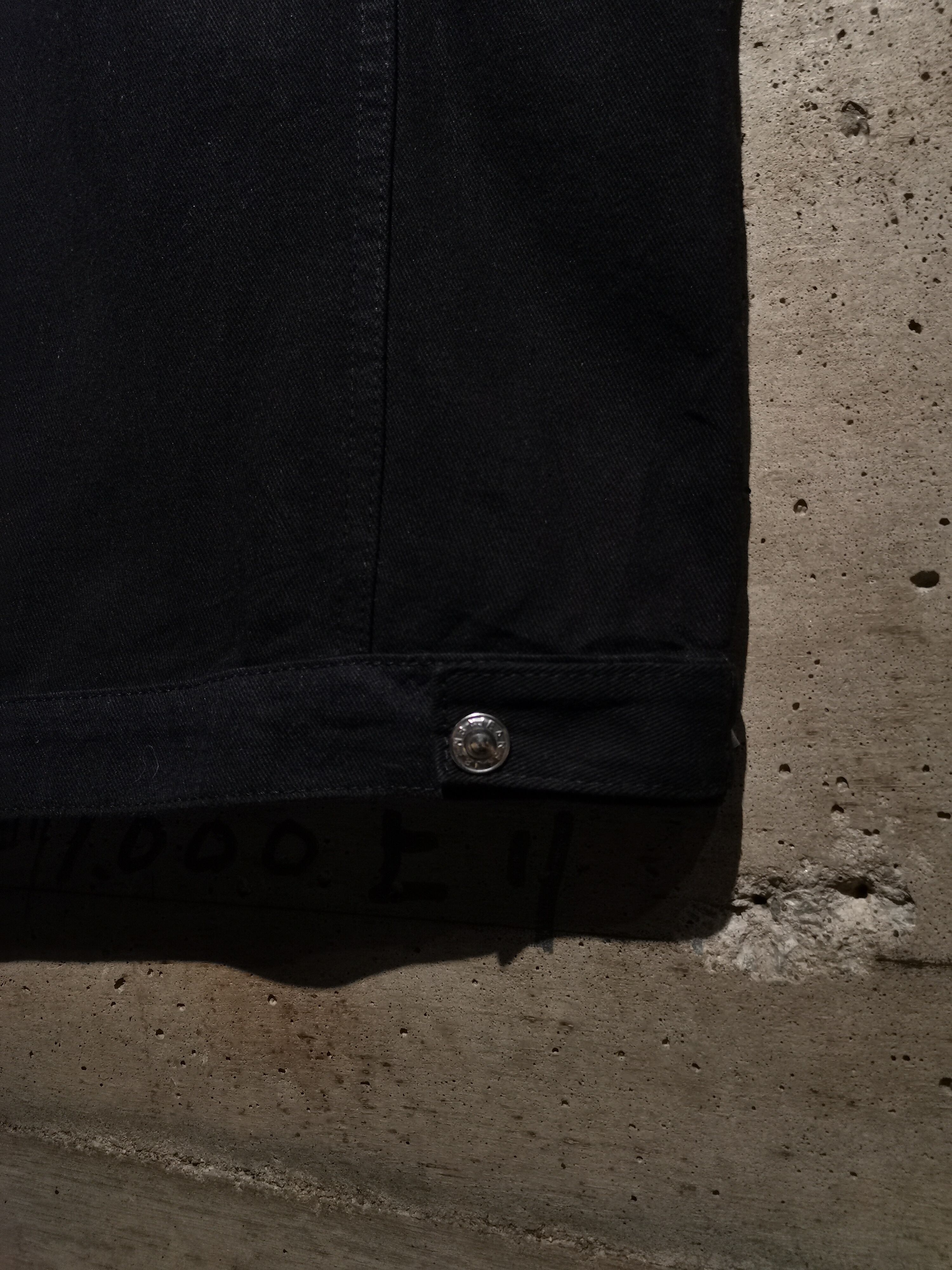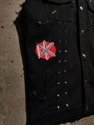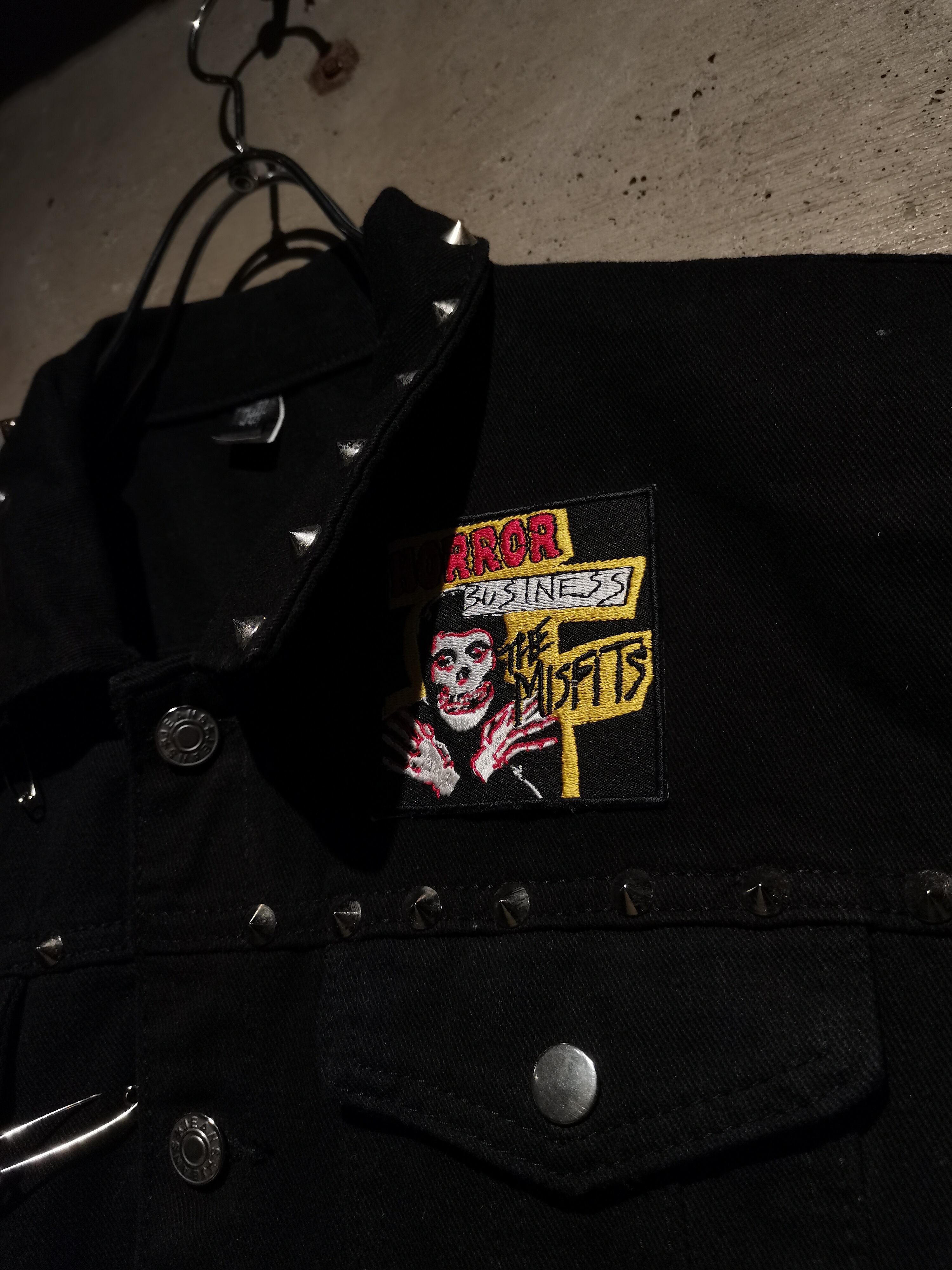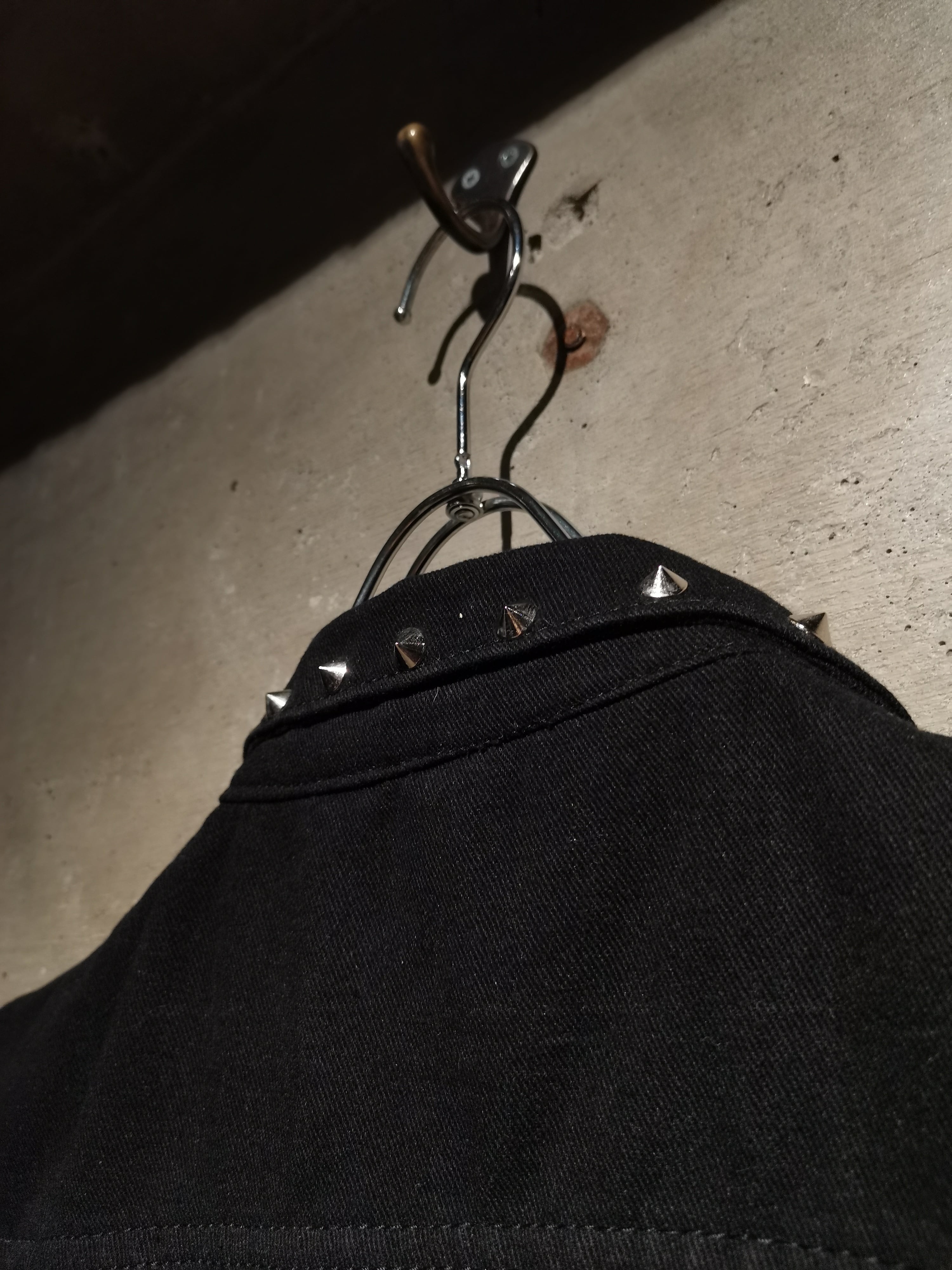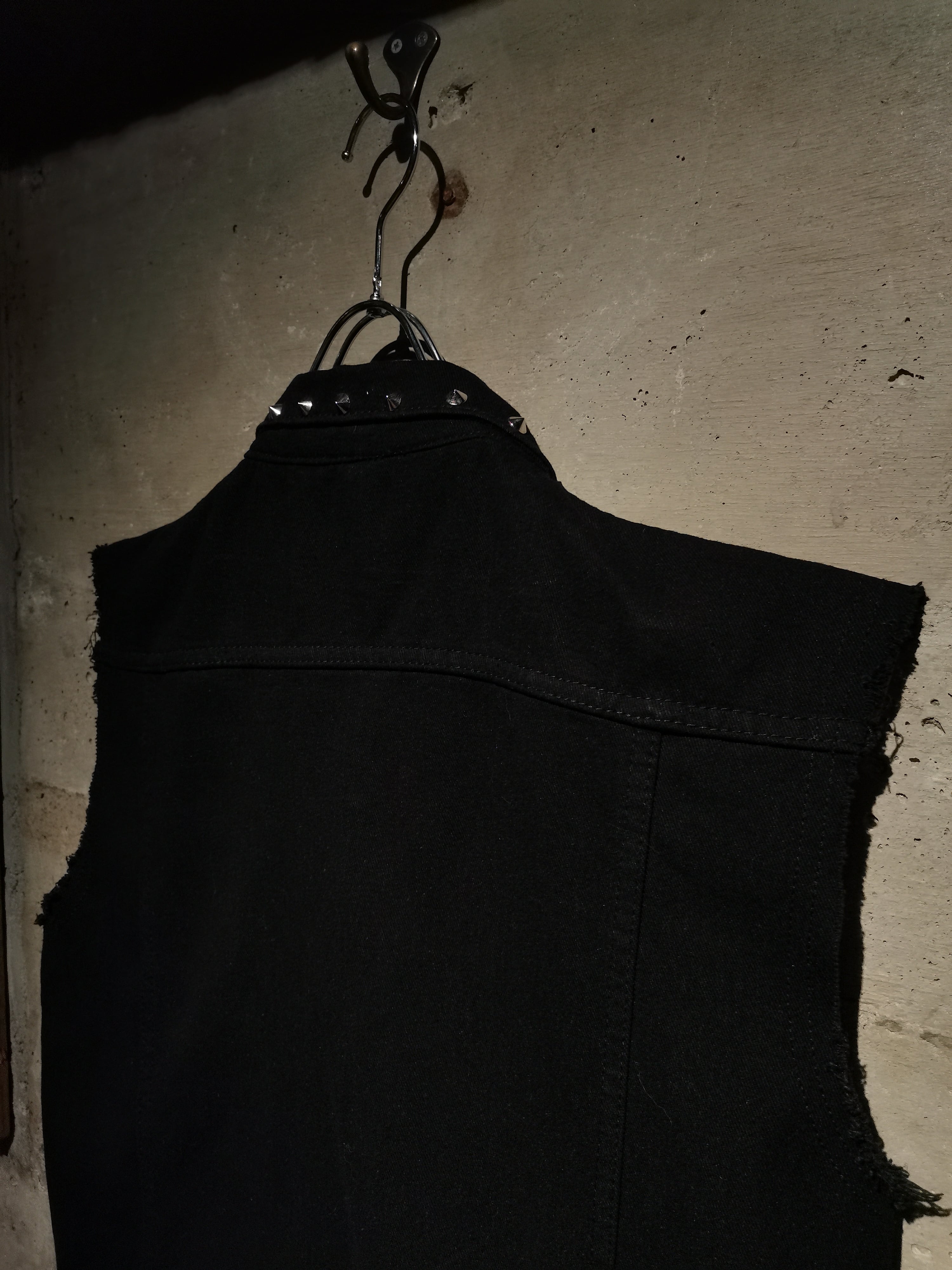 色残りの良いブラックのデニムをベースに、無数のスタッズや安全ピン、ミスフィッツやデッド・ケネディーズのパッチを施したデニムベスト。全所有者の好みや尖り具合が見て取れる古着ならではの1着に仕上がっています。