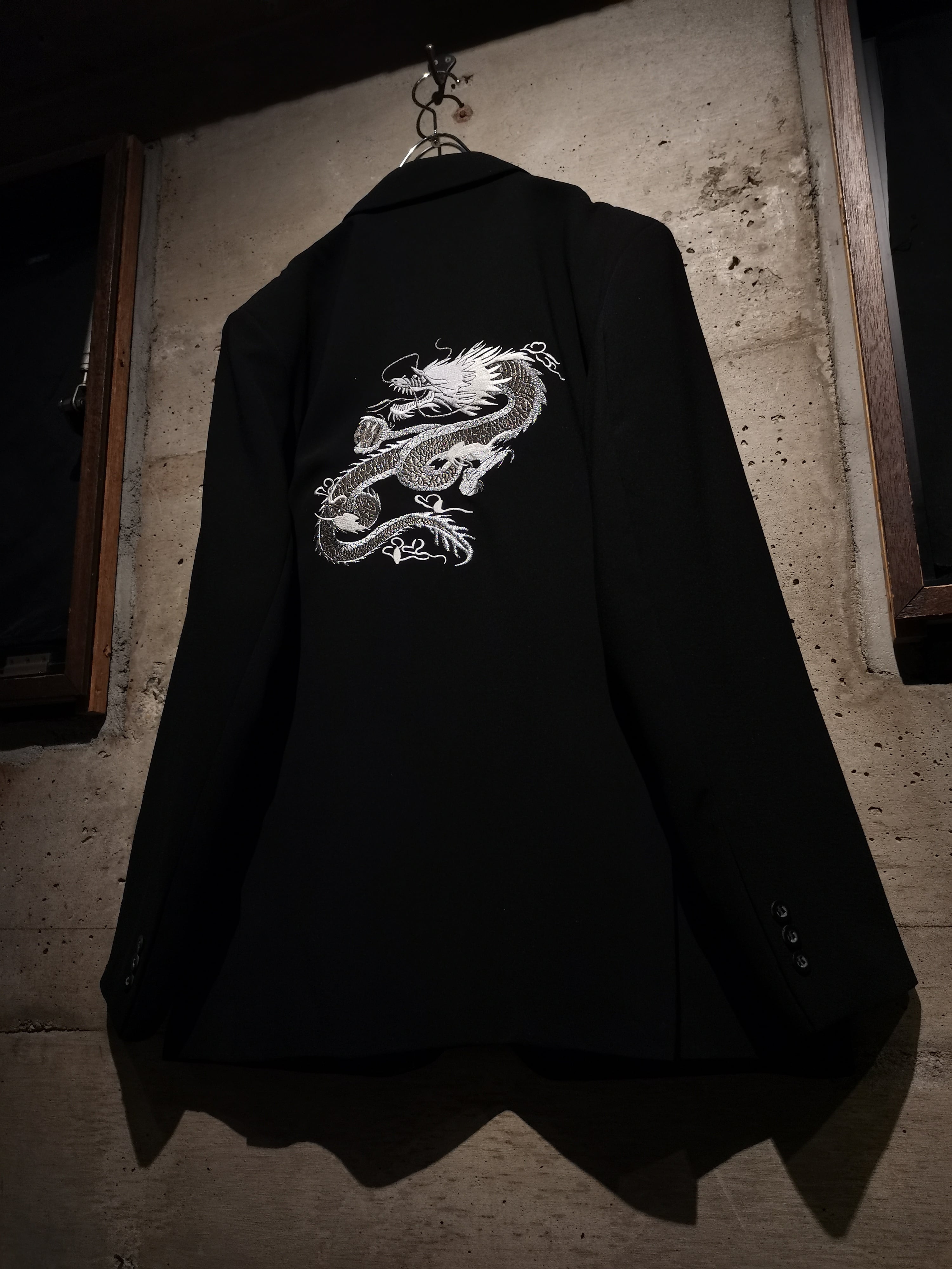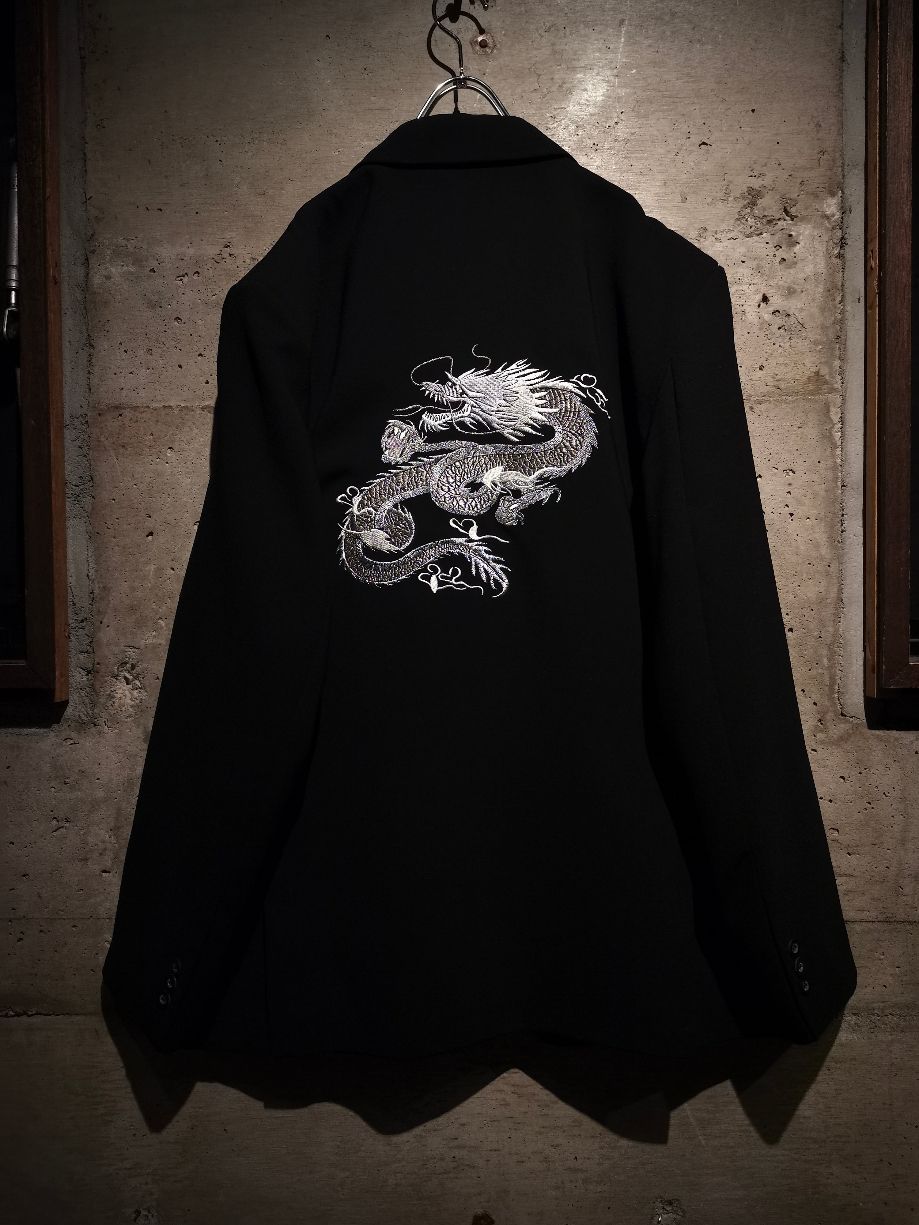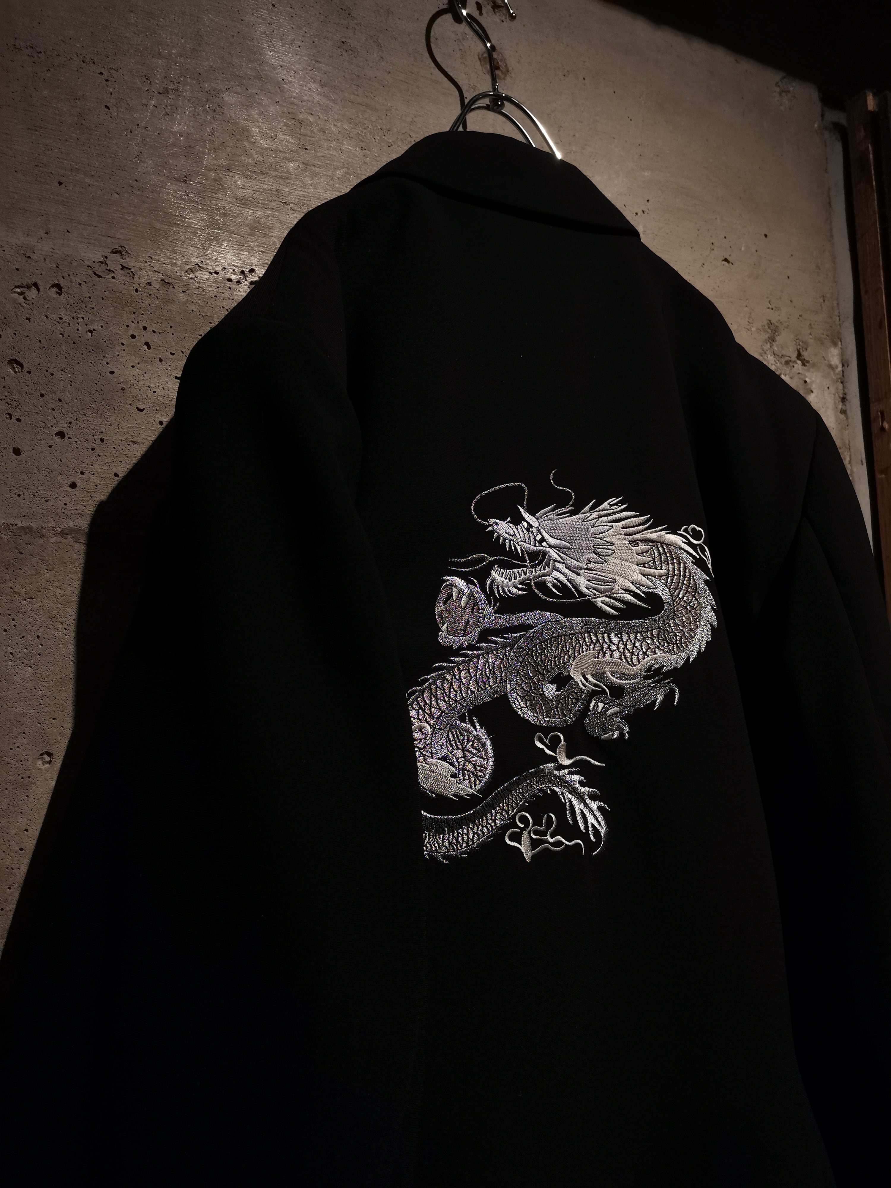 軽やかかつ滑らかな肌触りが心地良いブラックボディに、胸元と背面に緻密で繊細な銀色のドラゴンの刺繍を施したテーラードジャケット。