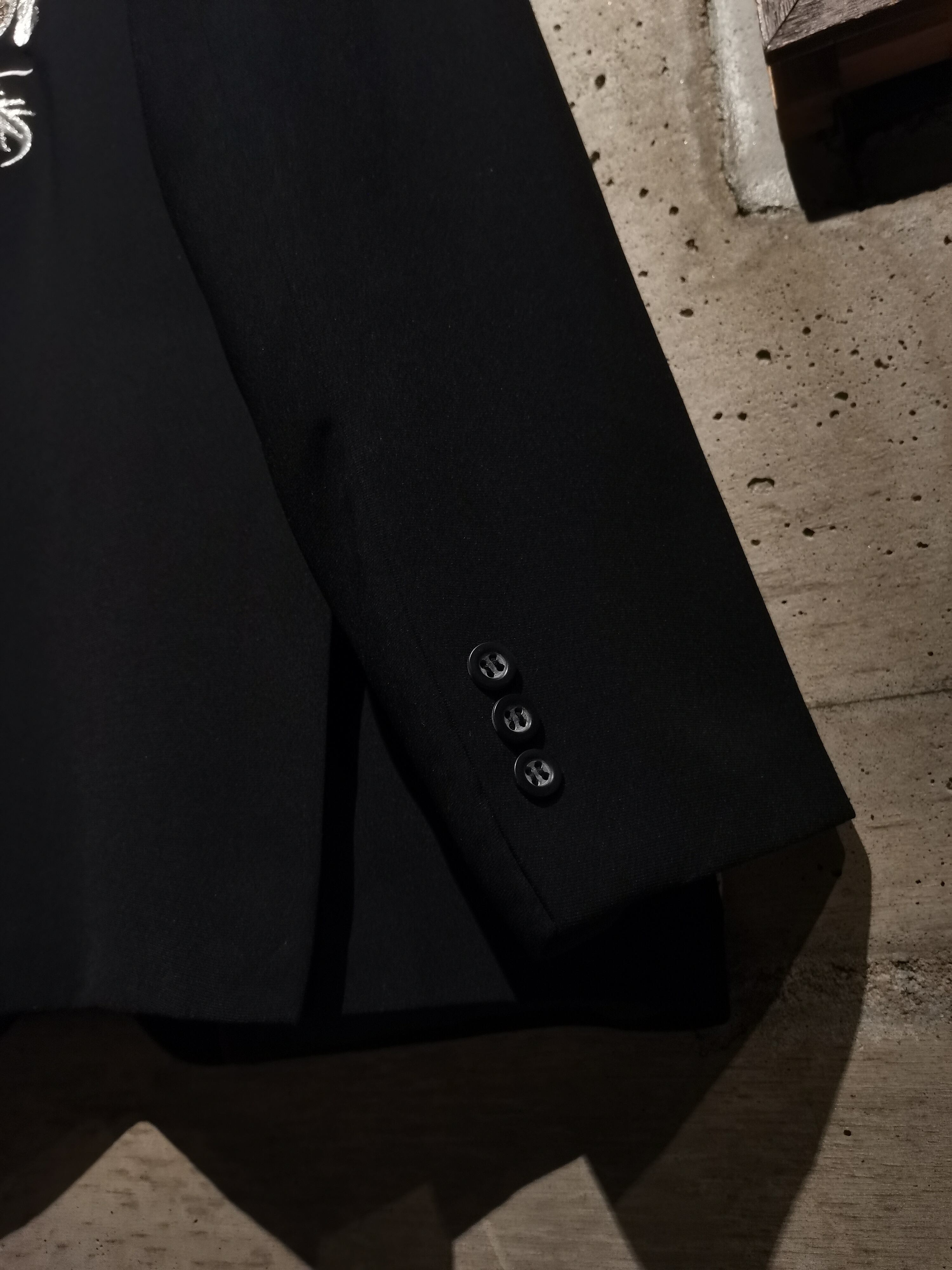 2つボタンのシングルブレスト、左胸、両サイドにポケットを配した、高級感を引き立てる洗練されたデザイン。刺繍部以外は無地のオールブラックなだけに、"背中で語る"という言葉を体現するかのようなアイテムで、街中で人々の視線を釘付けにすること間違いなしでしょう。