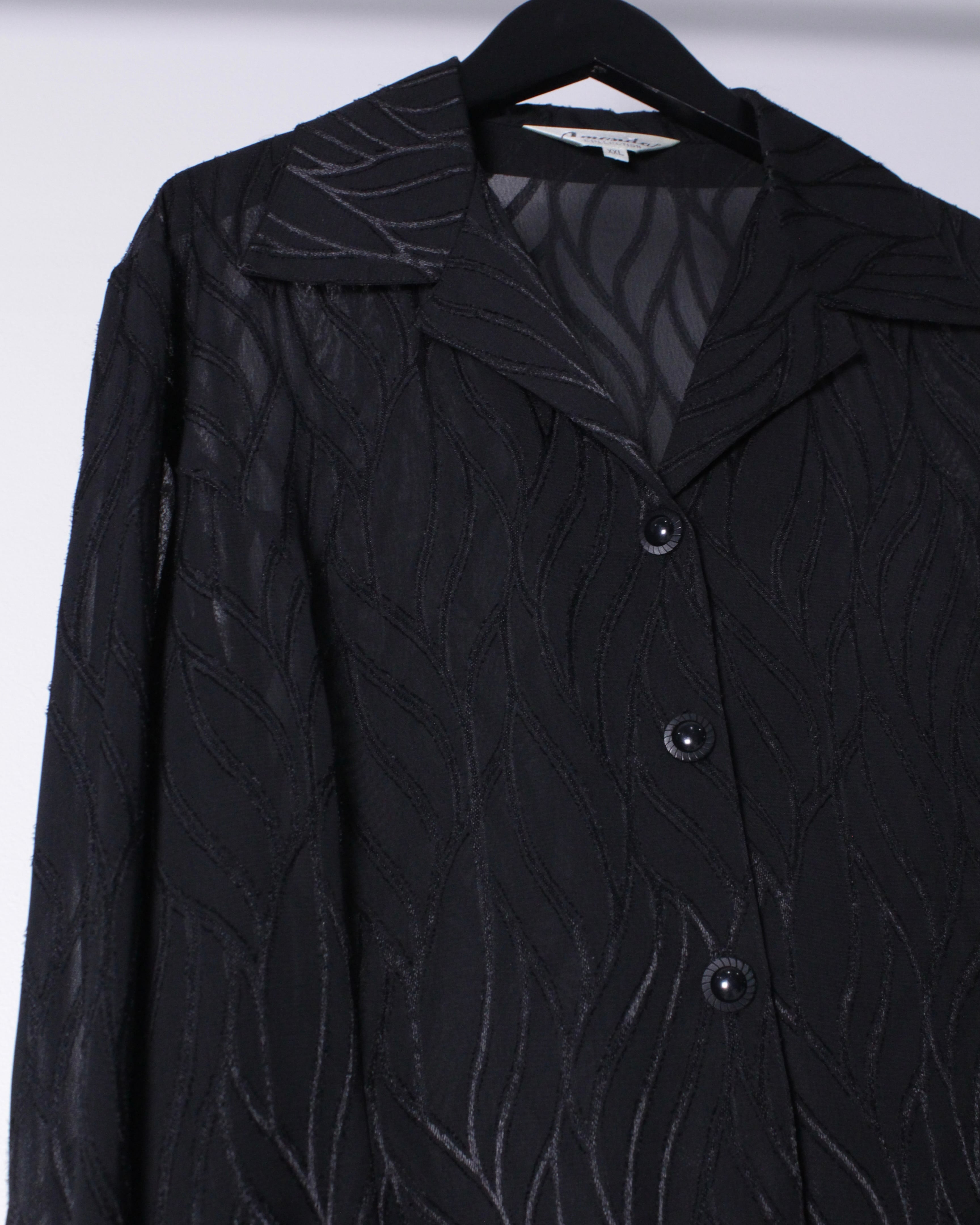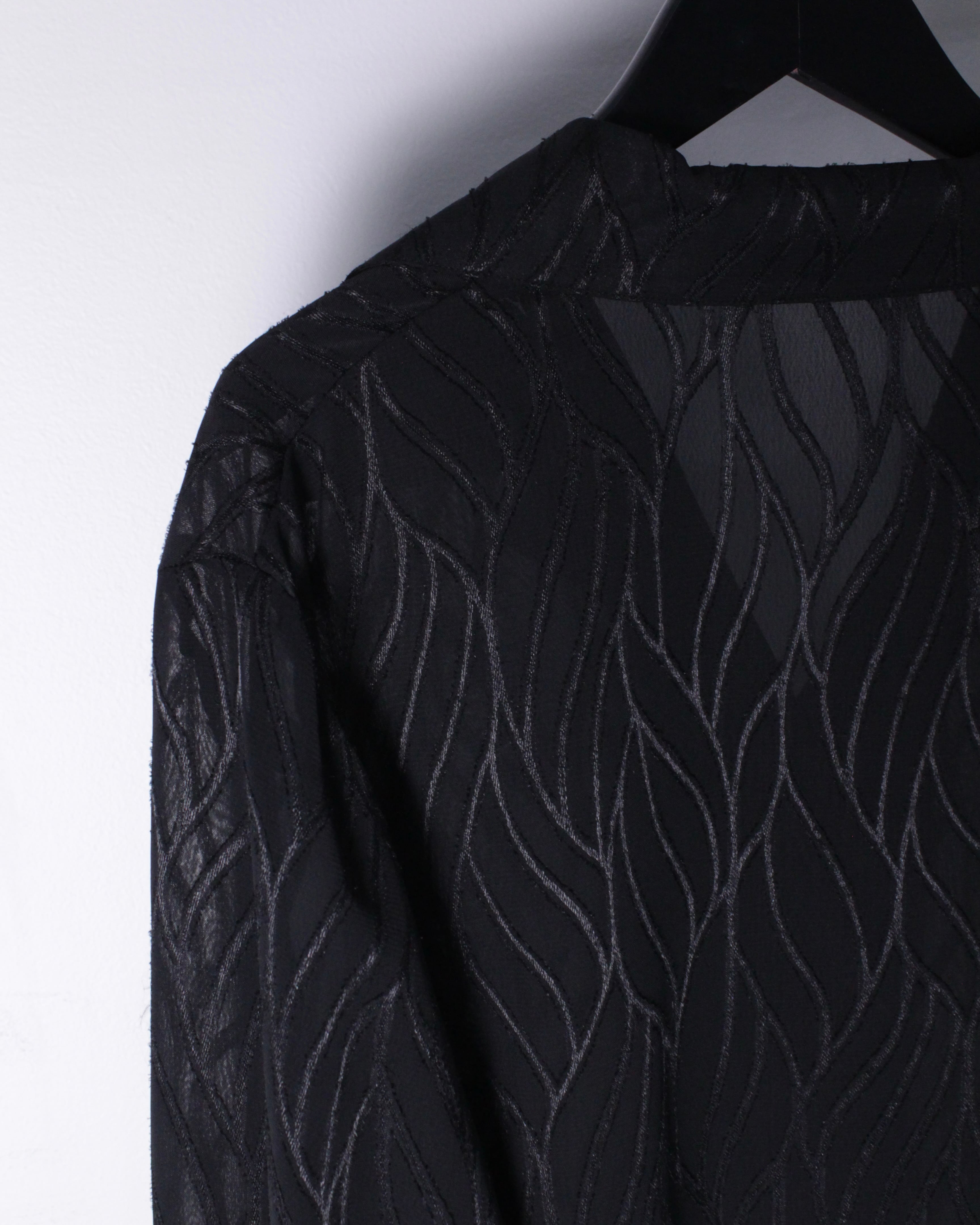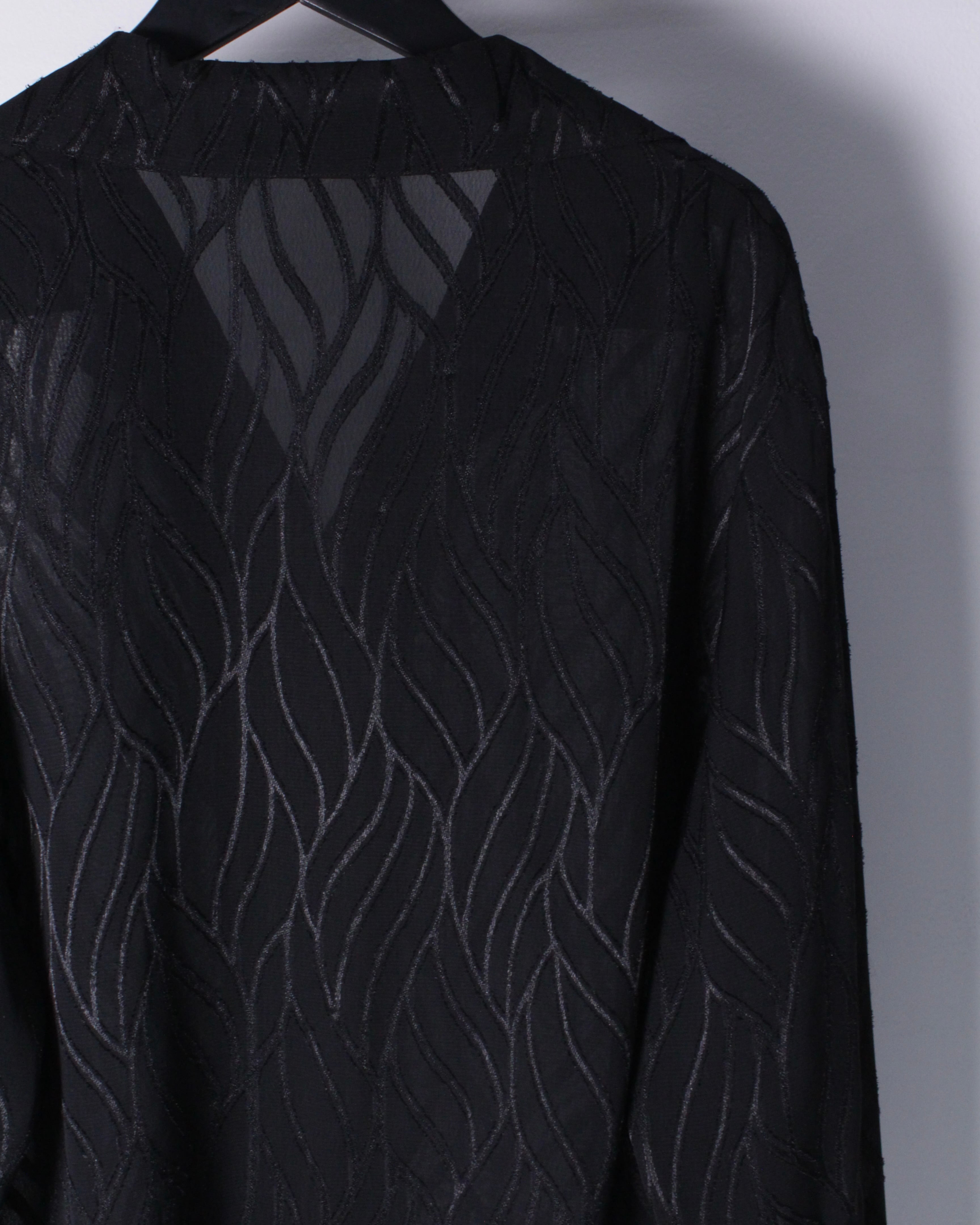 透け感の美しいブラックシアーに、ジャガード織りによってボタニカル調の柄模様を載せたシアーシャツジャケット。