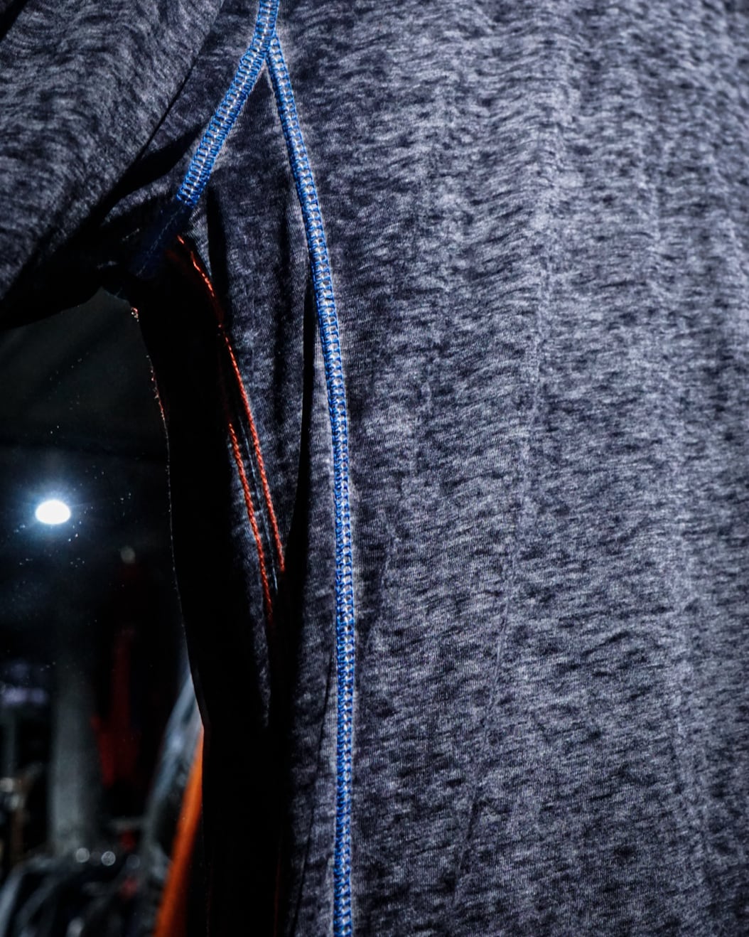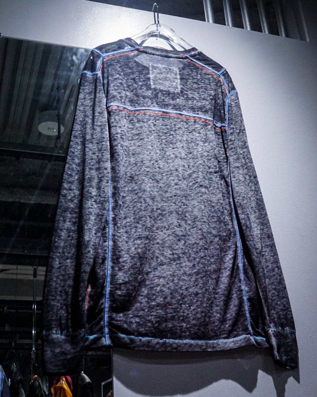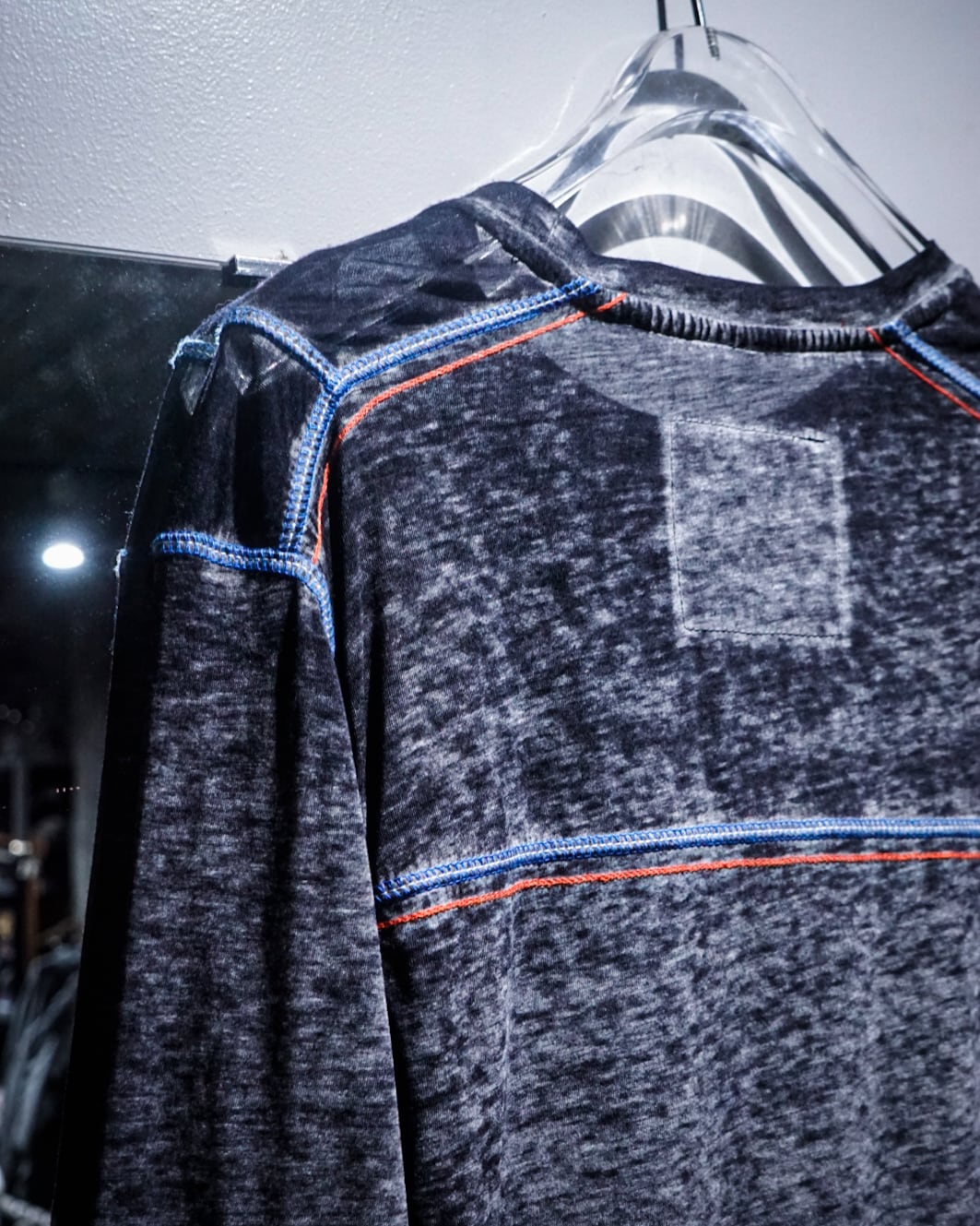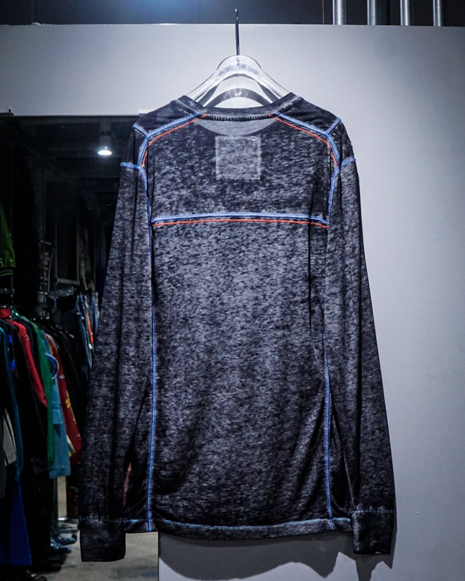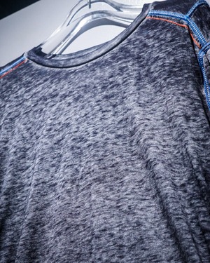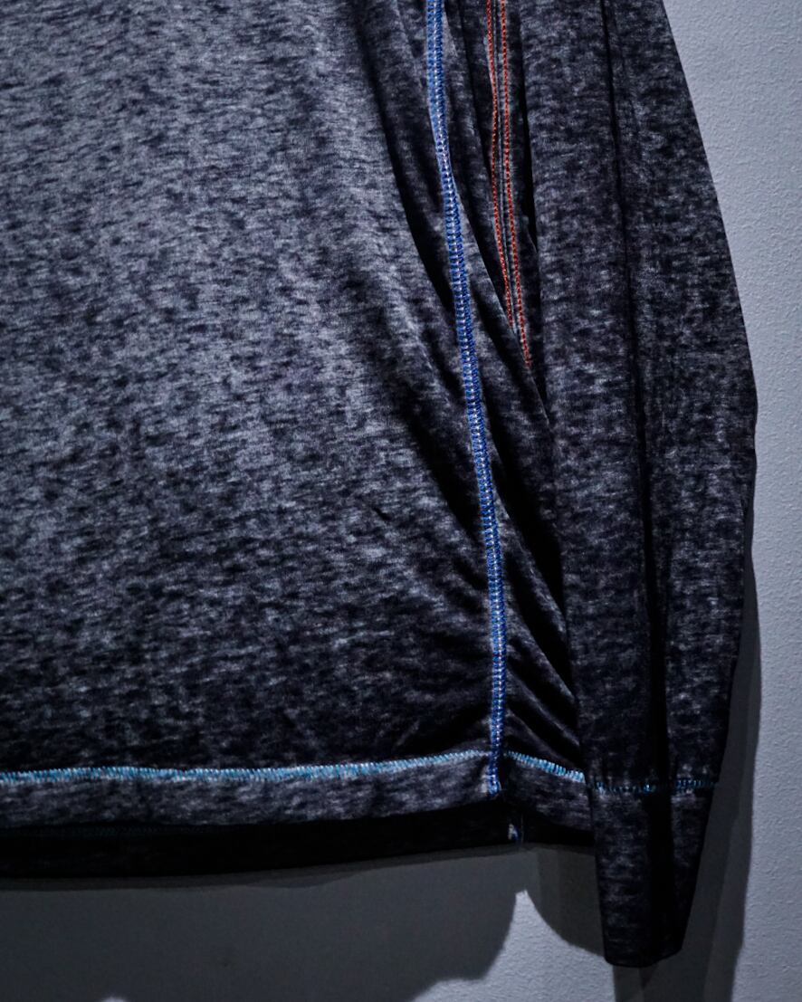 ブラックをベースとした霜降りボディに、赤×青のステッチを随所に施されたロングスリーブTシャツ。