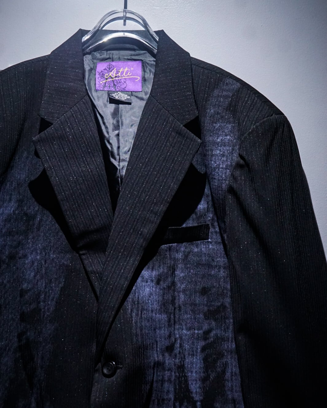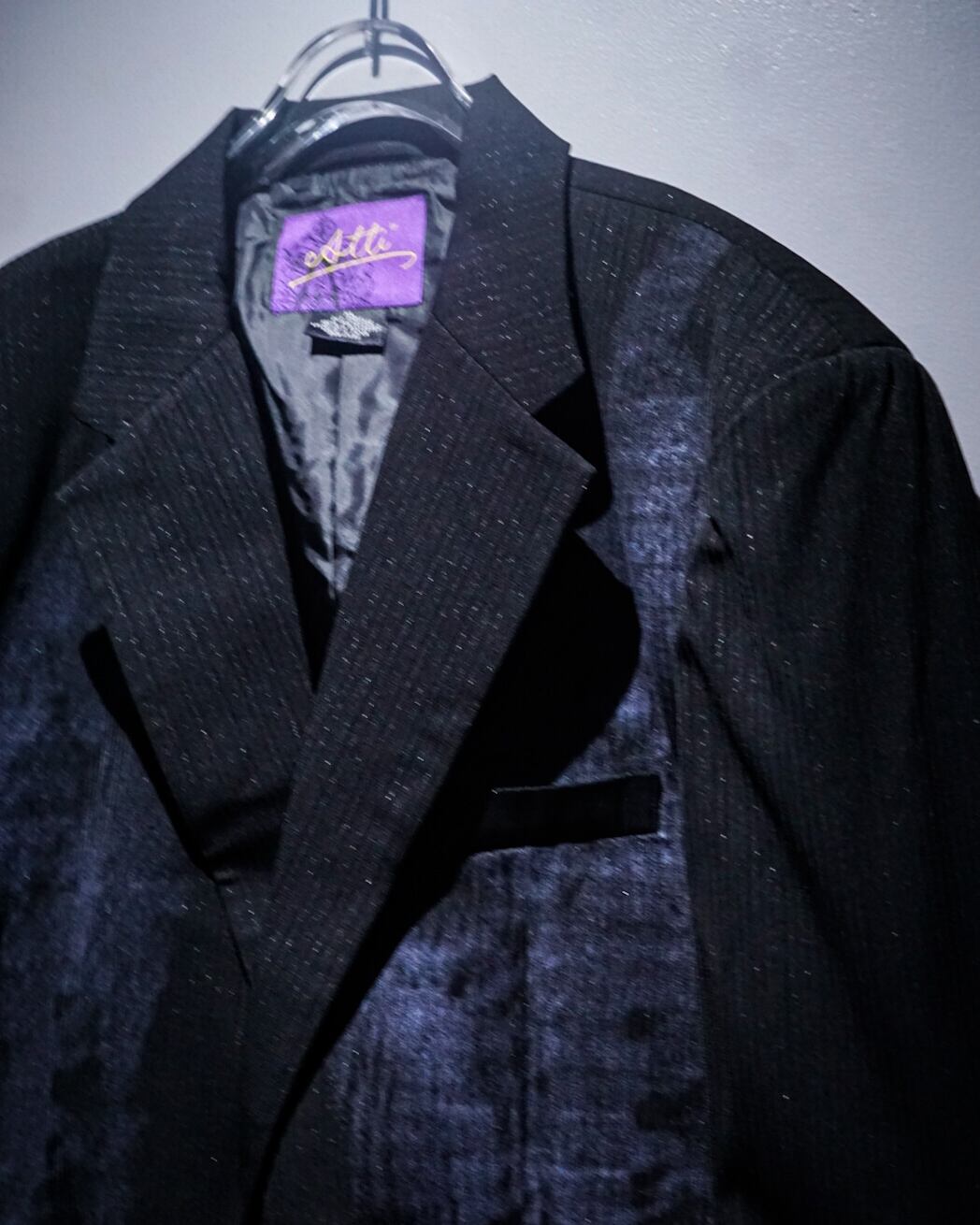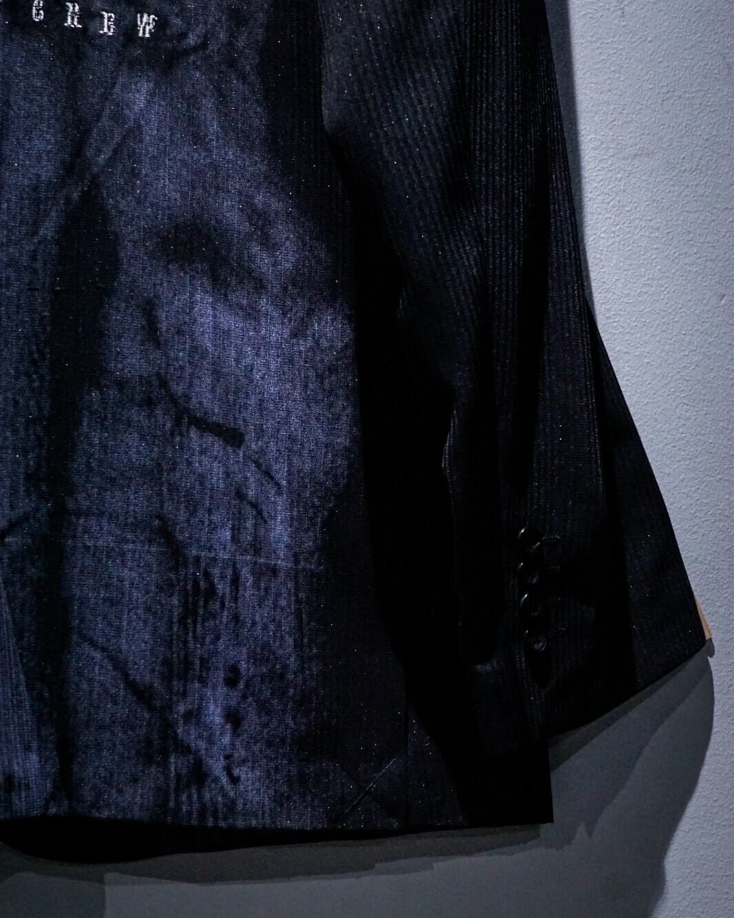 ラメ糸を織り交ぜたストライプをベースとしたブラックボディに背面クロスデザインを配置。さらに前身から後ろにかけシャドーを載せたデザイン性に溢れた1着。