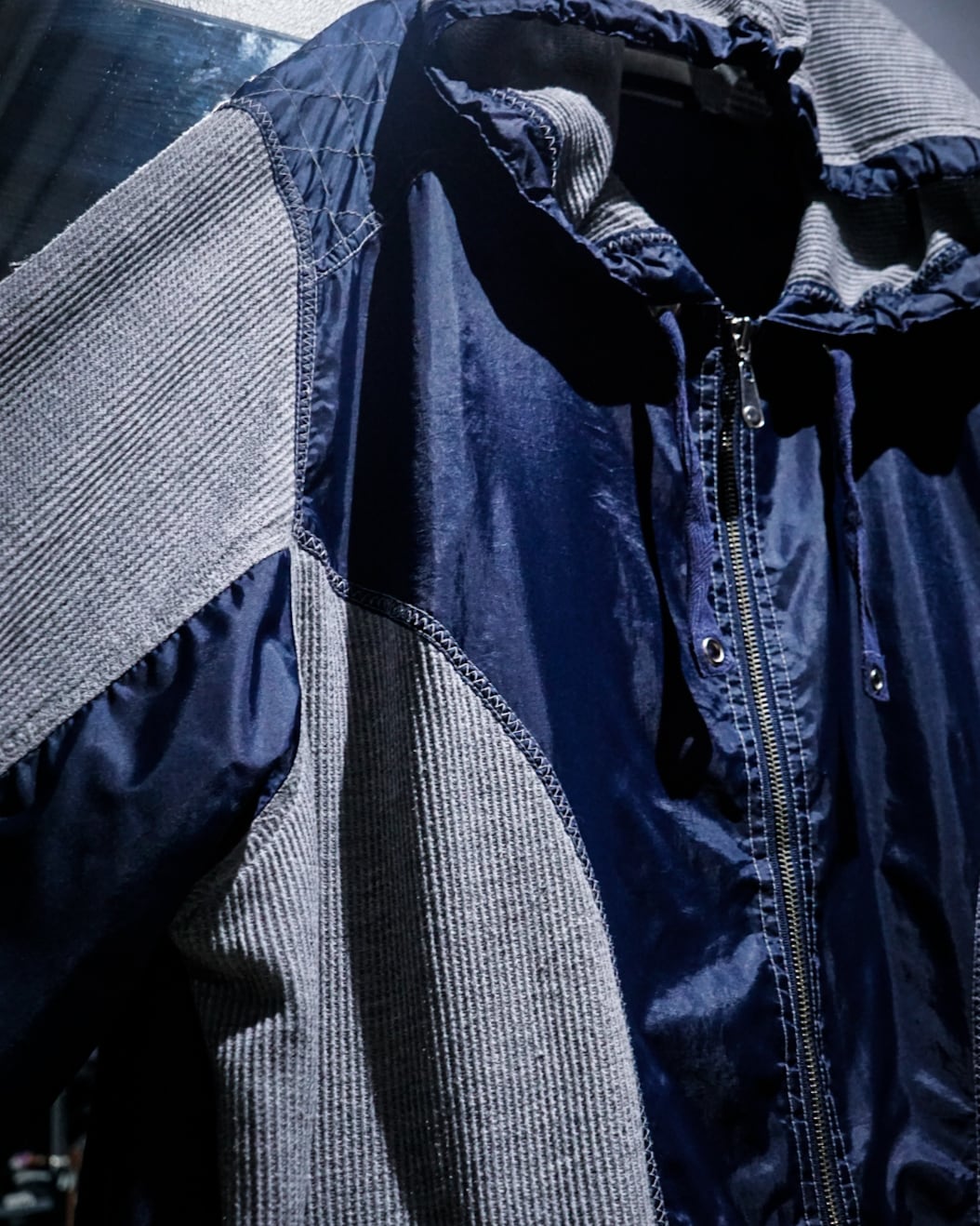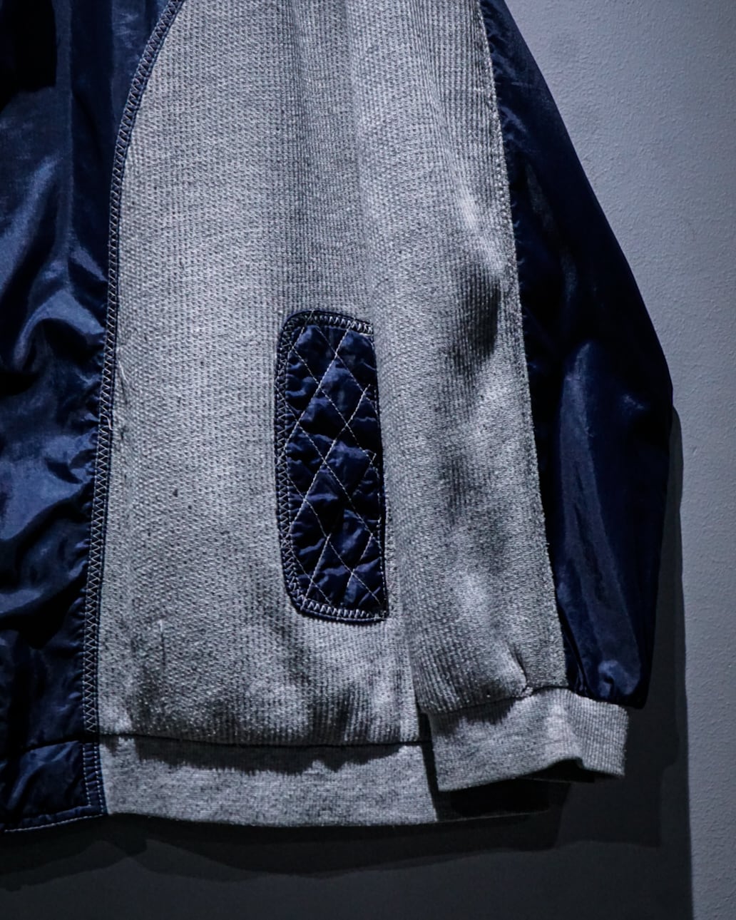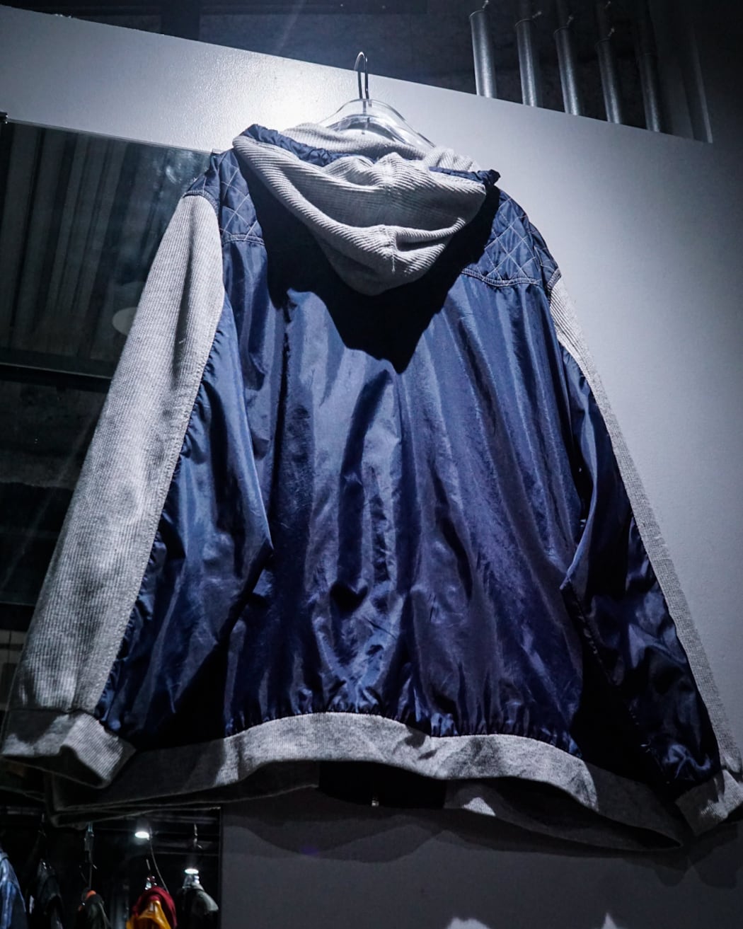 スウェット生地のマットな質感と、ナイロンの放つ鋭い光沢が全体に立体感を生み出し、素材の持つ特性をうまく掛け合わせたデザインが乙ですね…