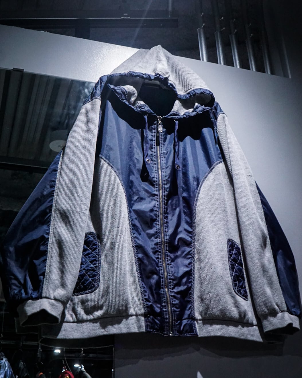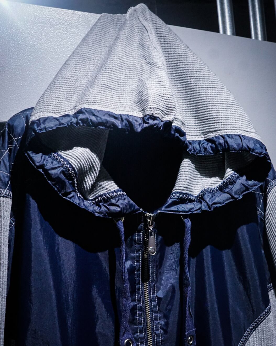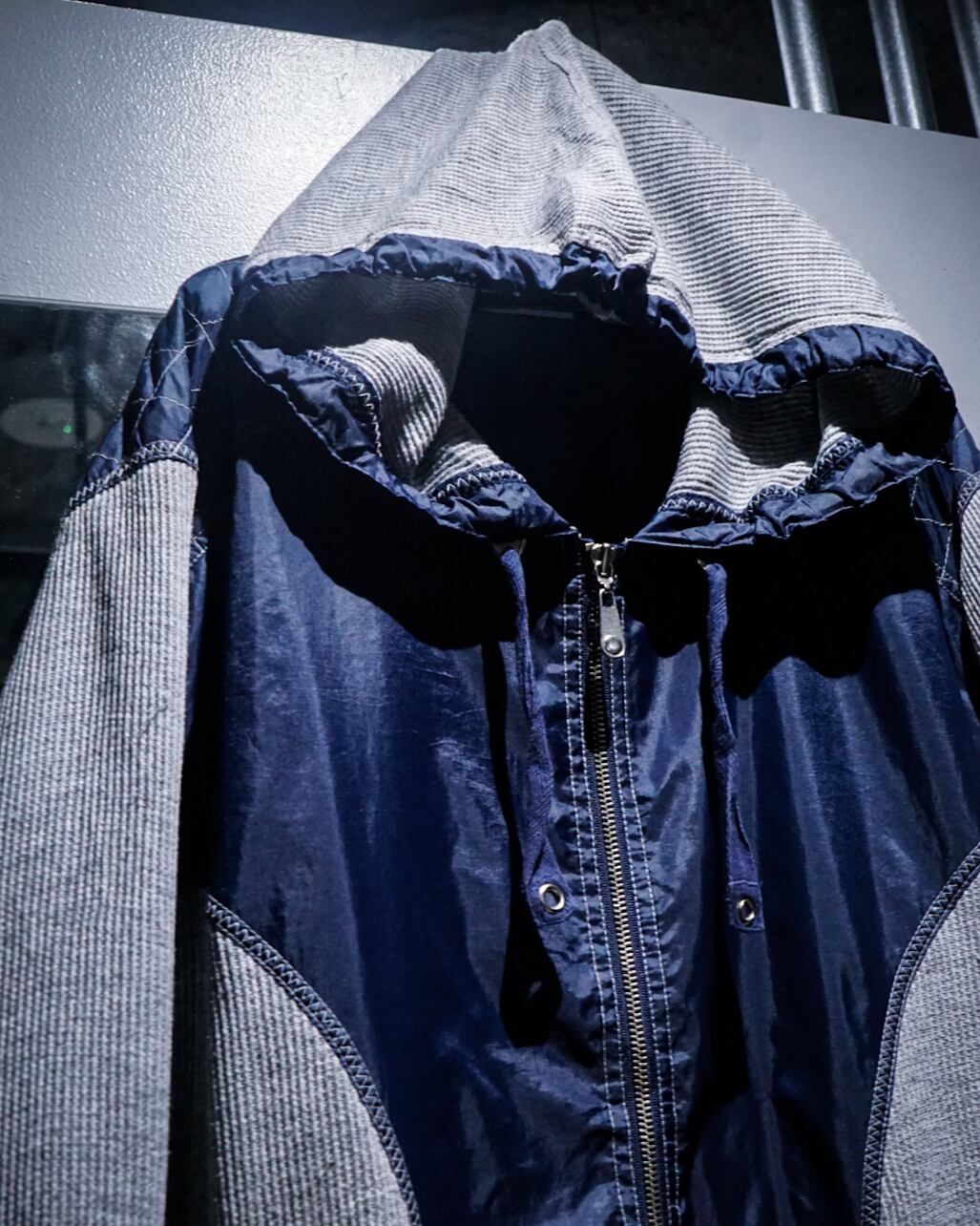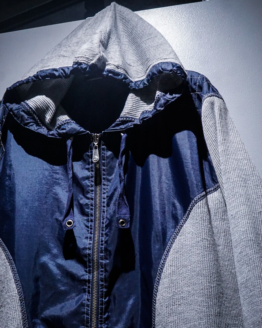 グレーのスウェットボディをベースとしフロントやバック、ポケットなど随所にナイロンを切り替え、異素材使いが目を引くジップフーディの1着。