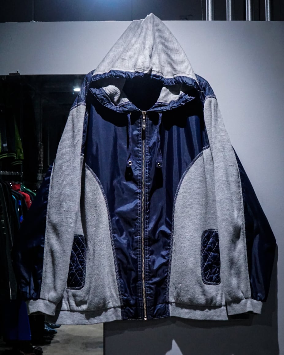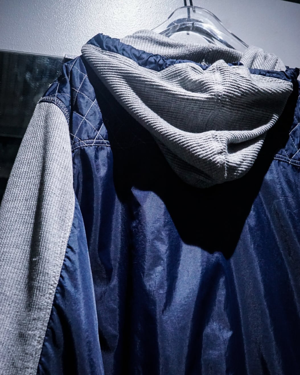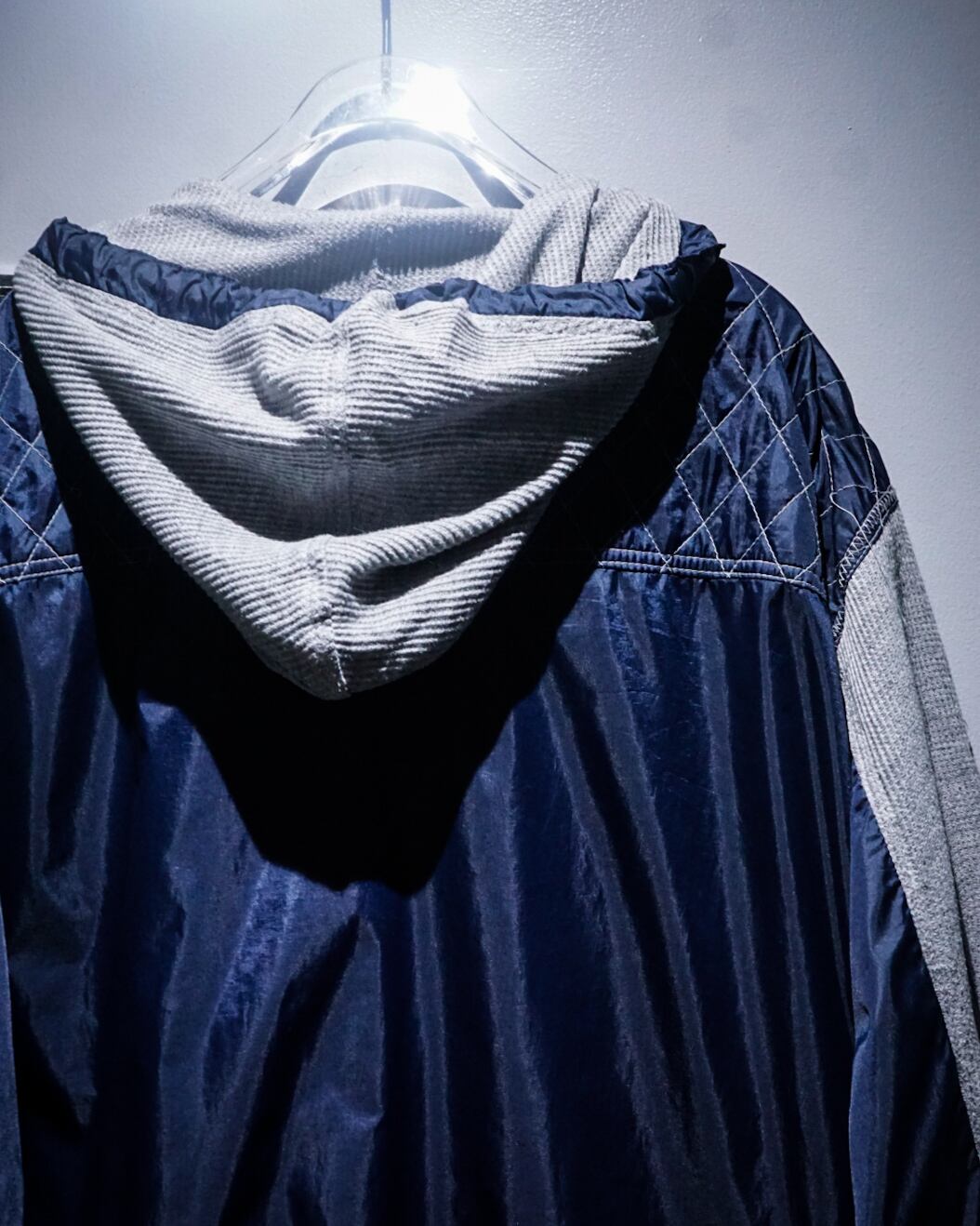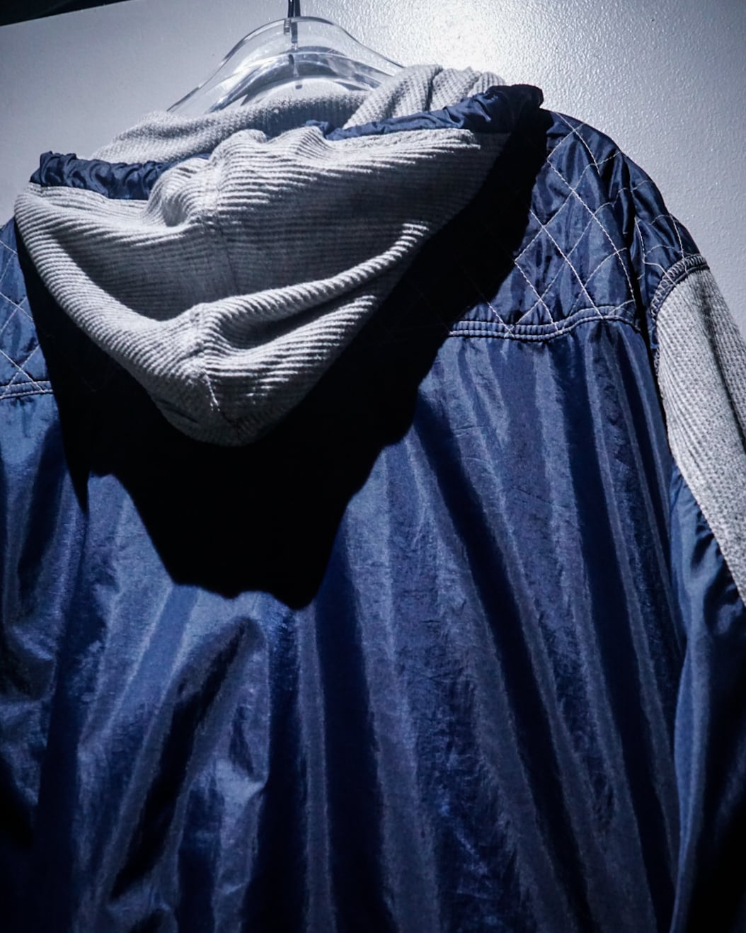 グレーのスウェットボディをベースとしフロントやバック、ポケットなど随所にナイロンを切り替え、異素材使いが目を引くジップフーディの1着。