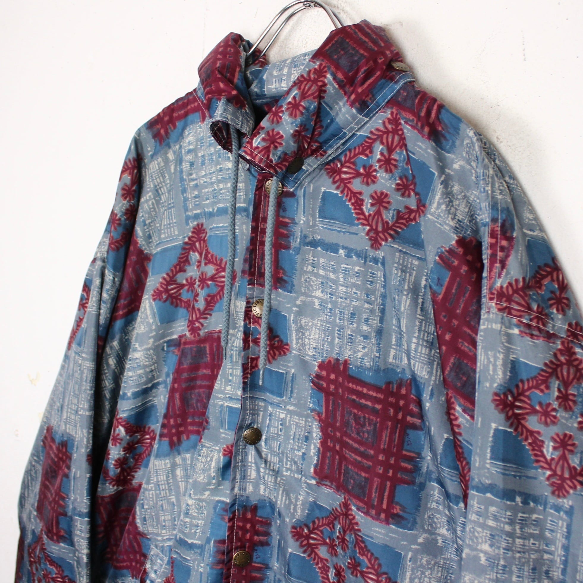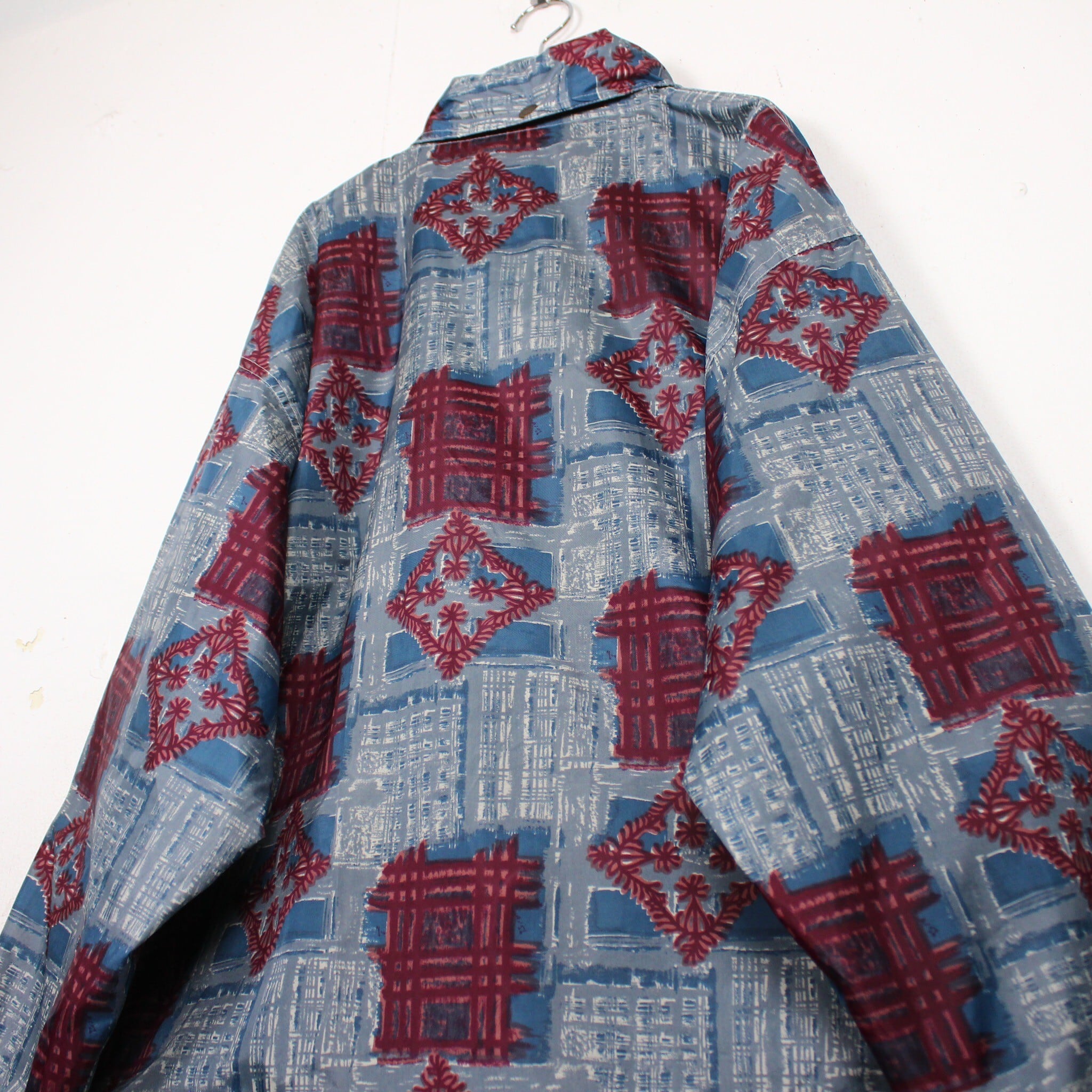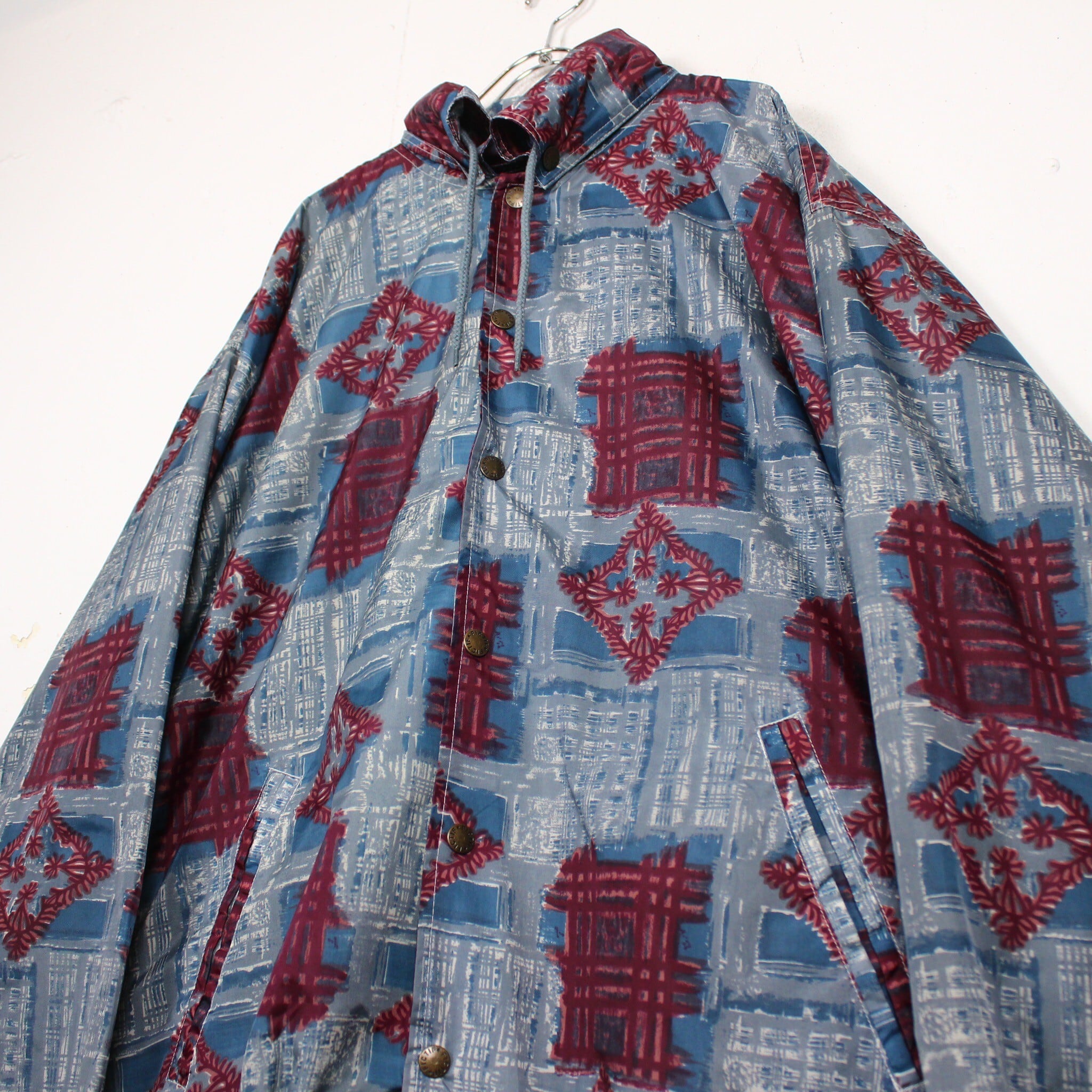ブルーをベースにえんじ色で柄を全面に配したデザインで、お互いの色を際立たせ立体感のあるアーティスティックな柄に仕上げたジャケット。