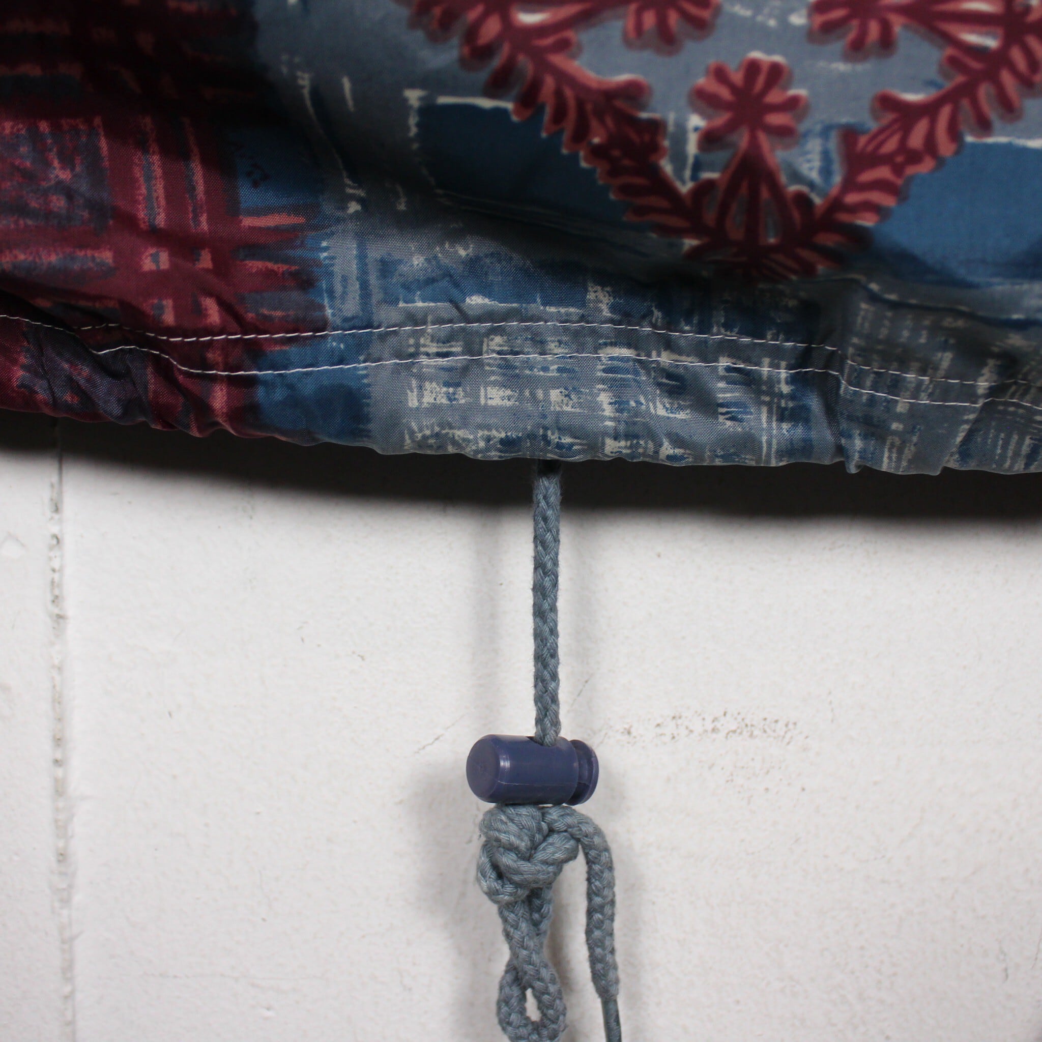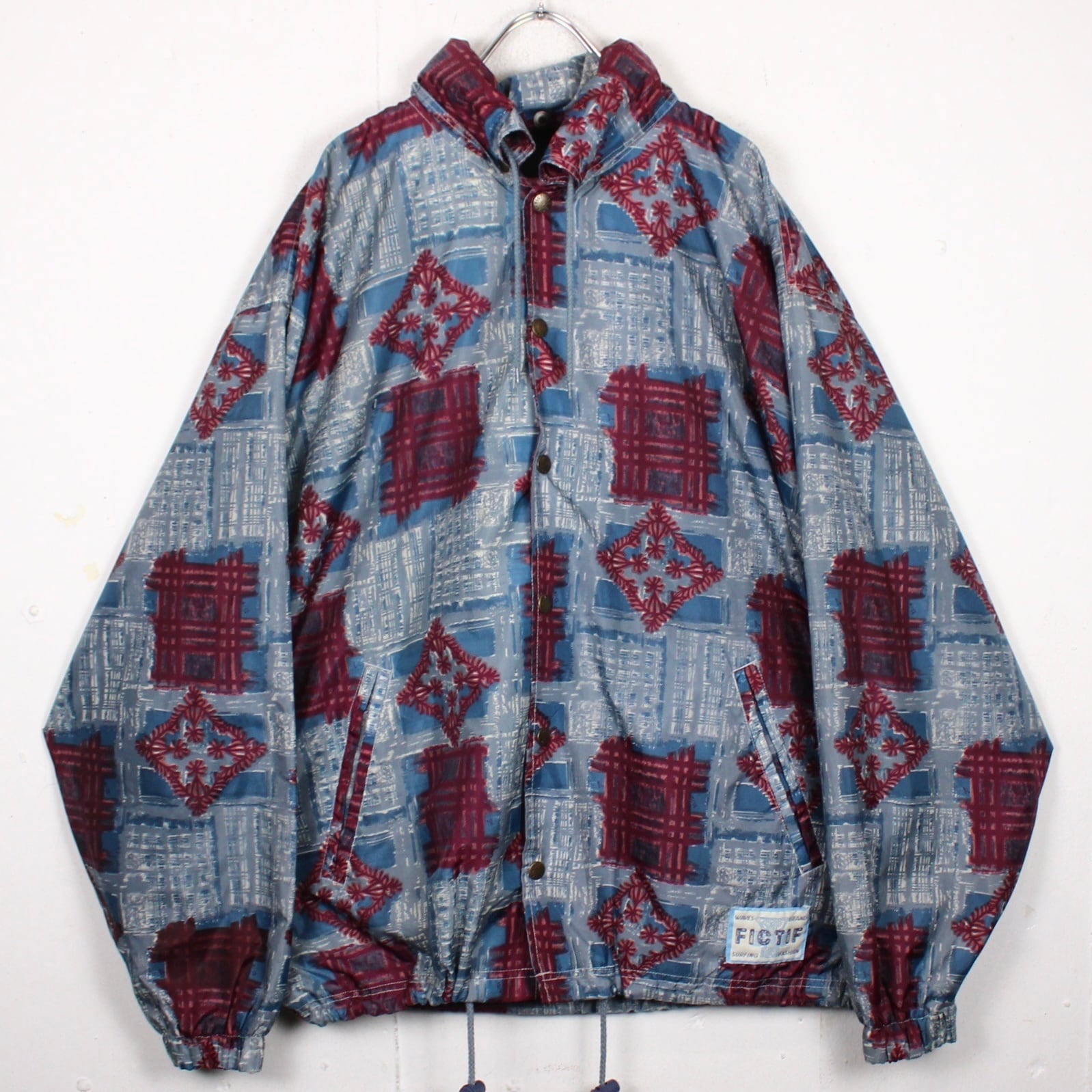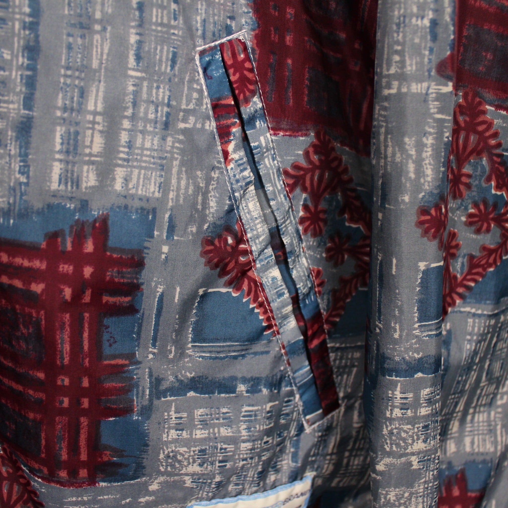 ブルーをベースにえんじ色で柄を全面に配したデザインで、お互いの色を際立たせ立体感のあるアーティスティックな柄に仕上げたジャケット。