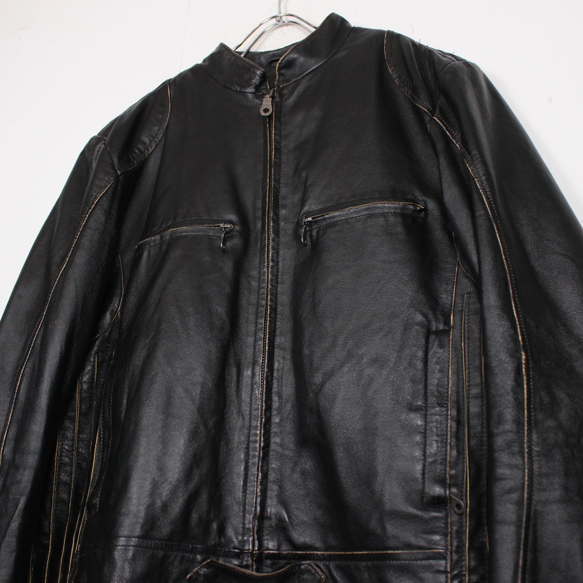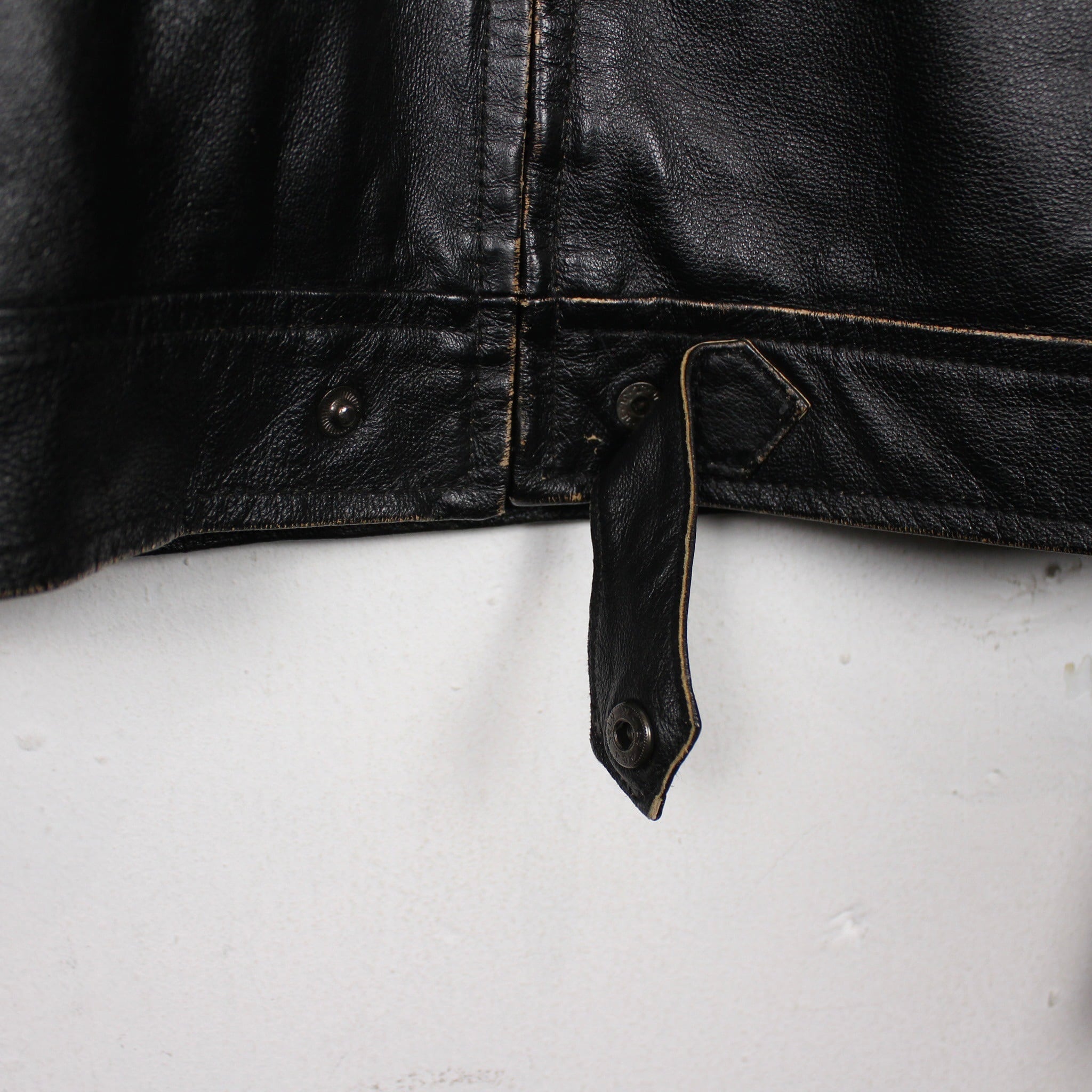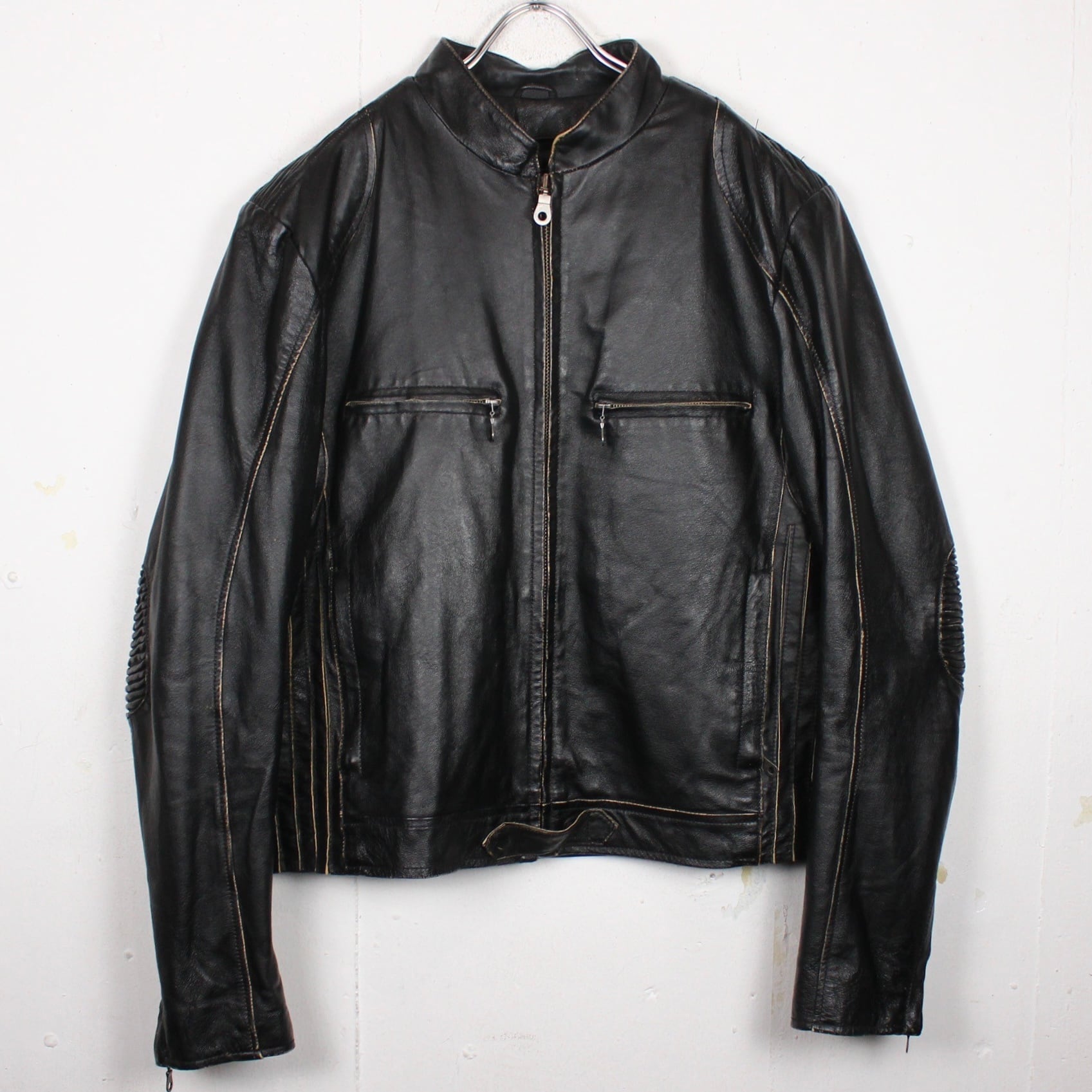 味のある極上ブラックレザーを用い、ギミックによりデザイン性と機能性の双方を持ち合わせた当店が誇るシングルライダースレザージャケット。