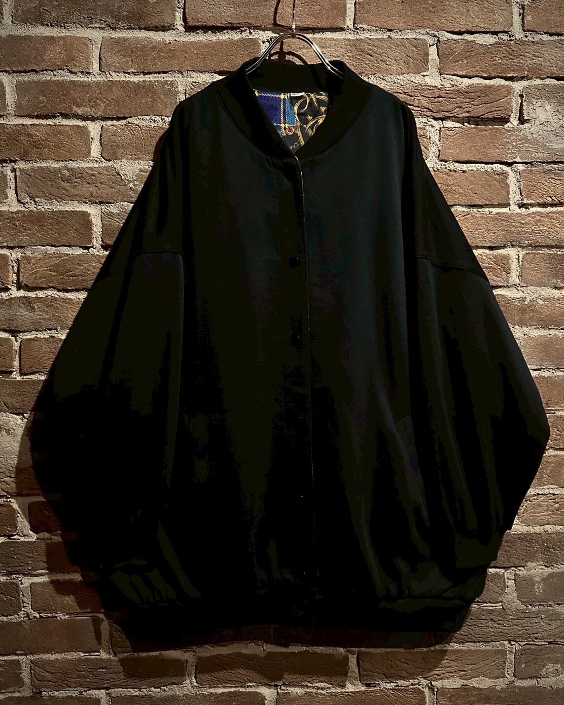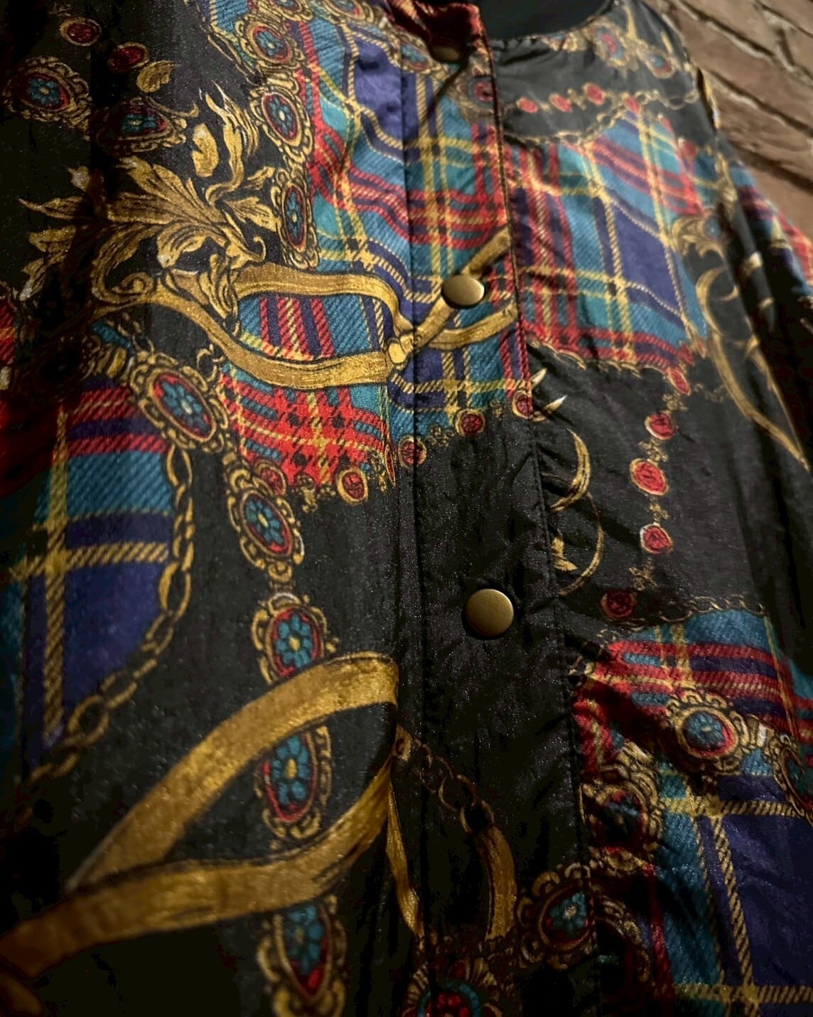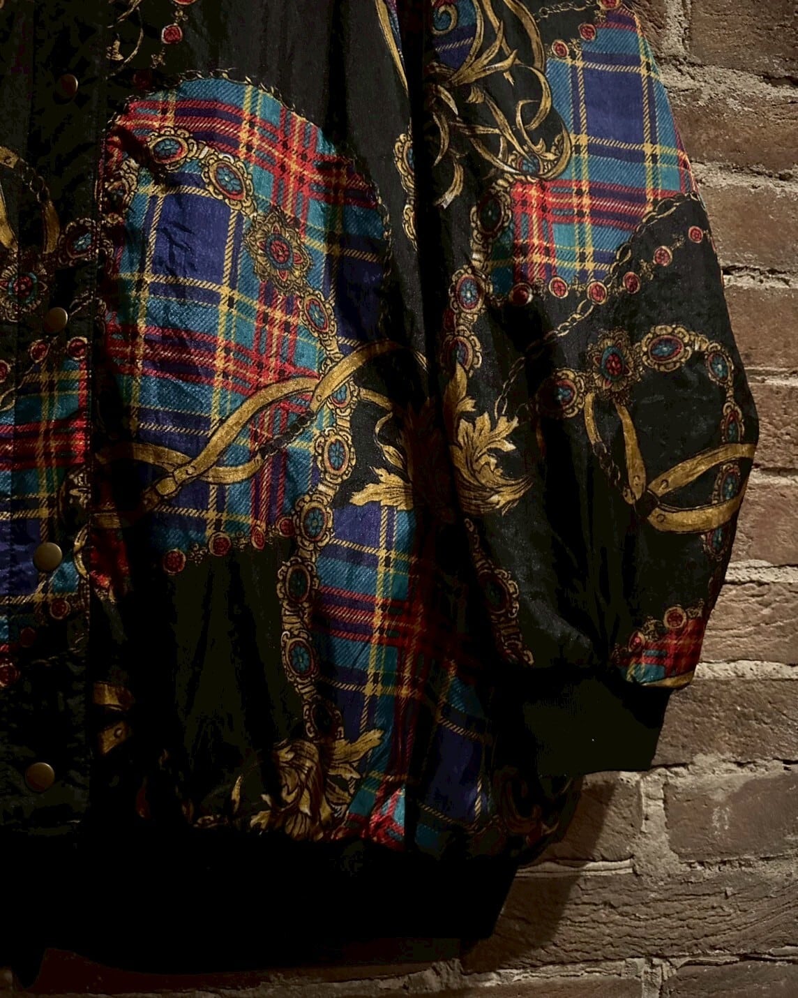 表面はラグジュアリーなスカーフ柄とレトロなチェック柄を掛け合わせた美しい表情を魅せ、裏返すとハリのあるオールブラックのボディに早変わりする、リバーシブル仕様のボンバージャケット。