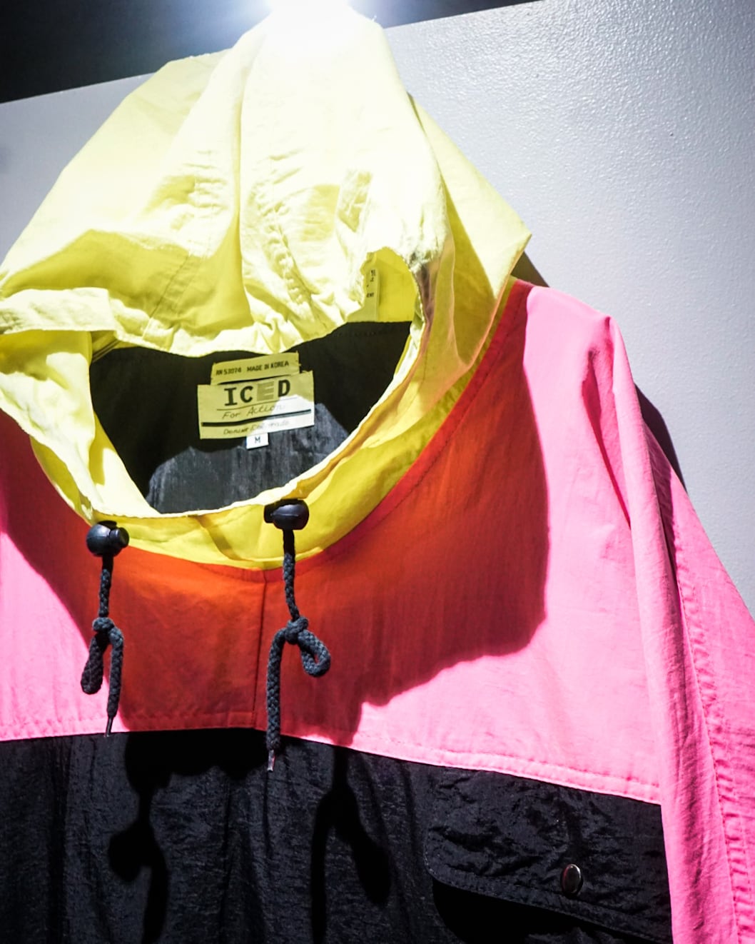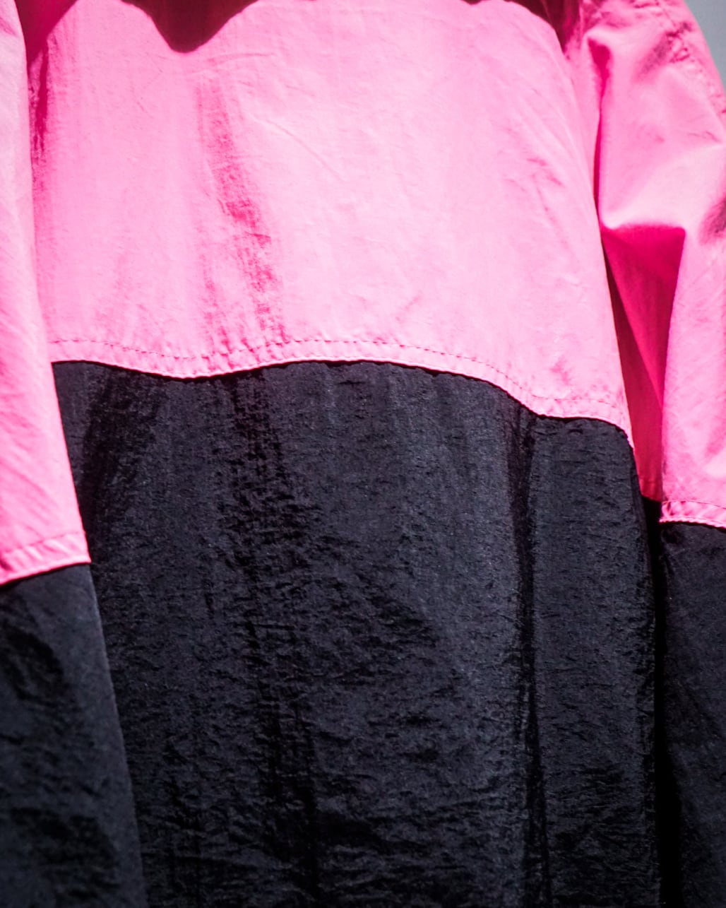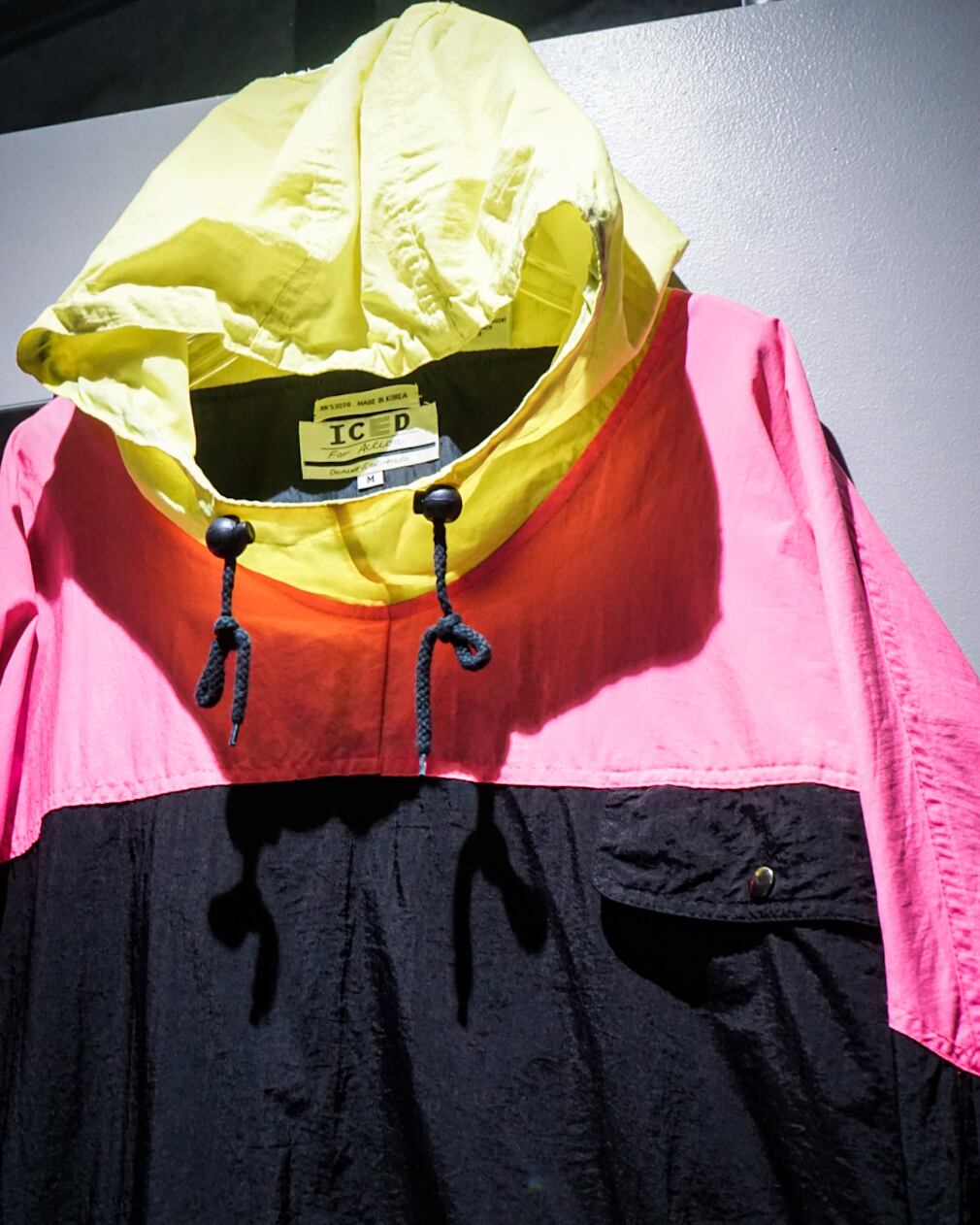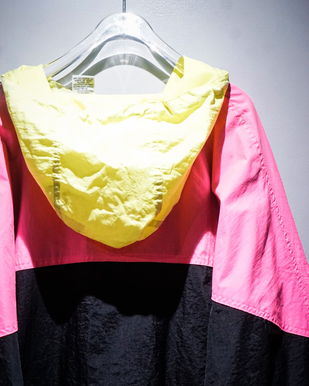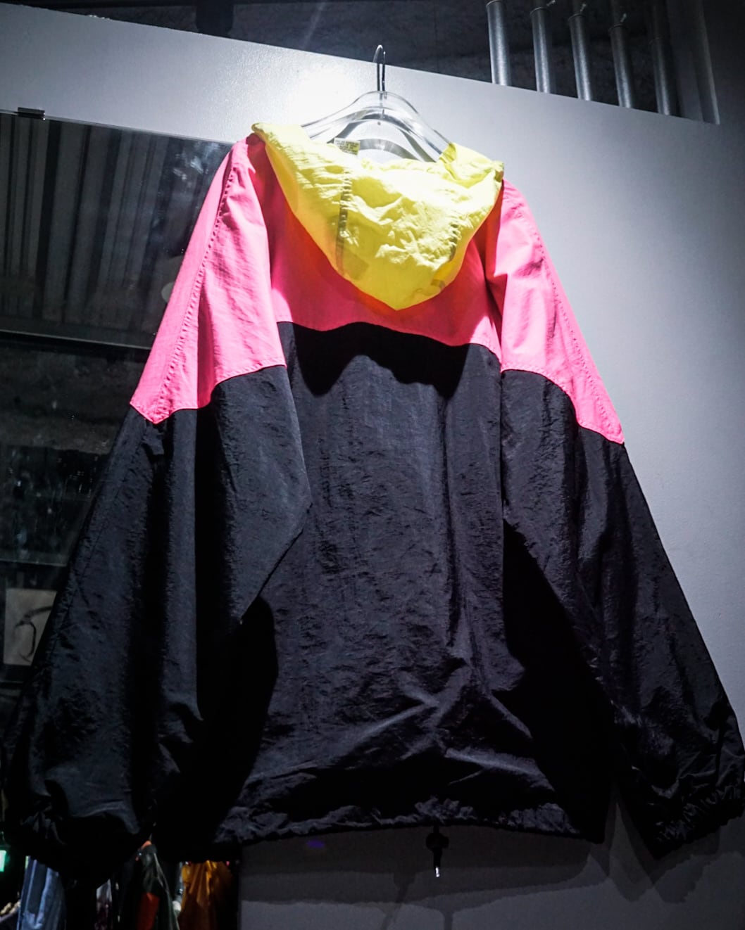 シャリ感のあるナイロンを用いて、フーディをインナーに仕込んだ様な、レイヤード風のデザインに仕上げたプルオーバーフーディ。