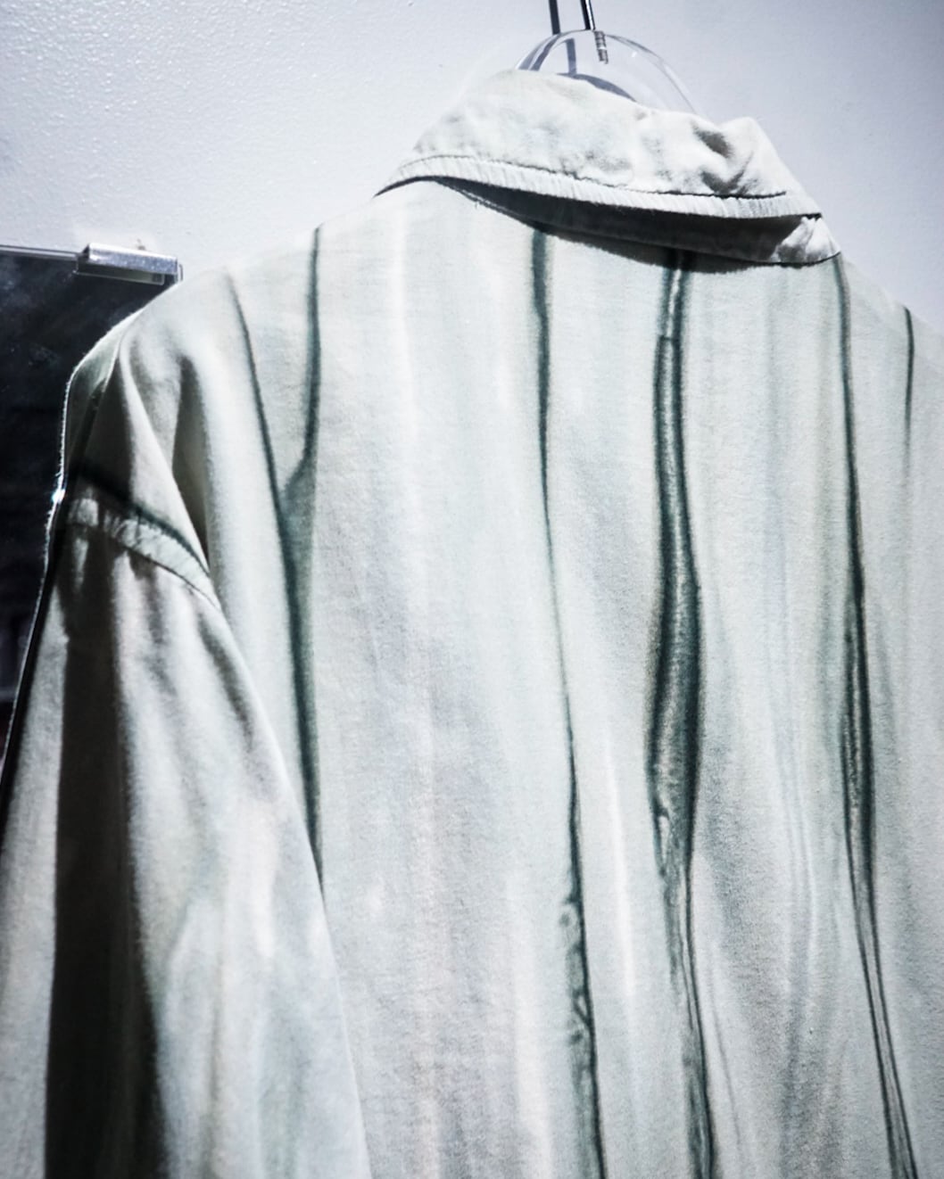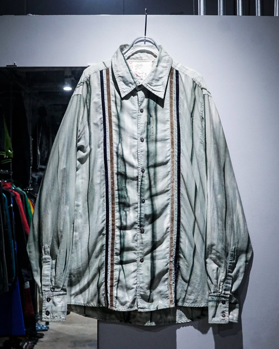 ライトグレーのボディをベースに、染め風のデザイン、ベロアのテープでストライプを表現した長袖シャツ。