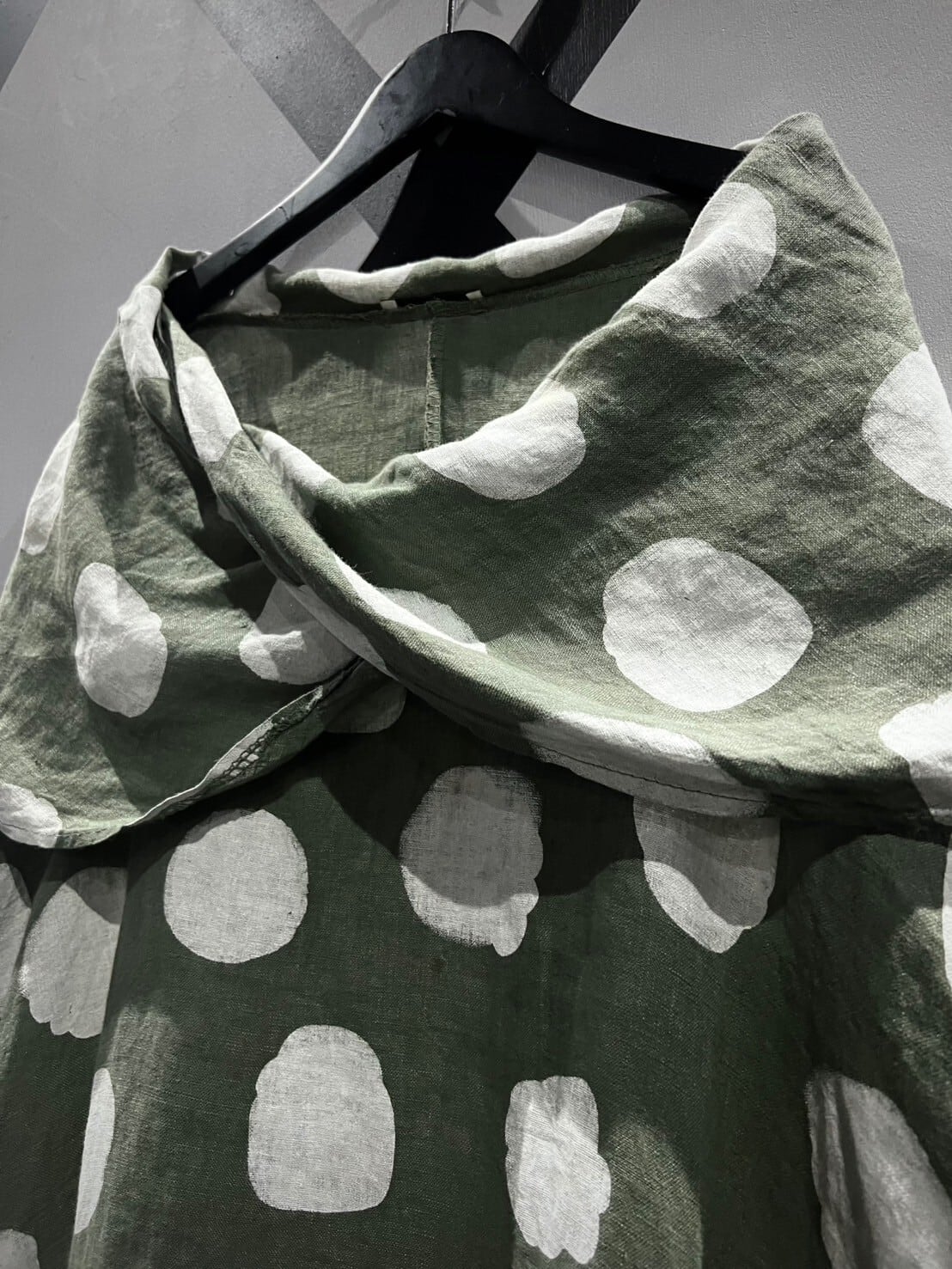 カーキのボディをベースに、ボディ全体に白色のドットを散りばめた、イタリーメイドのリネンプルオーバー。