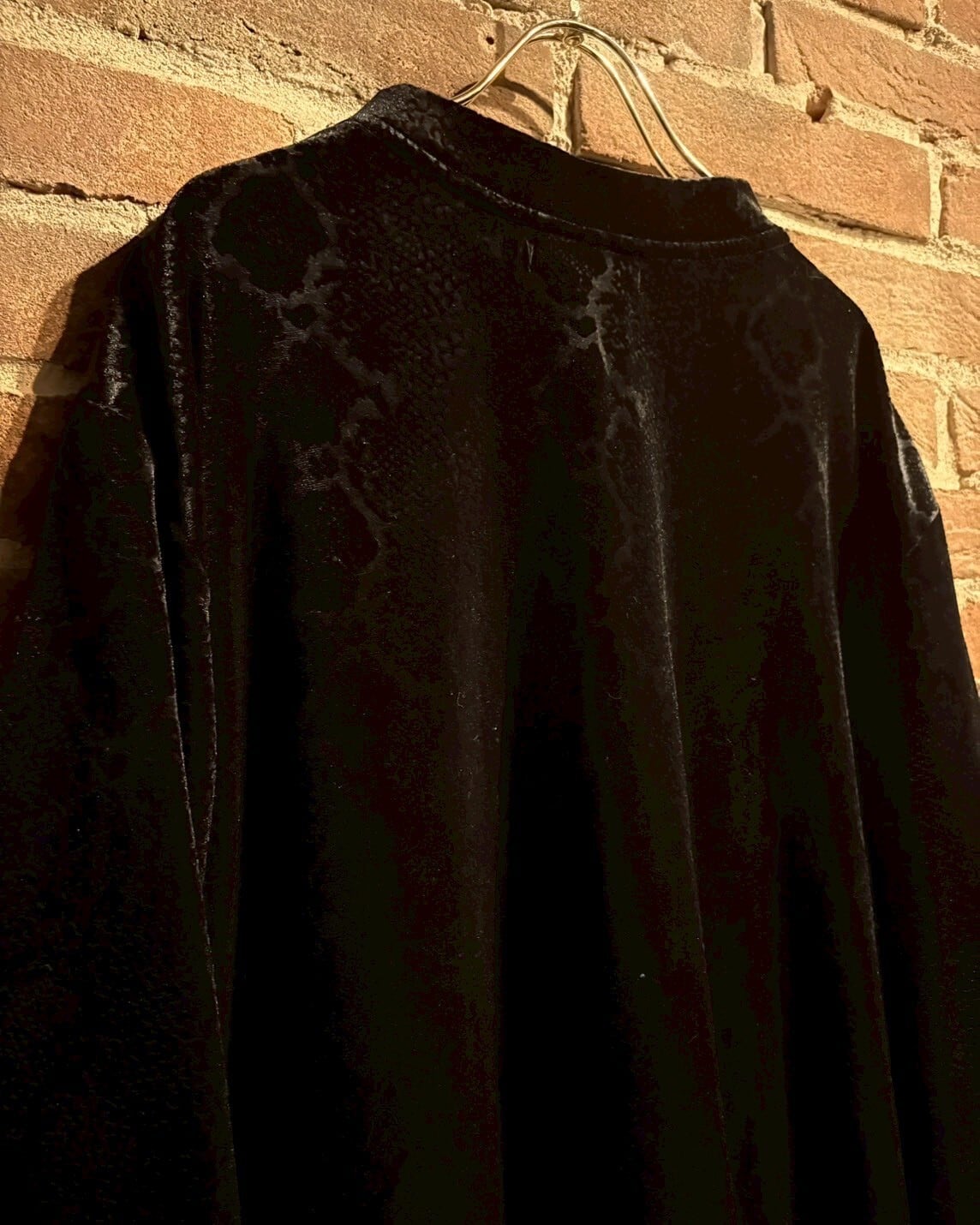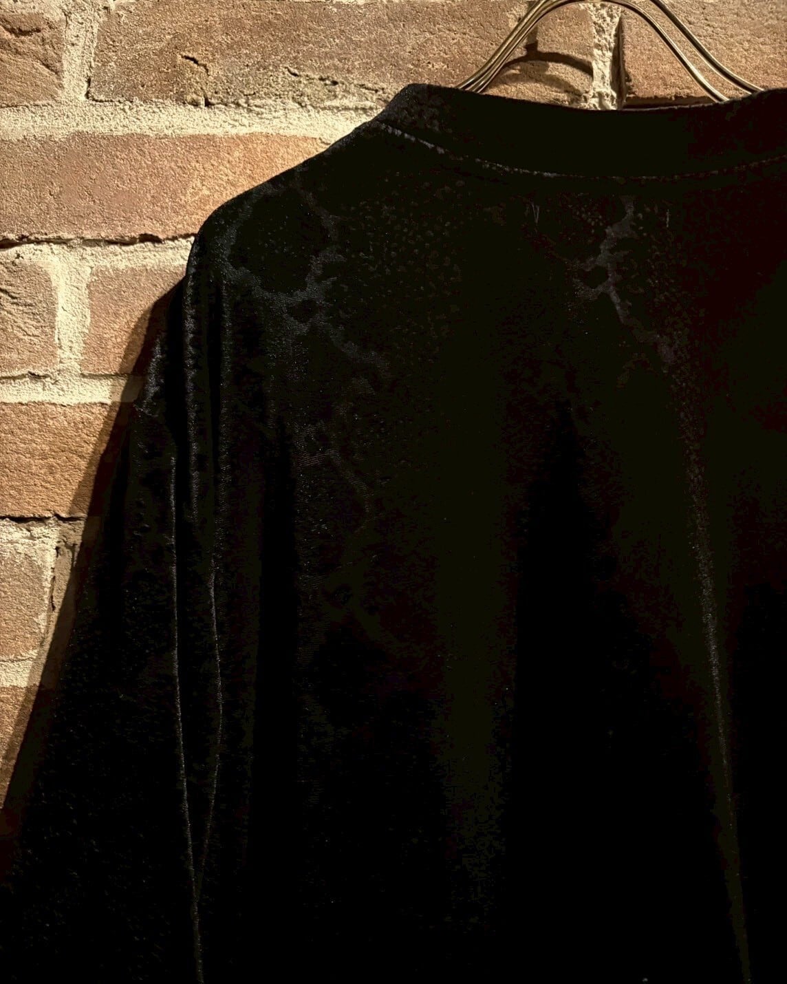 パイソン柄は光のあたり加減で浮き出るように見え、ベロアの光沢と相まってオールブラックながら存在感を抜群に放つ1着に。